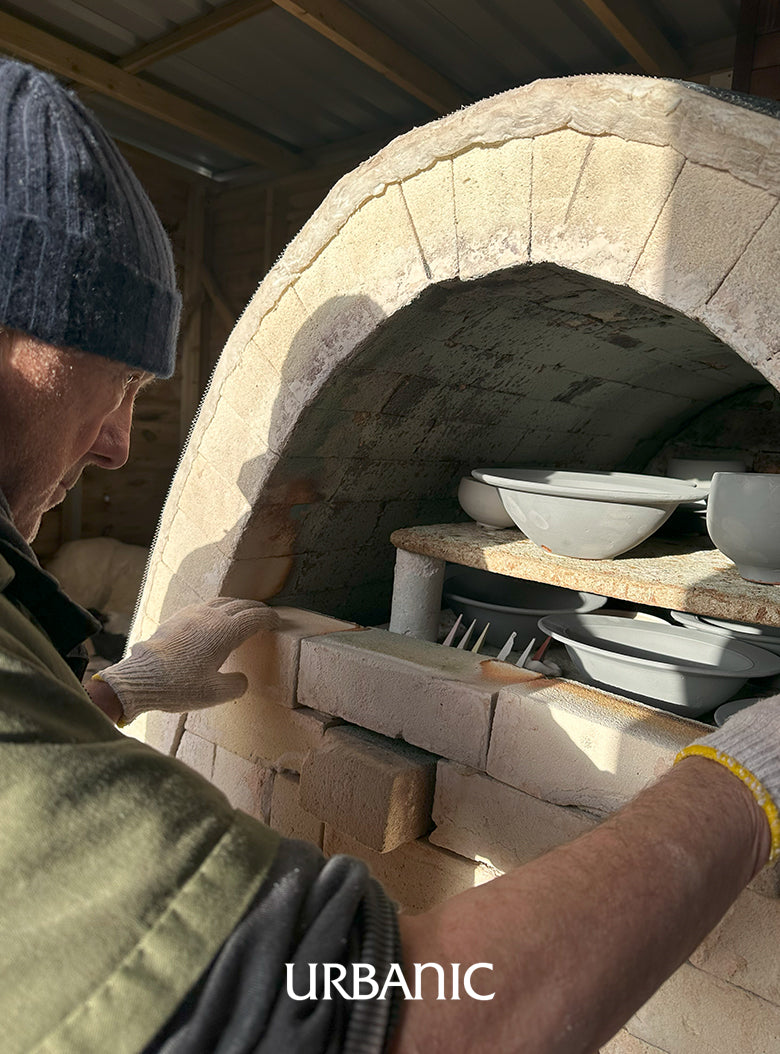 I fire my ceramics only once, using an intense 1,270°C heat that requires careful control. Spraying the soda and water mixture at the peak of firing determines the final surface and color. Each piece must be delicately positioned on three small clay supports inside the kiln, and the process takes 15 to 16 hours of manual supervision. Opening the kiln to see the results is always an exhilarating moment.