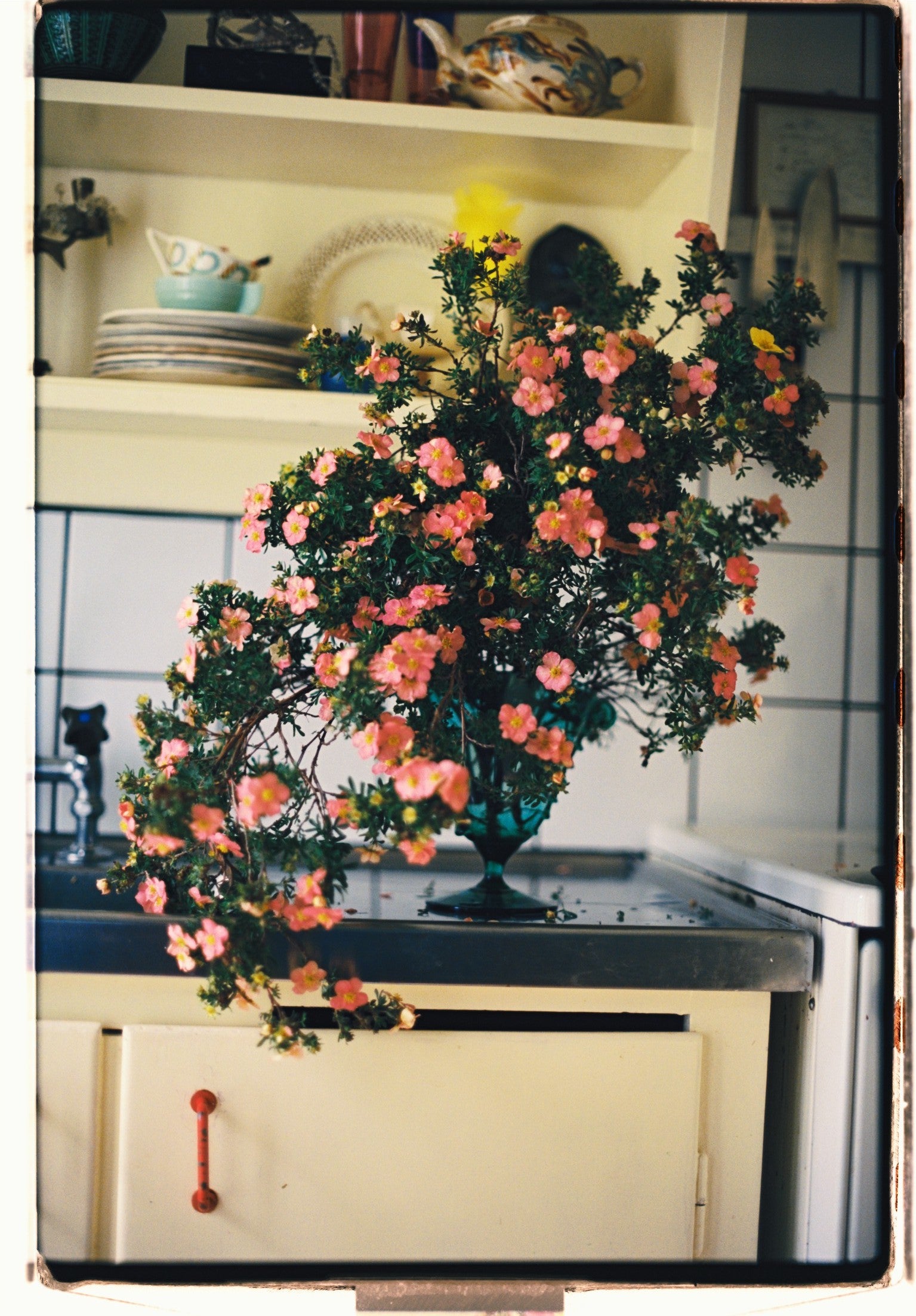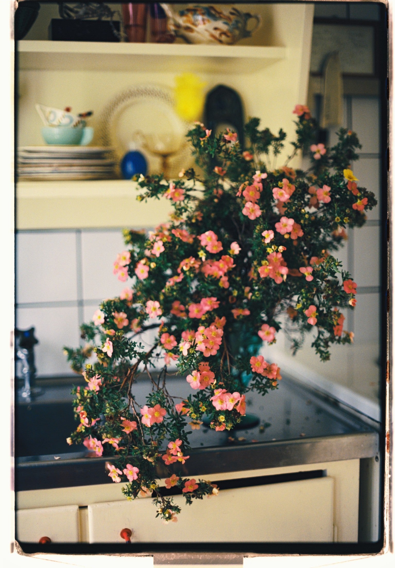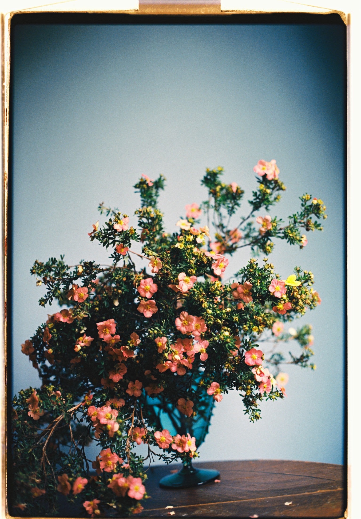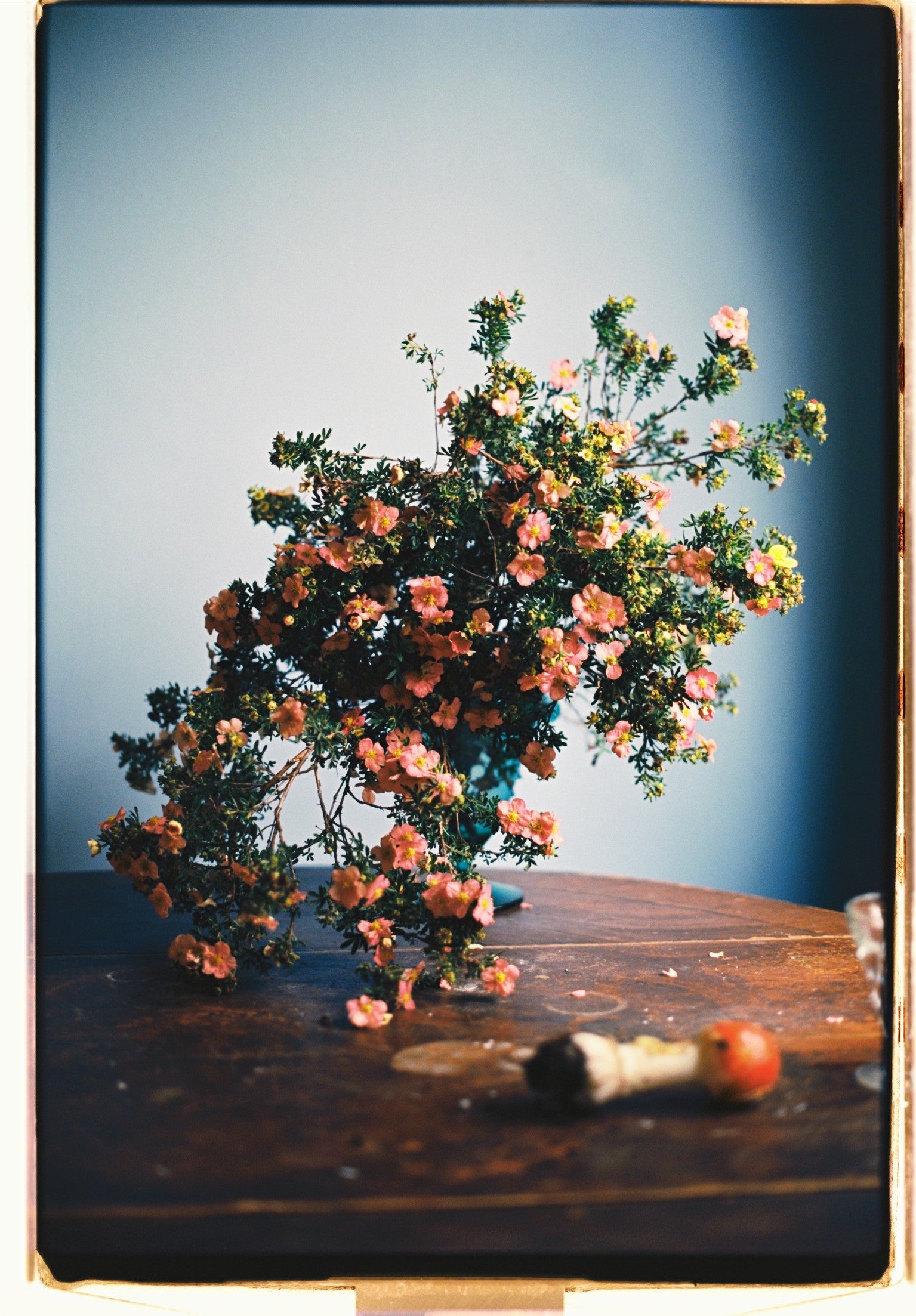 C: It's actually a flower that I used not to enjoy too much. It’s called a Shrubby Cinquefoil and it would always be this flower growing as the only green thing on parking lots and boring public places. I recently moved to Stockholm and never before have I seen it as a cut flower. When cut, it almost looks like cherry blossoms or small delicate bush roses. And they are in season. I chose them because i suddenly found them very modest and sweet. They're easy to make look very extravagant. I really enjoyed them and I think you should too.