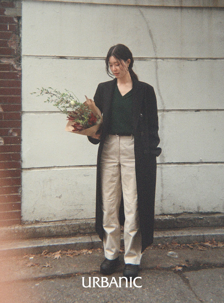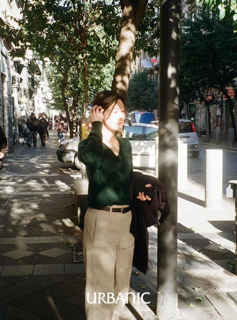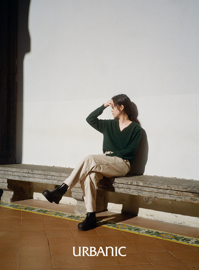 Jooyoung Choi values timeless, meaningful objects over following fleeting trends. Through her curated shop, OCHIV, she introduces handcrafted items and artworks from old European ateliers to Seoul. She, who prefers wearing simple, low-saturation clothes, styled herself in a deep green Boutique Cashmere V-neck Knit and Vibram Chelsea Boots before stepping in front of the camera.