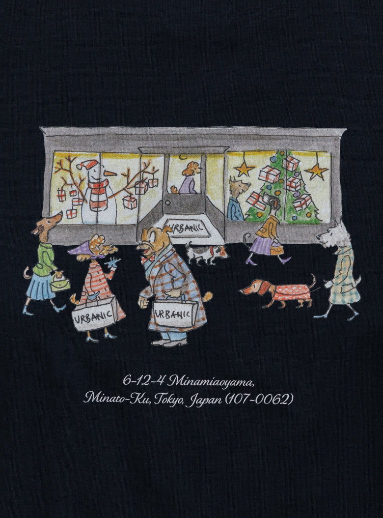 The 25 Holiday Long Sleeve (Aoyama) features a warm, festive illustration of our Tokyo Aoyama store and its little dog friends.