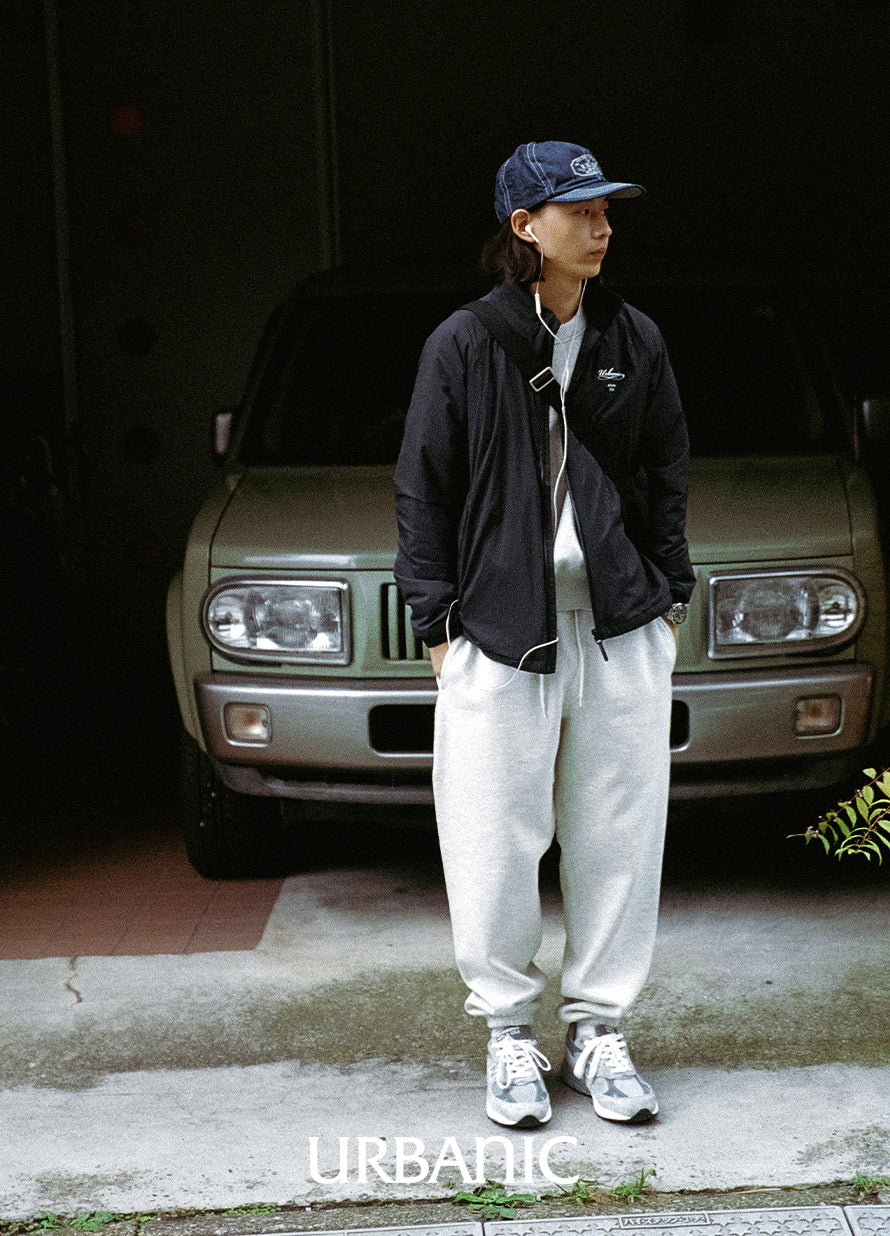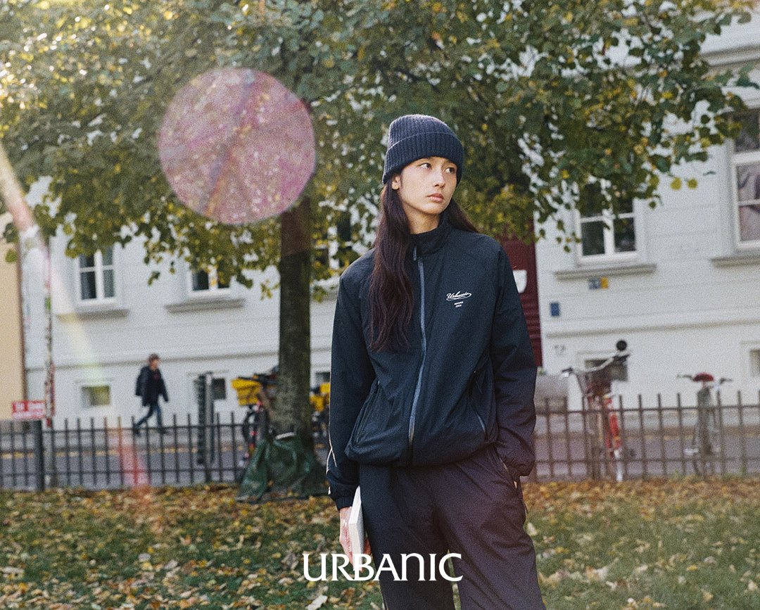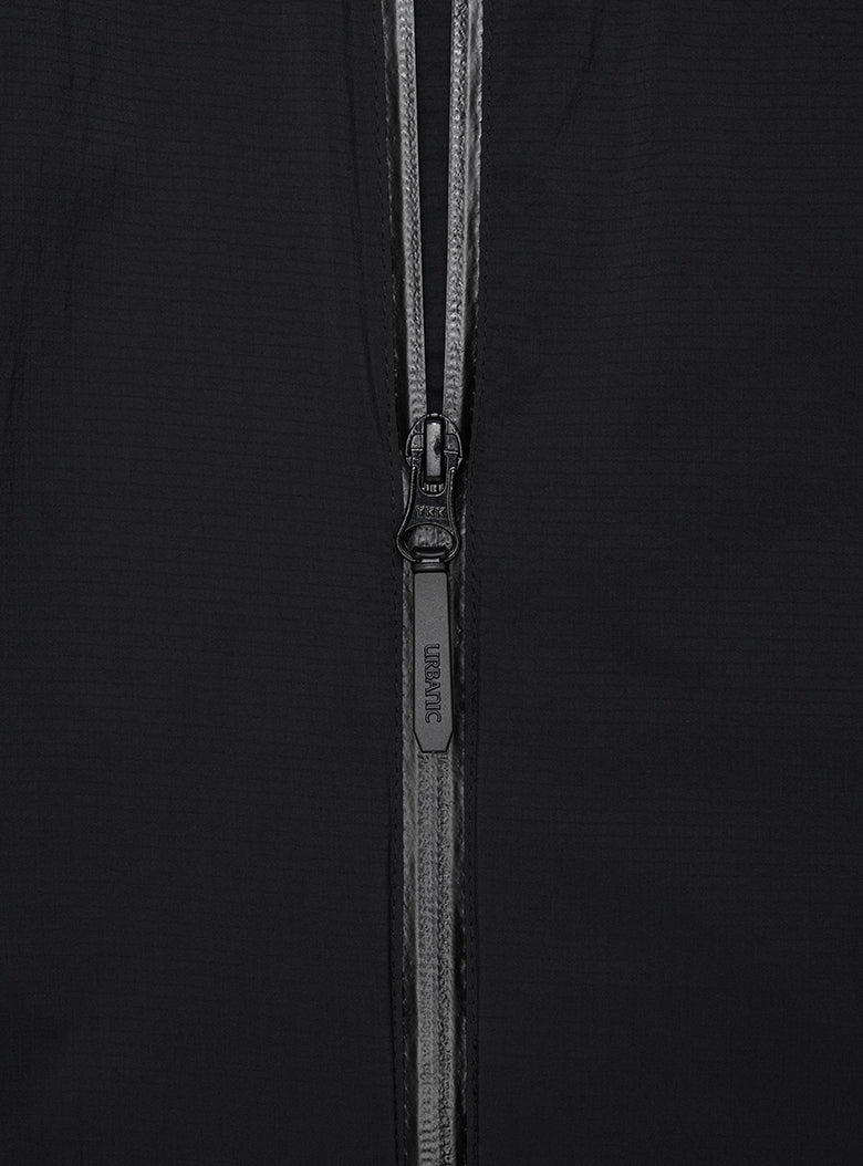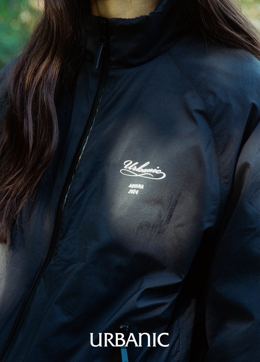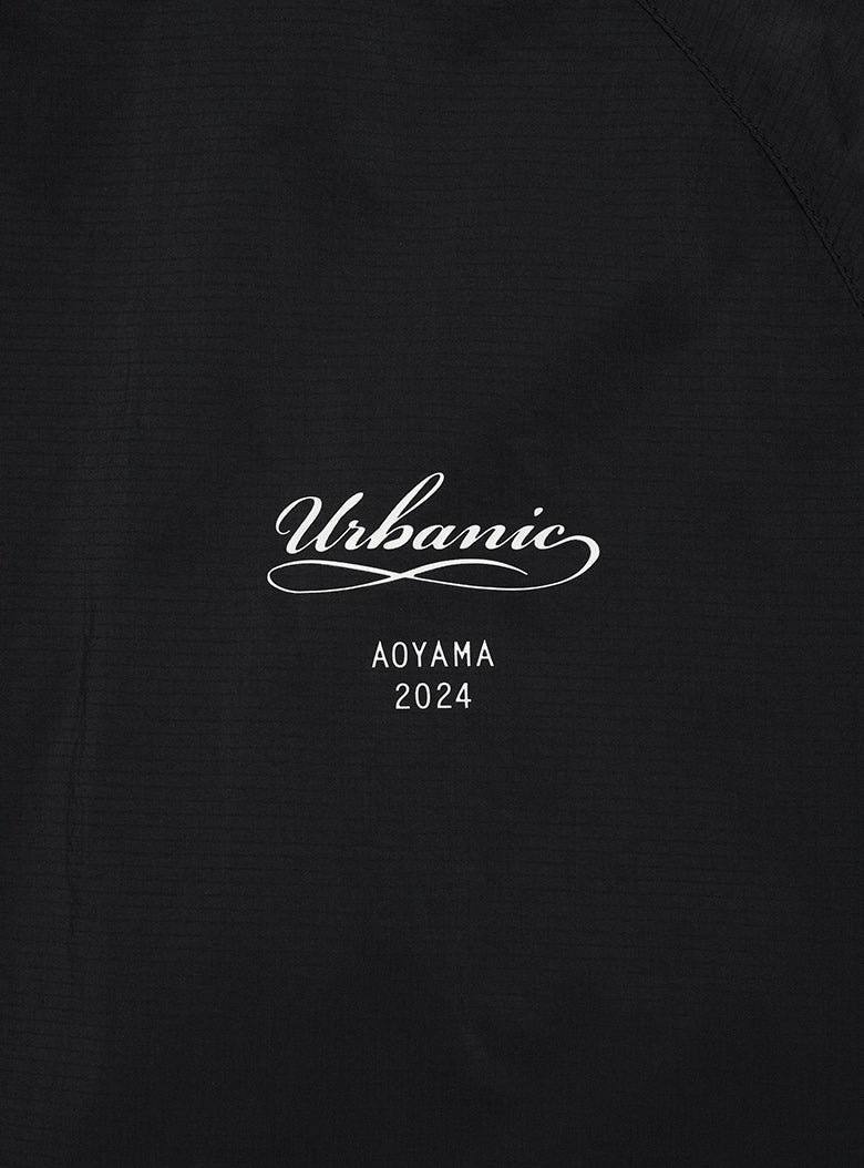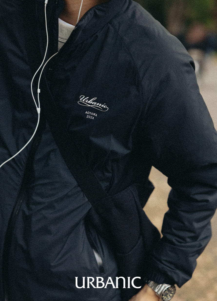 The "Aoyama LT Jacket" is a sophisticated reinterpretation of functional sportswear, styled for everyday wear. It is made from ripstop nylon fabric with a subtle grid pattern, while the neckline and pocket linings are wrapped in soft, cozy polyester fleece.