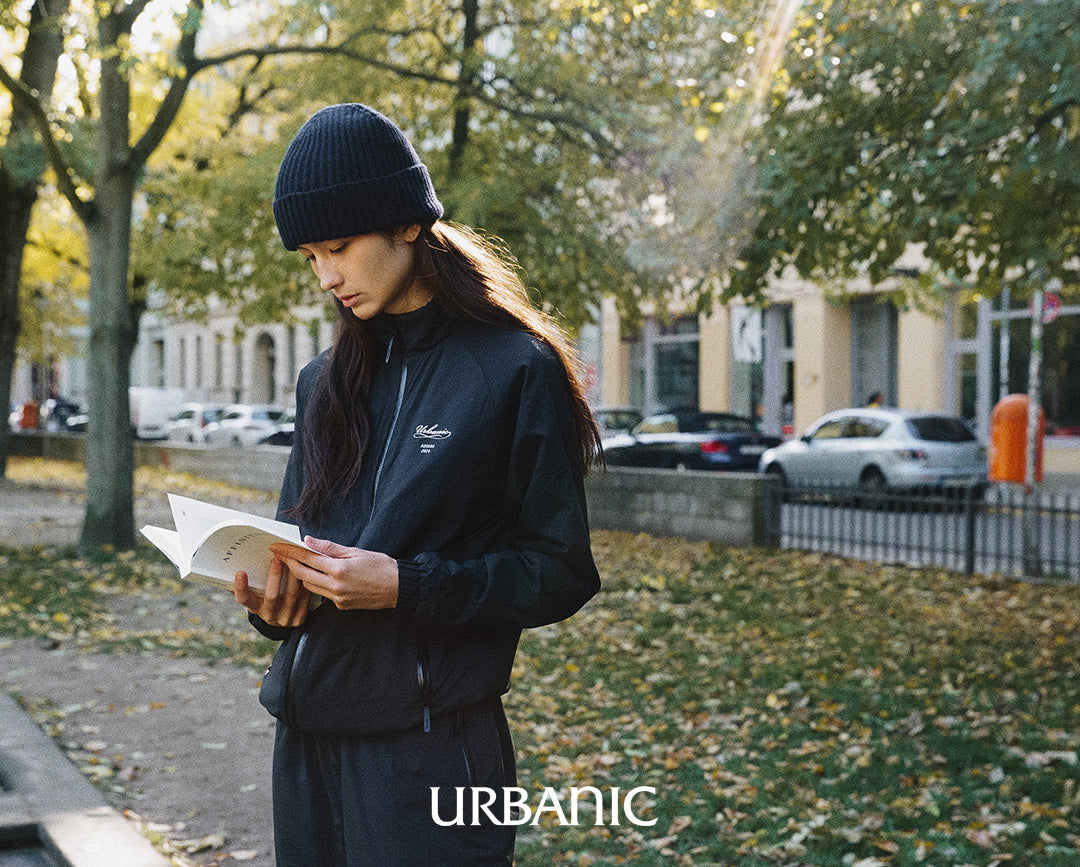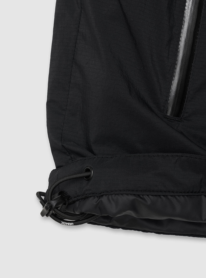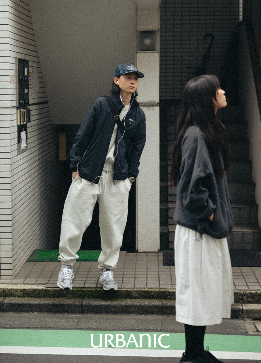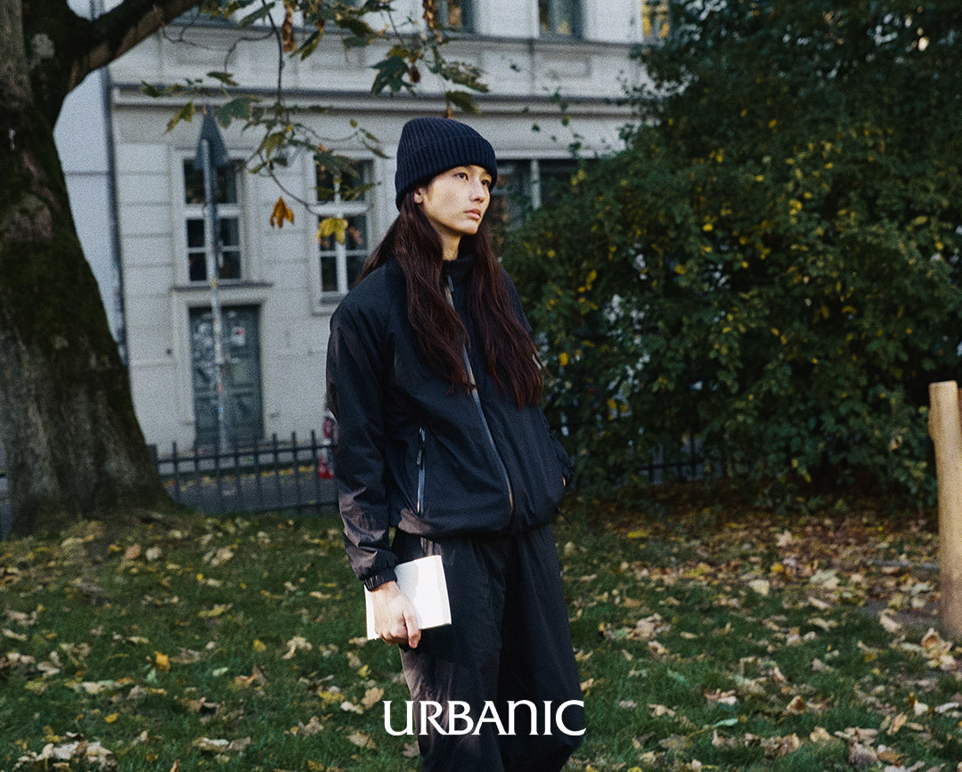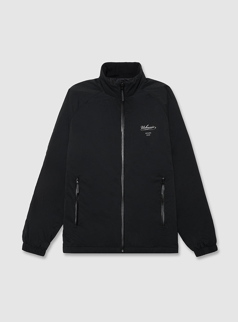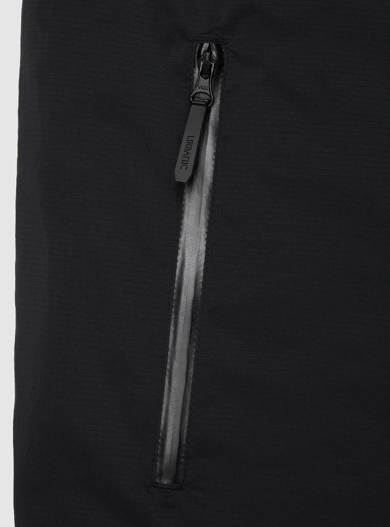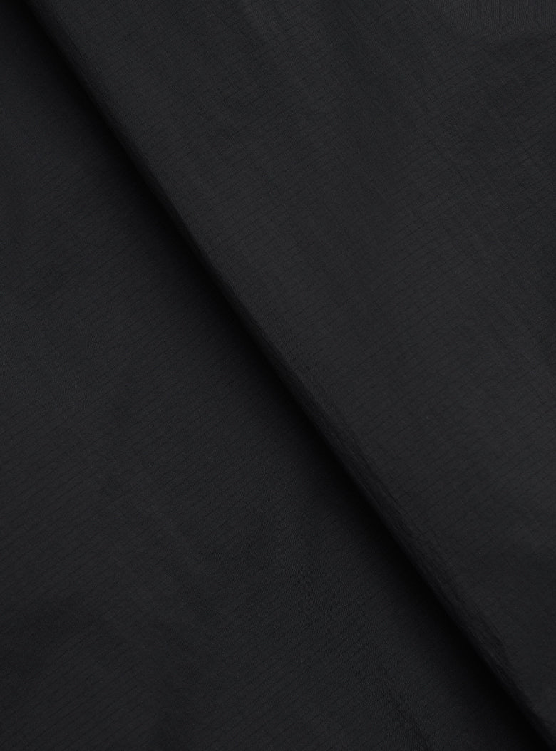 The "Aoyama LT Jacket" is a sophisticated reinterpretation of functional sportswear, styled for everyday wear. It is made from ripstop nylon fabric with a subtle grid pattern, while the neckline and pocket linings are wrapped in soft, cozy polyester fleece.