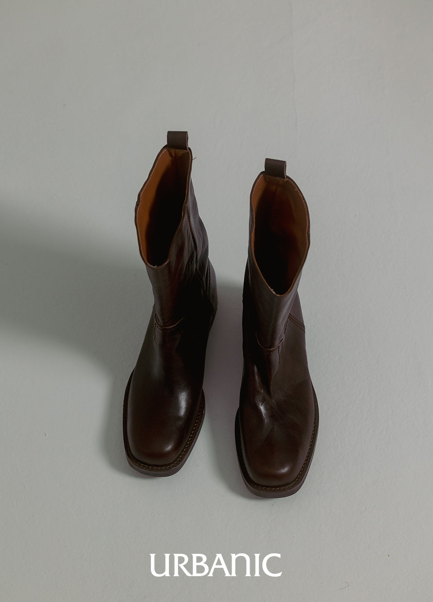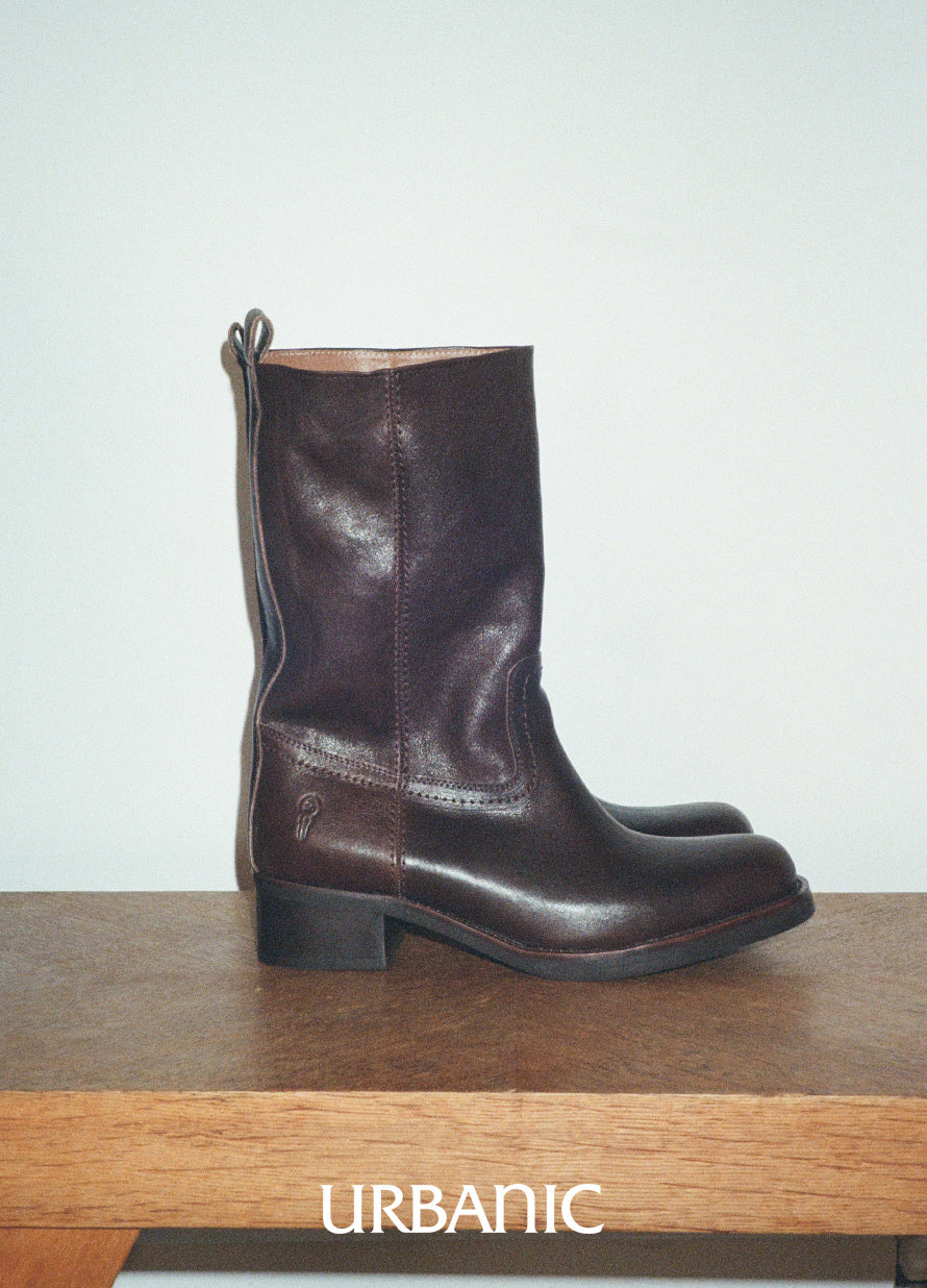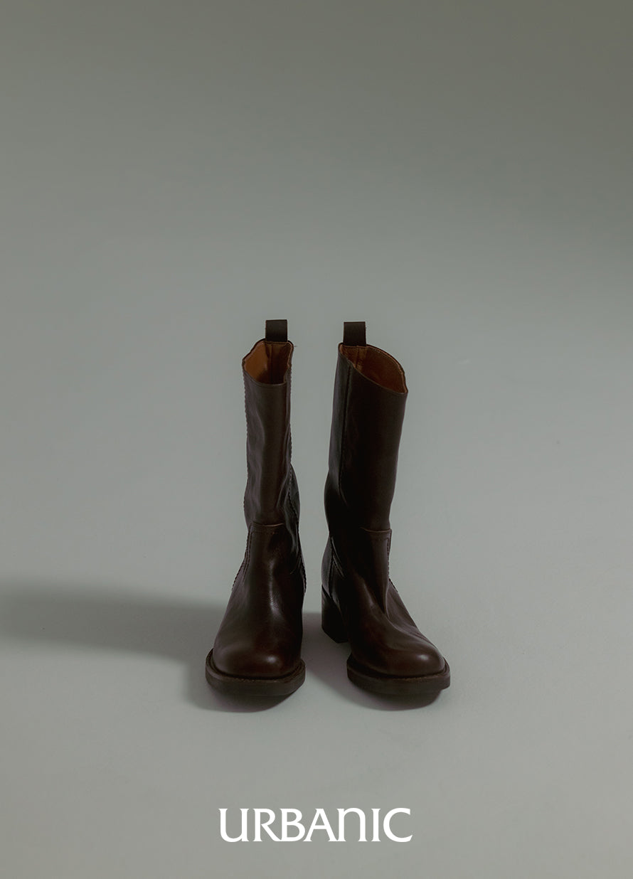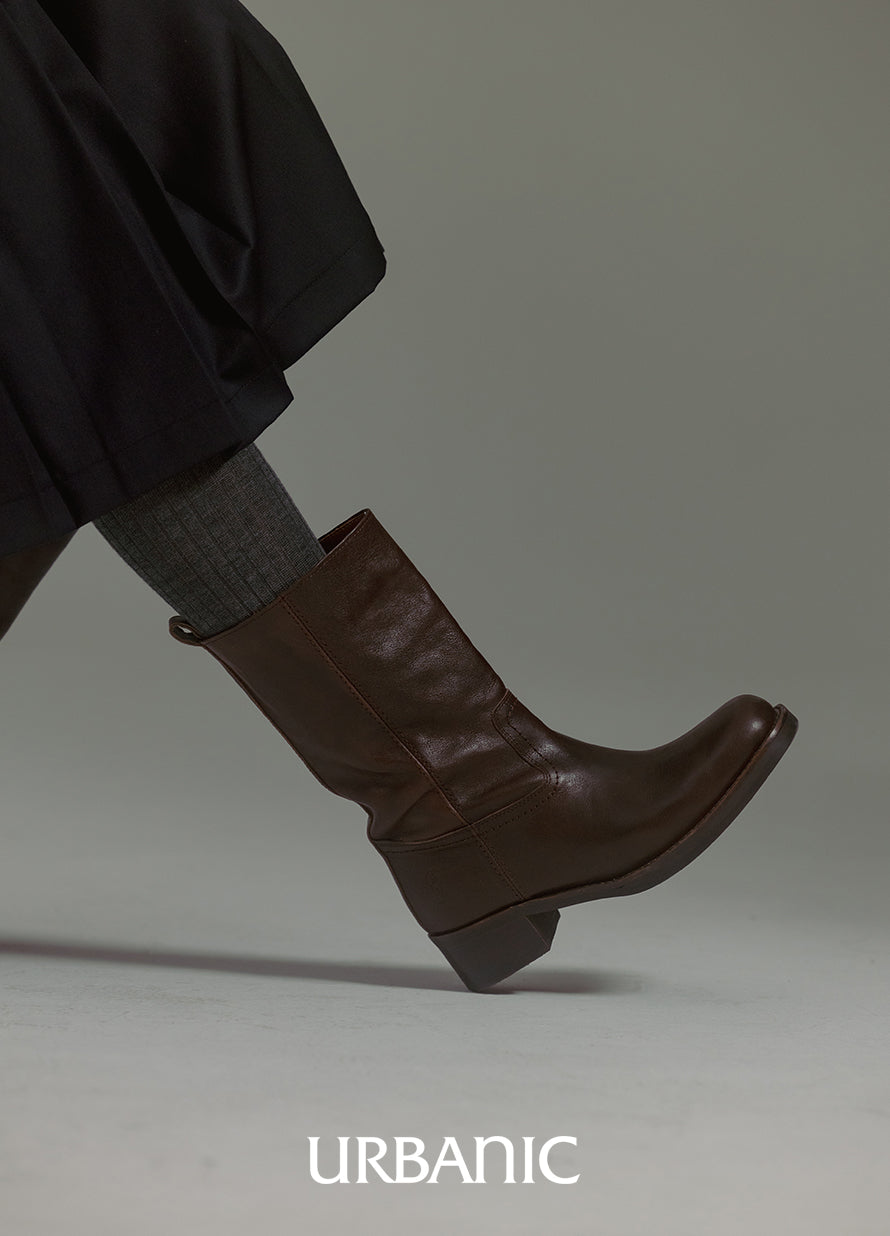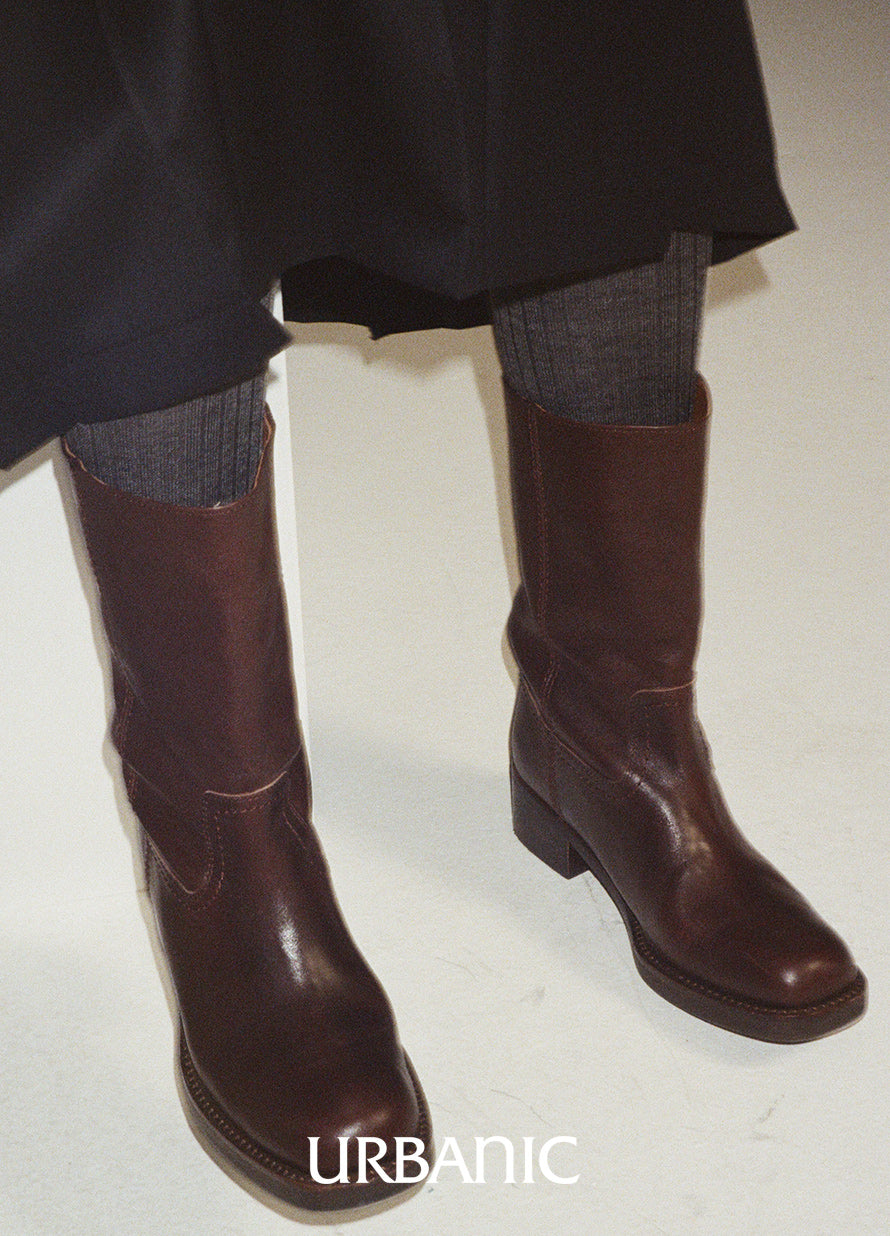These are biker boots with a standout two-tone color scheme and a square shape. Both the outer and inner linings are made of cowhide leather for durability, and they feature a 4 cm heel.