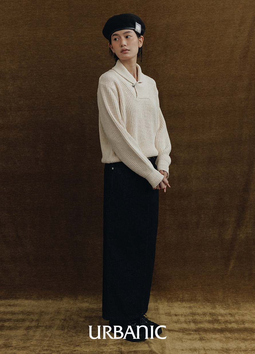 The Bronco Knit highlights the understated, classic charm of a sweater with its shawl collar that gently wraps around the neck.