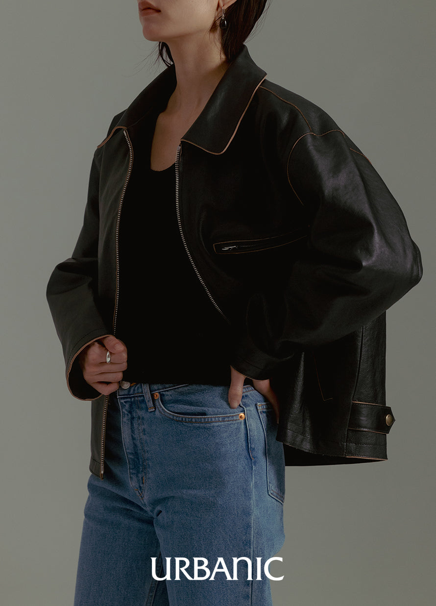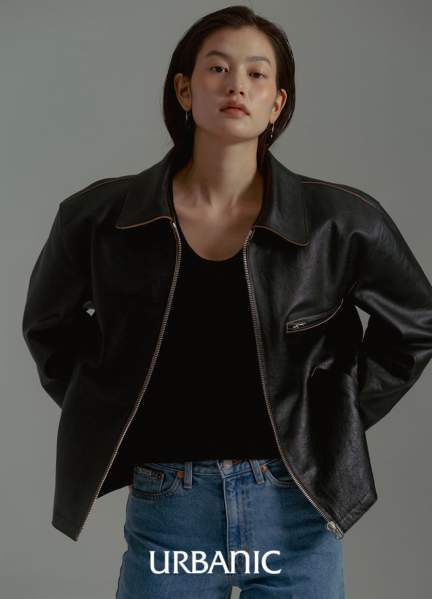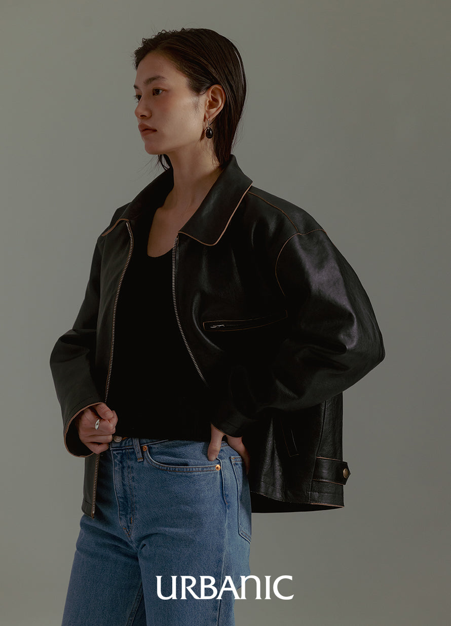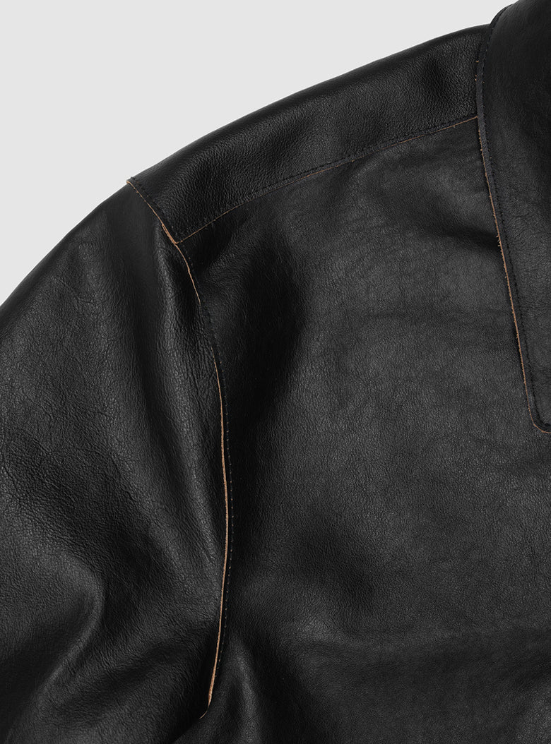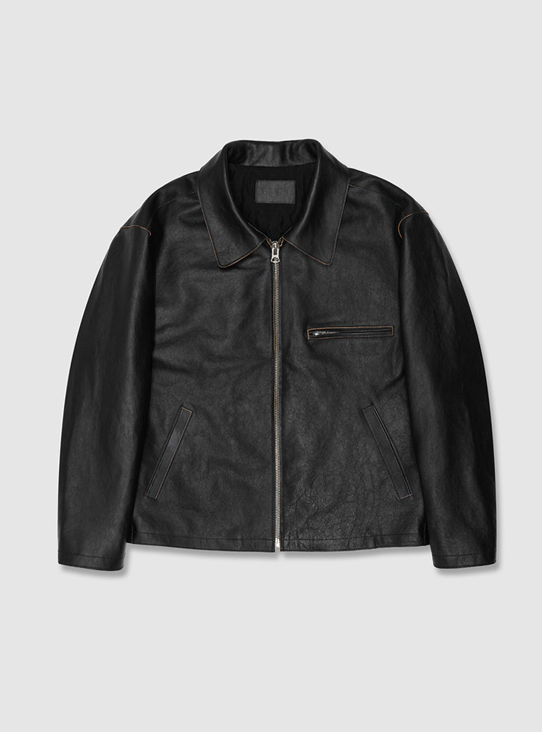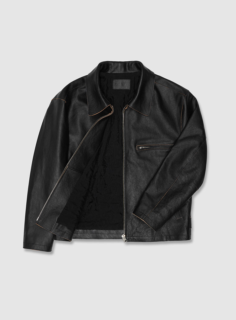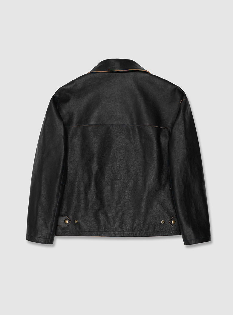 This is a leather jacket made from buffalo leather with a boxy fit. The design highlights a simple yet meticulous attention to detail, with the raw edges left exposed for a distinctive look.