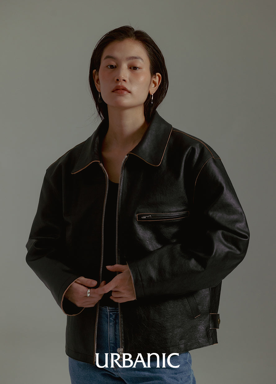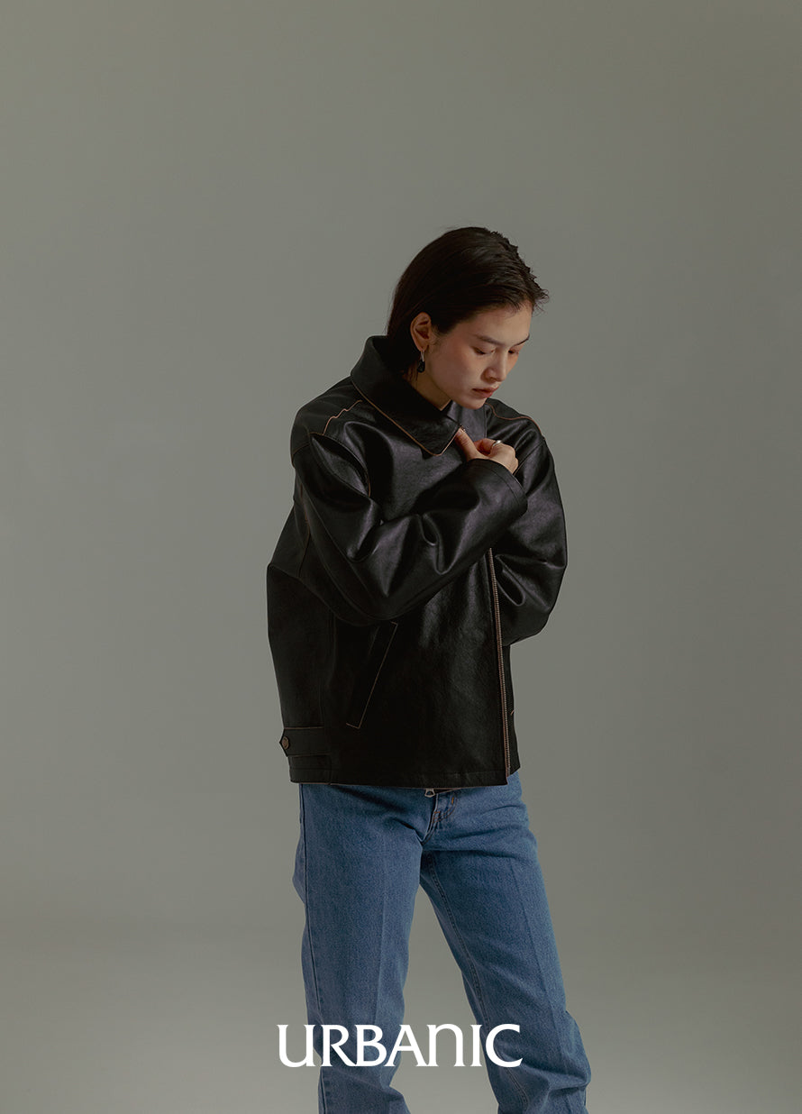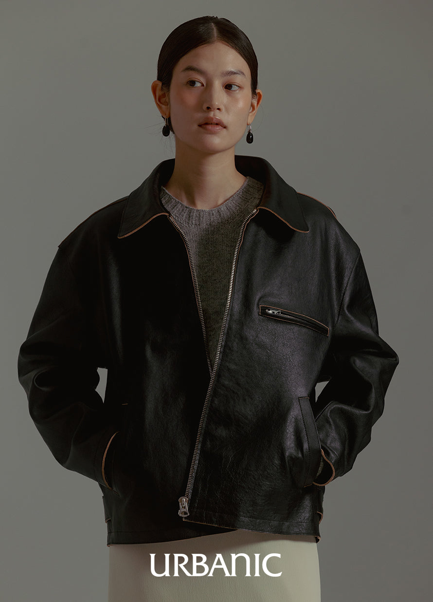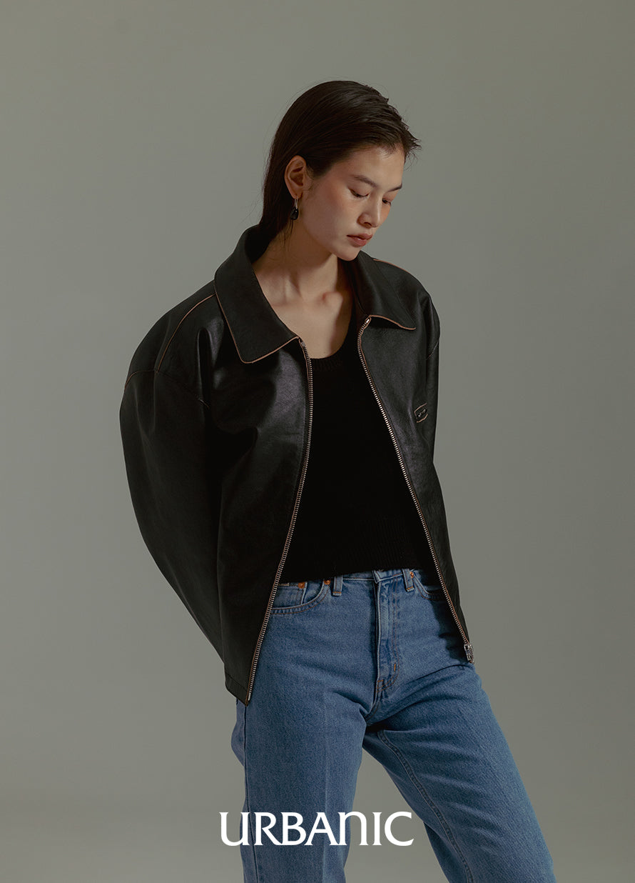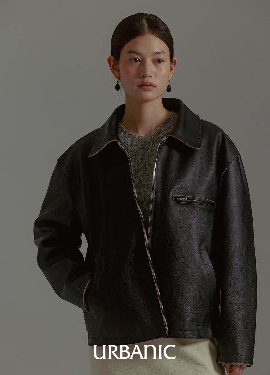 This is a leather jacket made from buffalo leather with a boxy fit. The design highlights a simple yet meticulous attention to detail, with the raw edges left exposed for a distinctive look.
