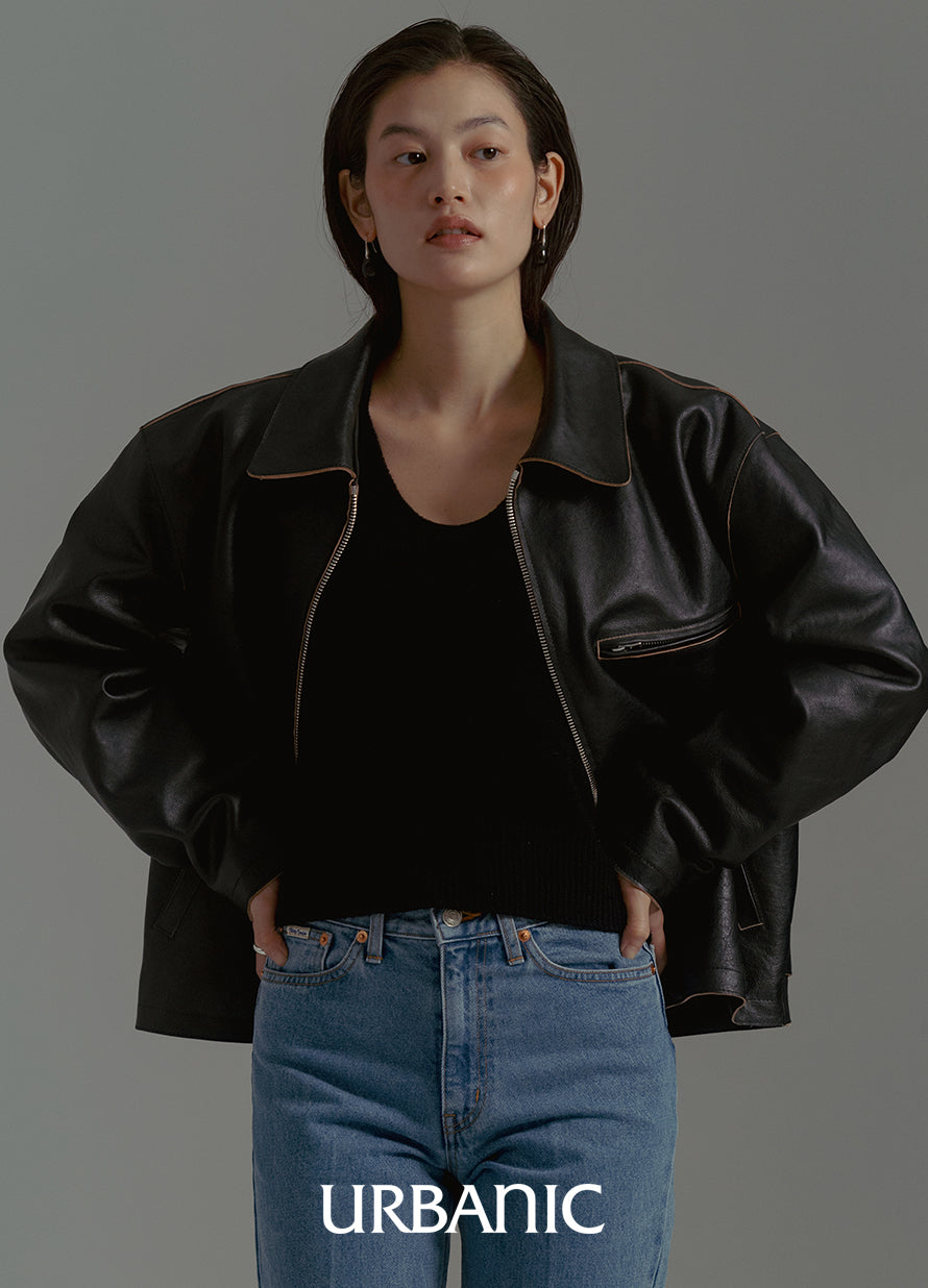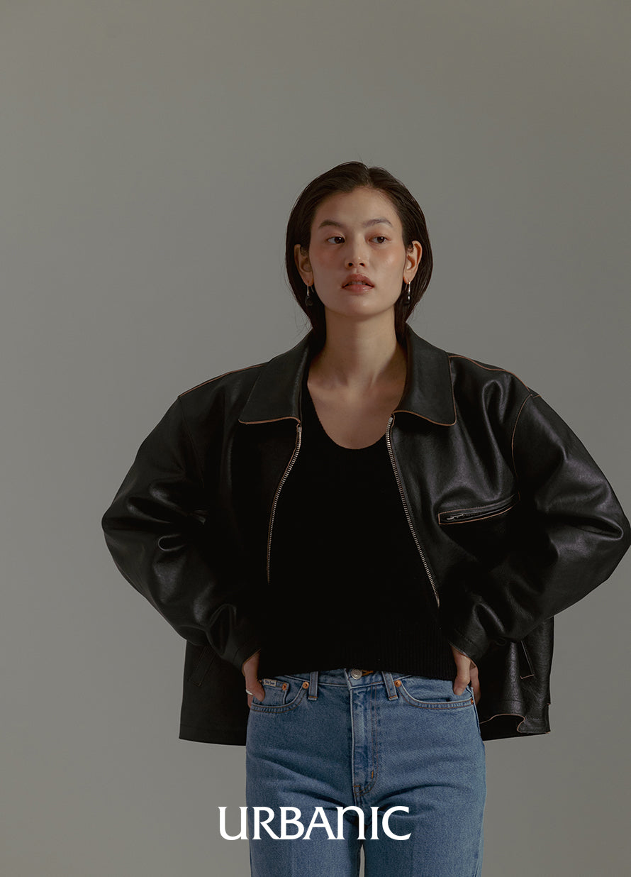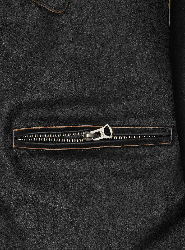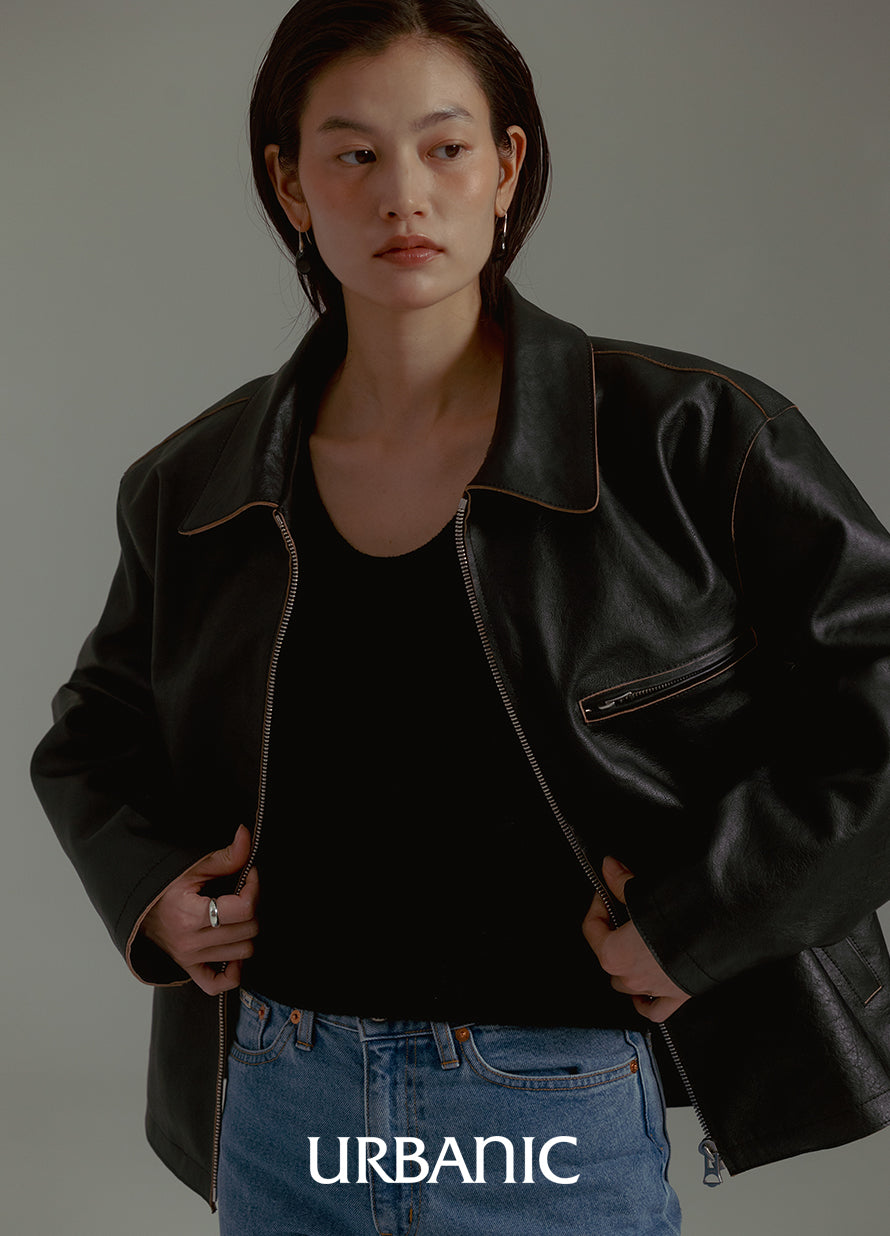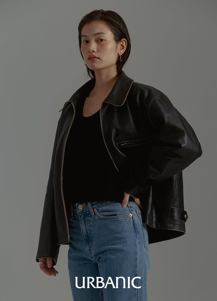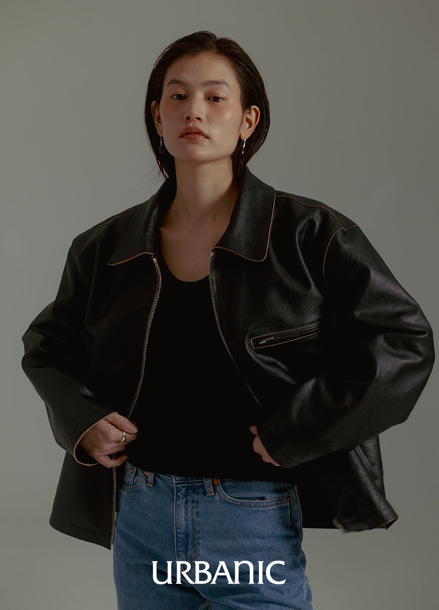 This is a leather jacket made from buffalo leather with a boxy fit. The design highlights a simple yet meticulous attention to detail, with the raw edges left exposed for a distinctive look.