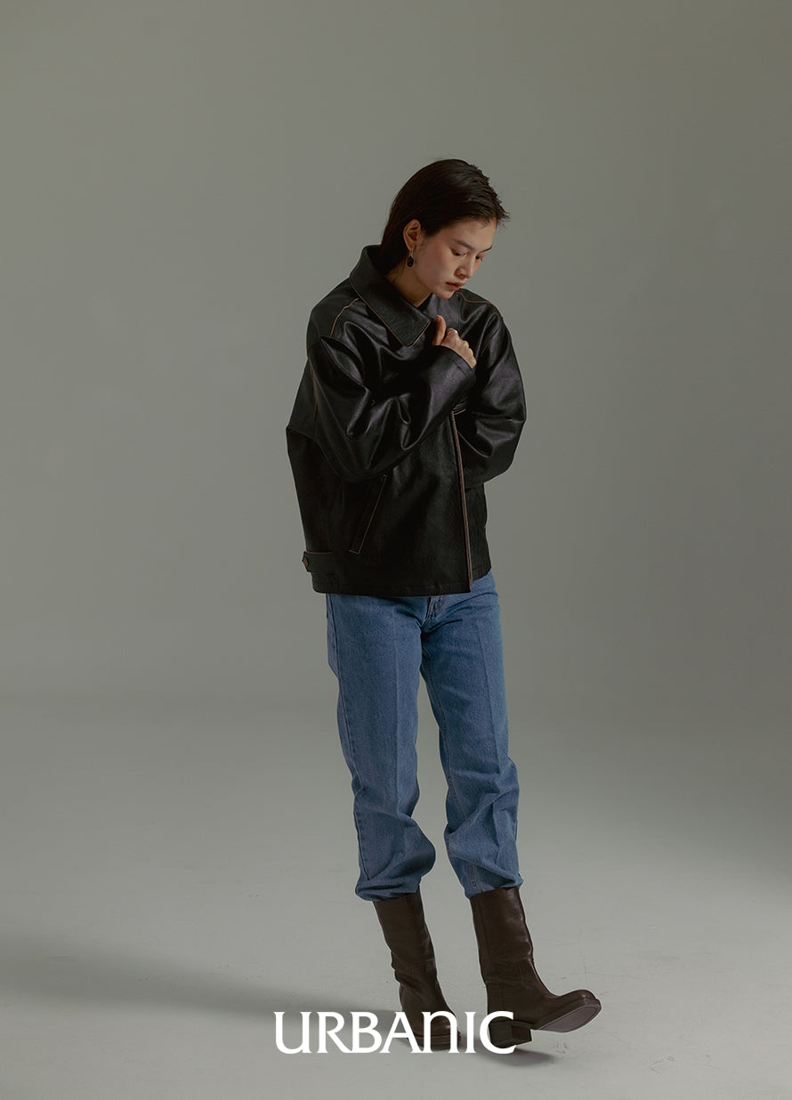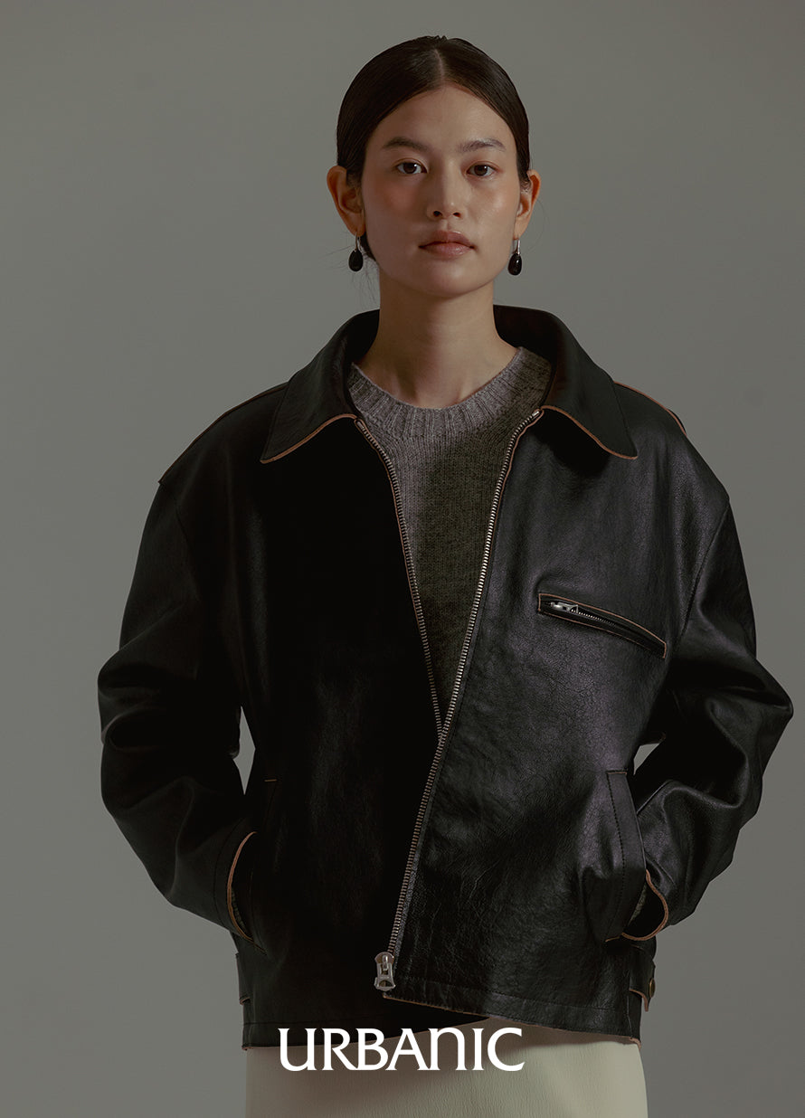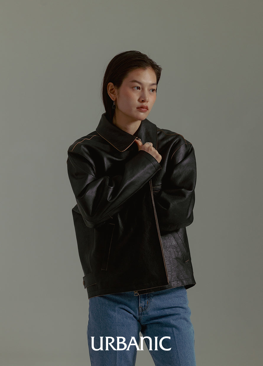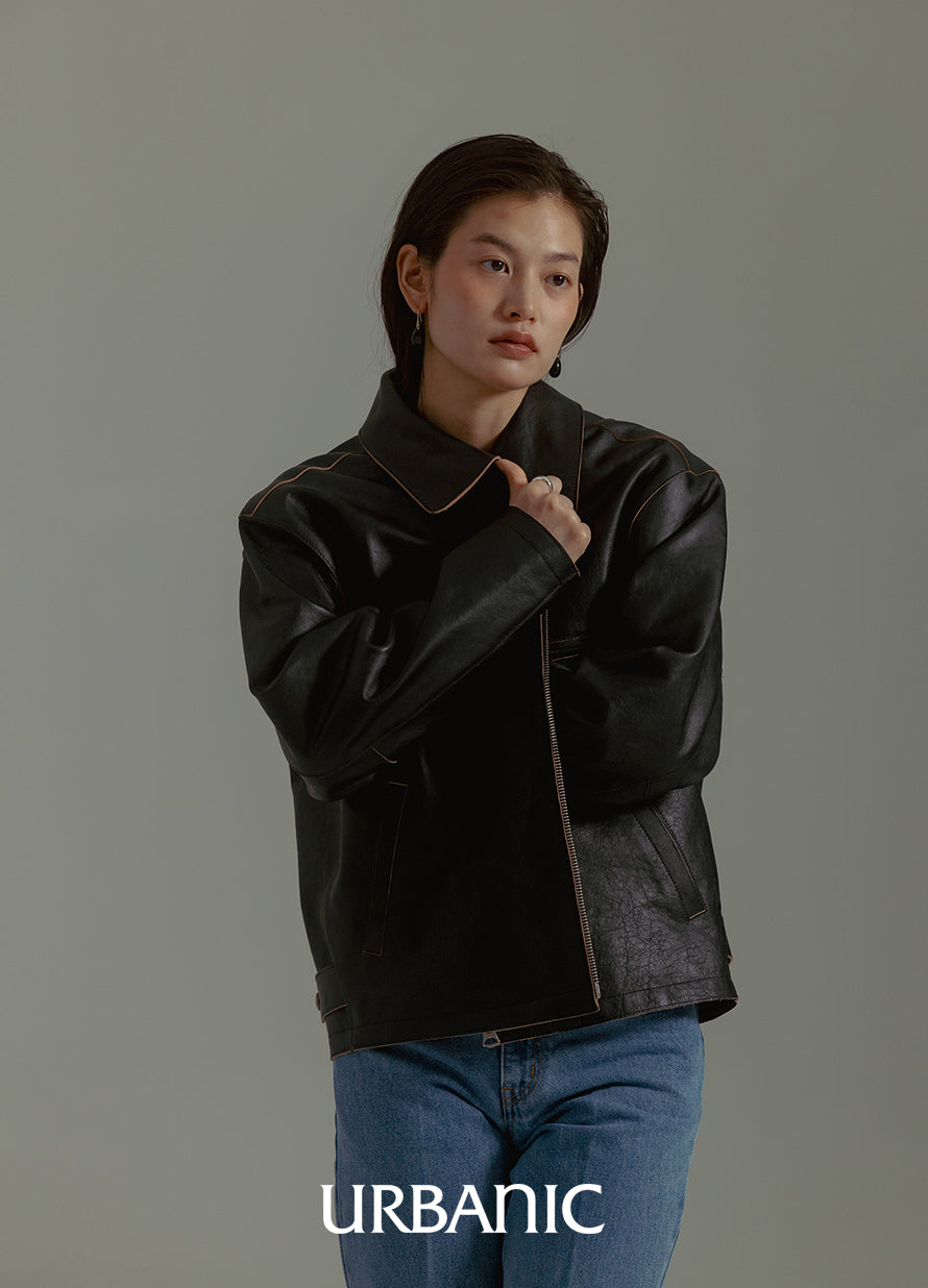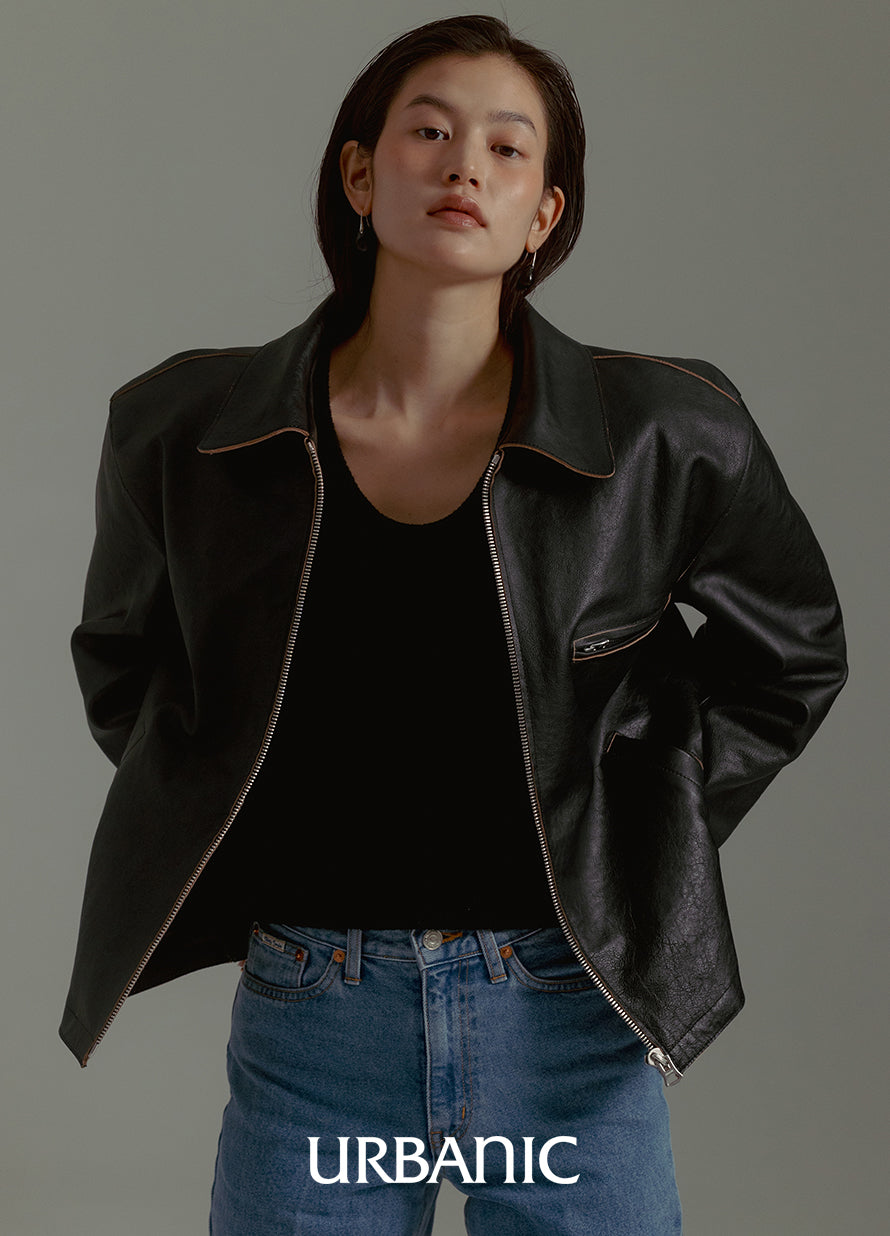 This is a leather jacket made from buffalo leather with a boxy fit. The design highlights a simple yet meticulous attention to detail, with the raw edges left exposed for a distinctive look.