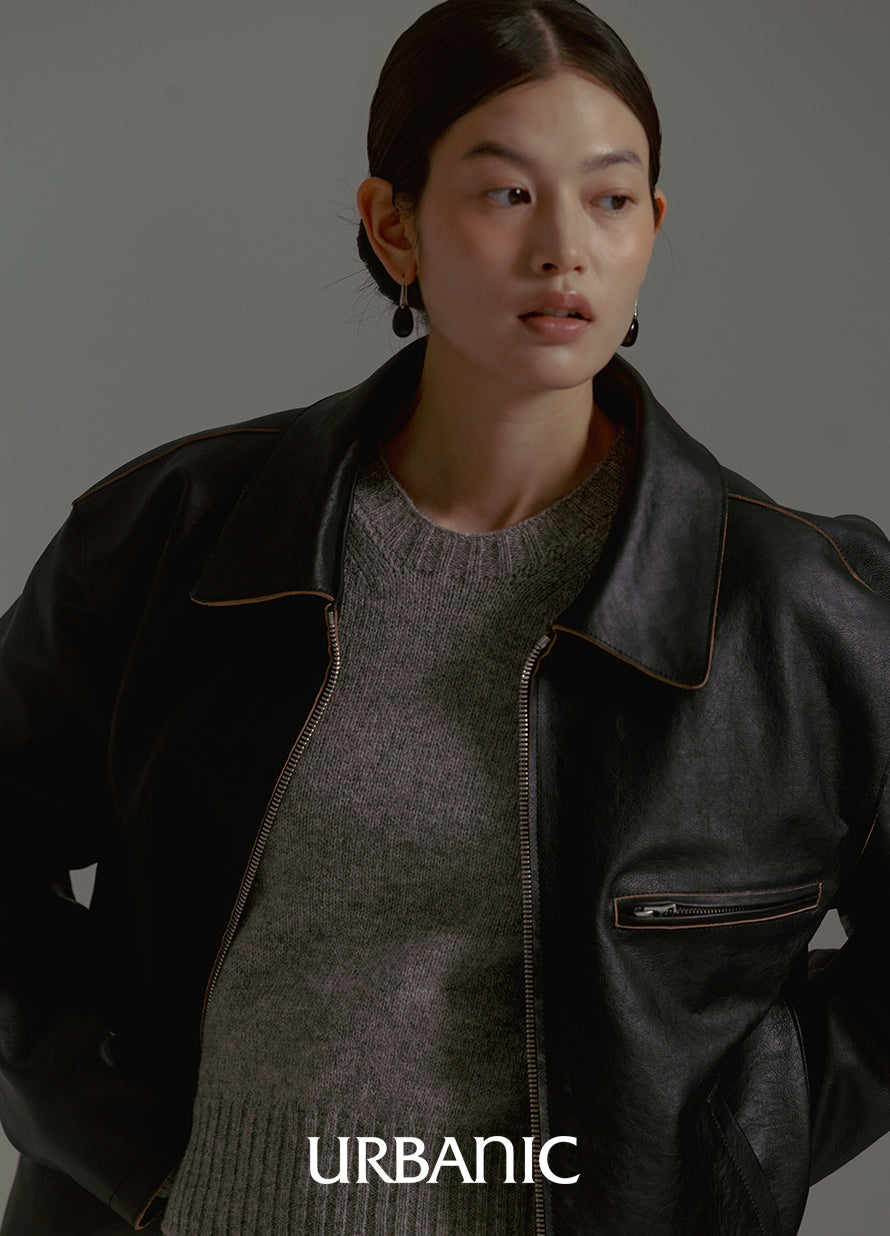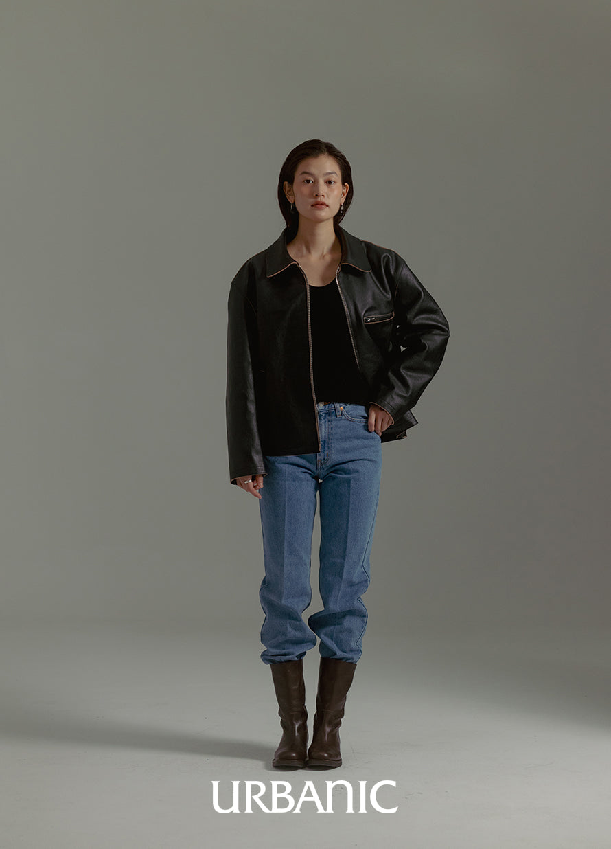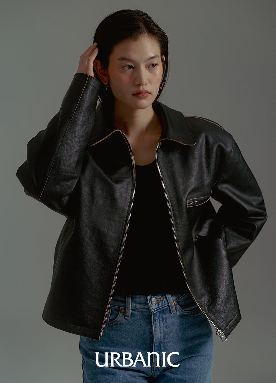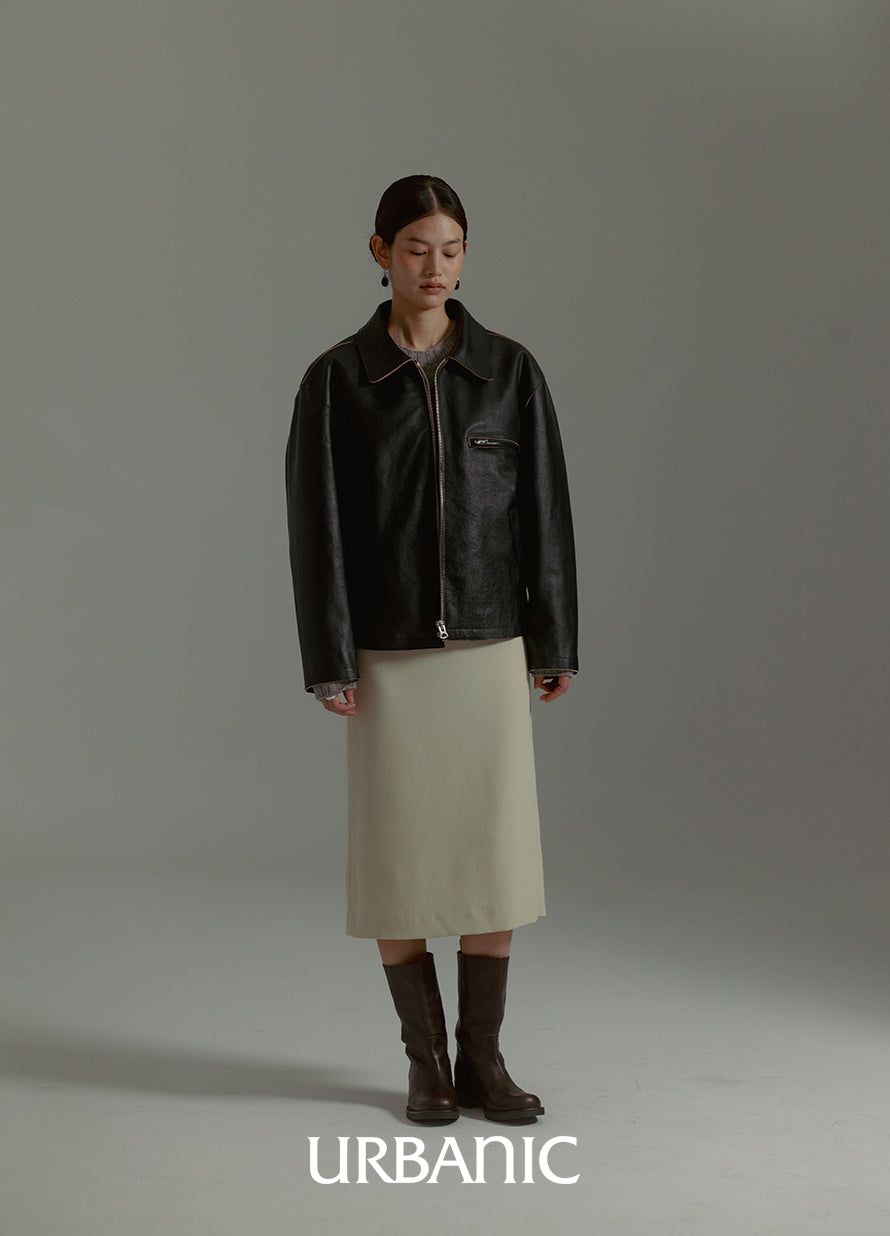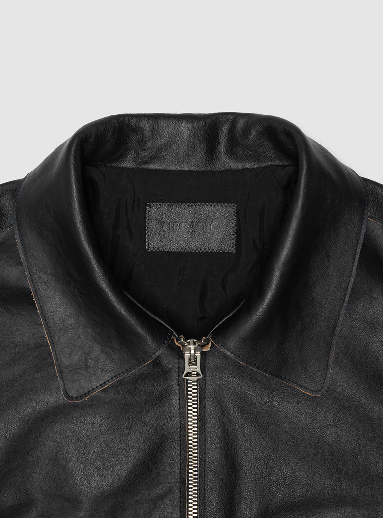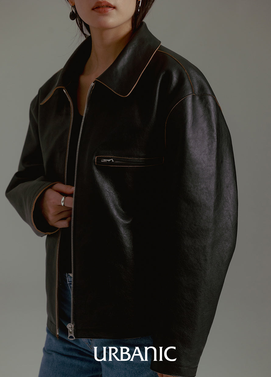 This is a leather jacket made from buffalo leather with a boxy fit. The design highlights a simple yet meticulous attention to detail, with the raw edges left exposed for a distinctive look.