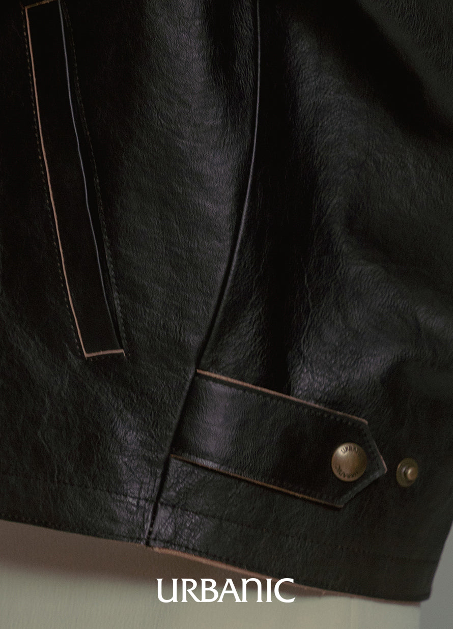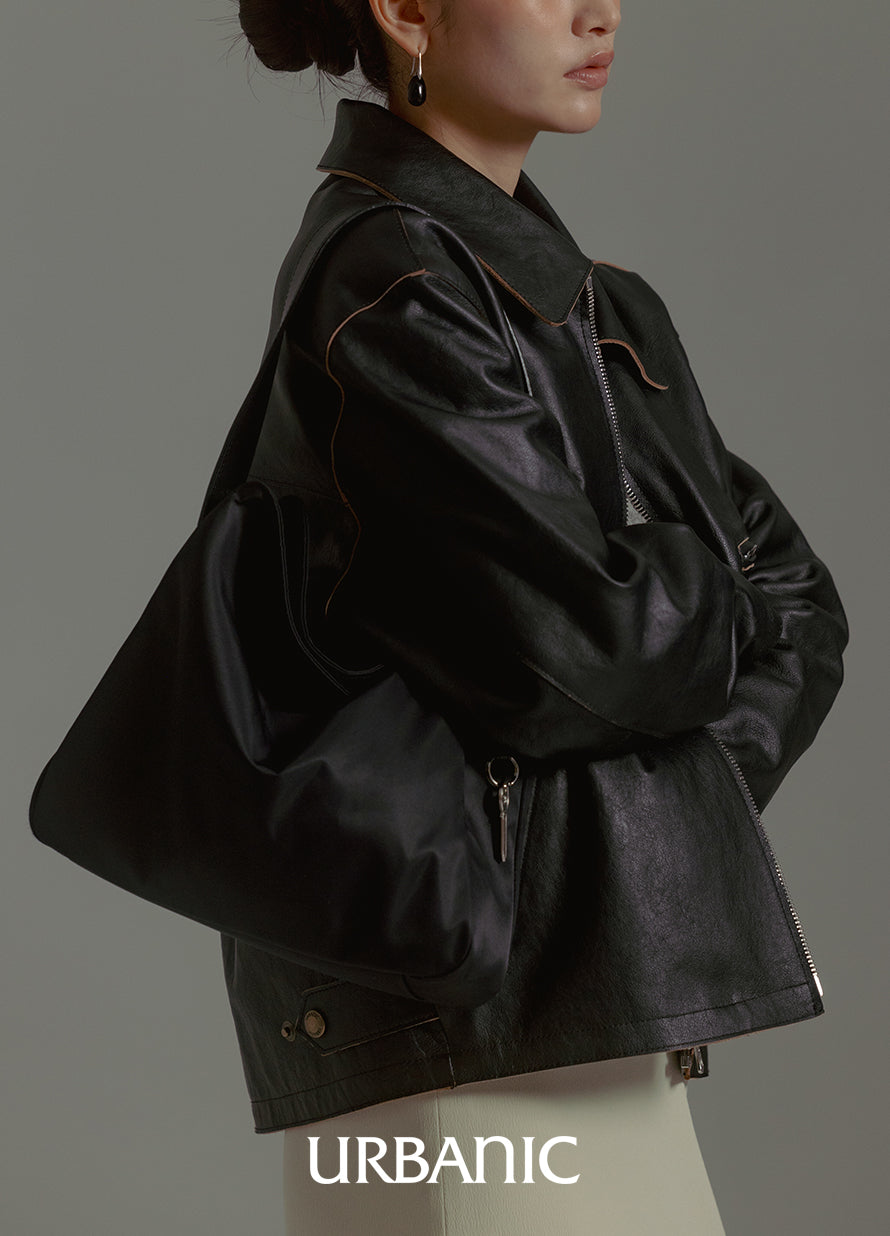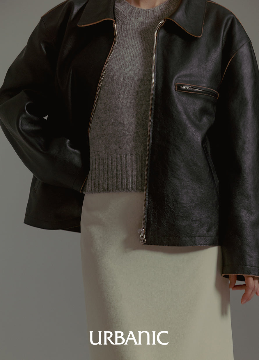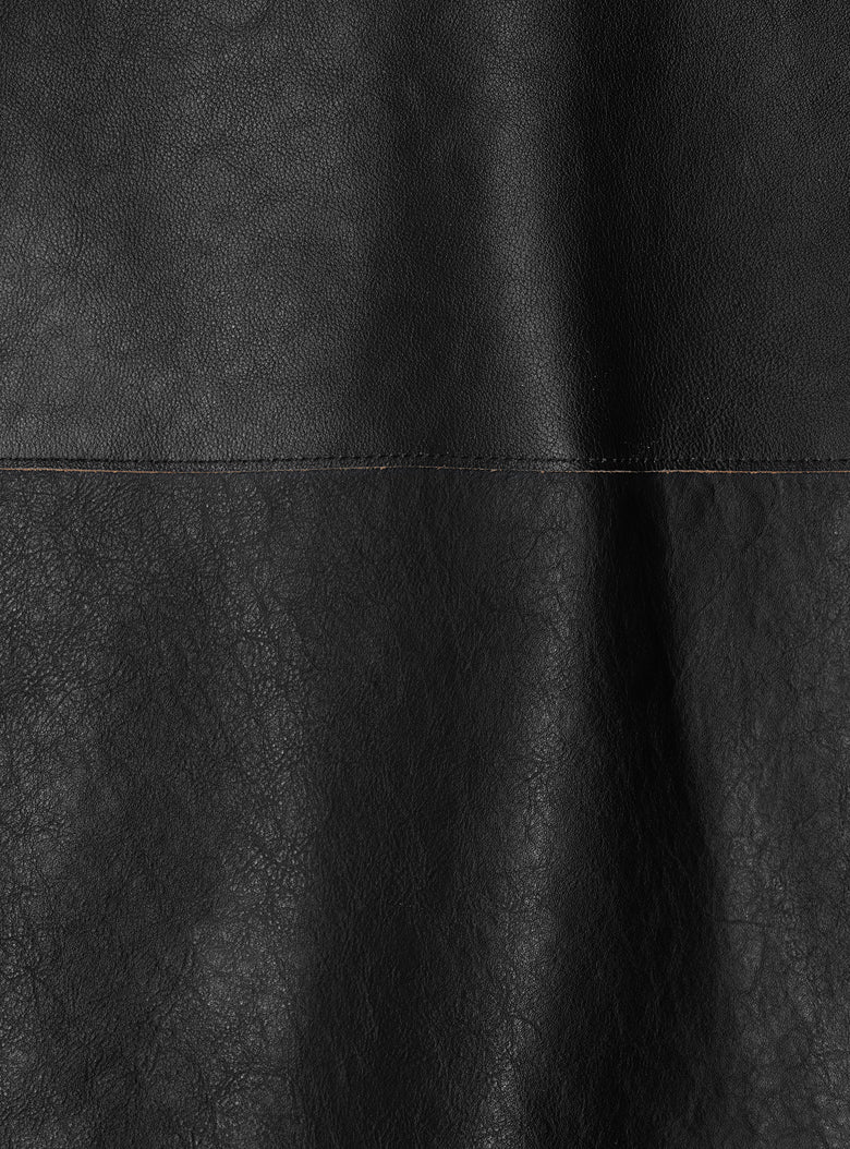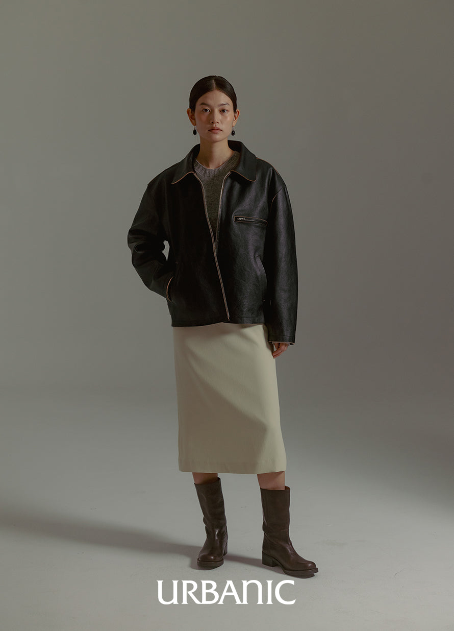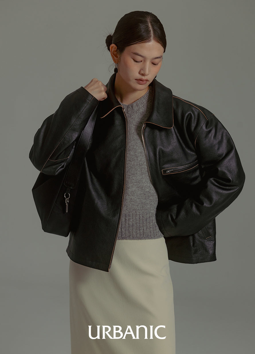 This is a leather jacket made from buffalo leather with a boxy fit. The design highlights a simple yet meticulous attention to detail, with the raw edges left exposed for a distinctive look.