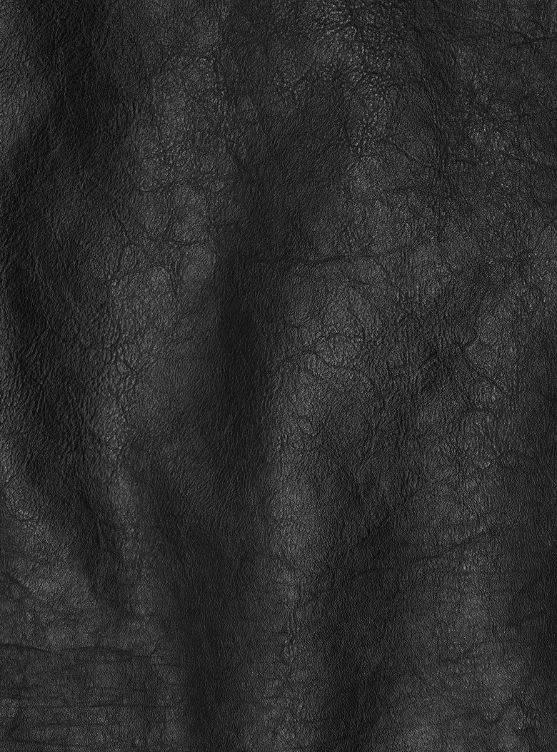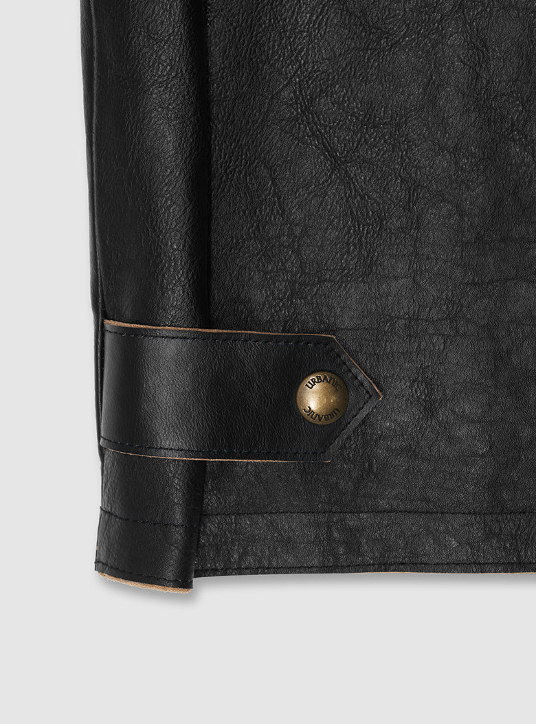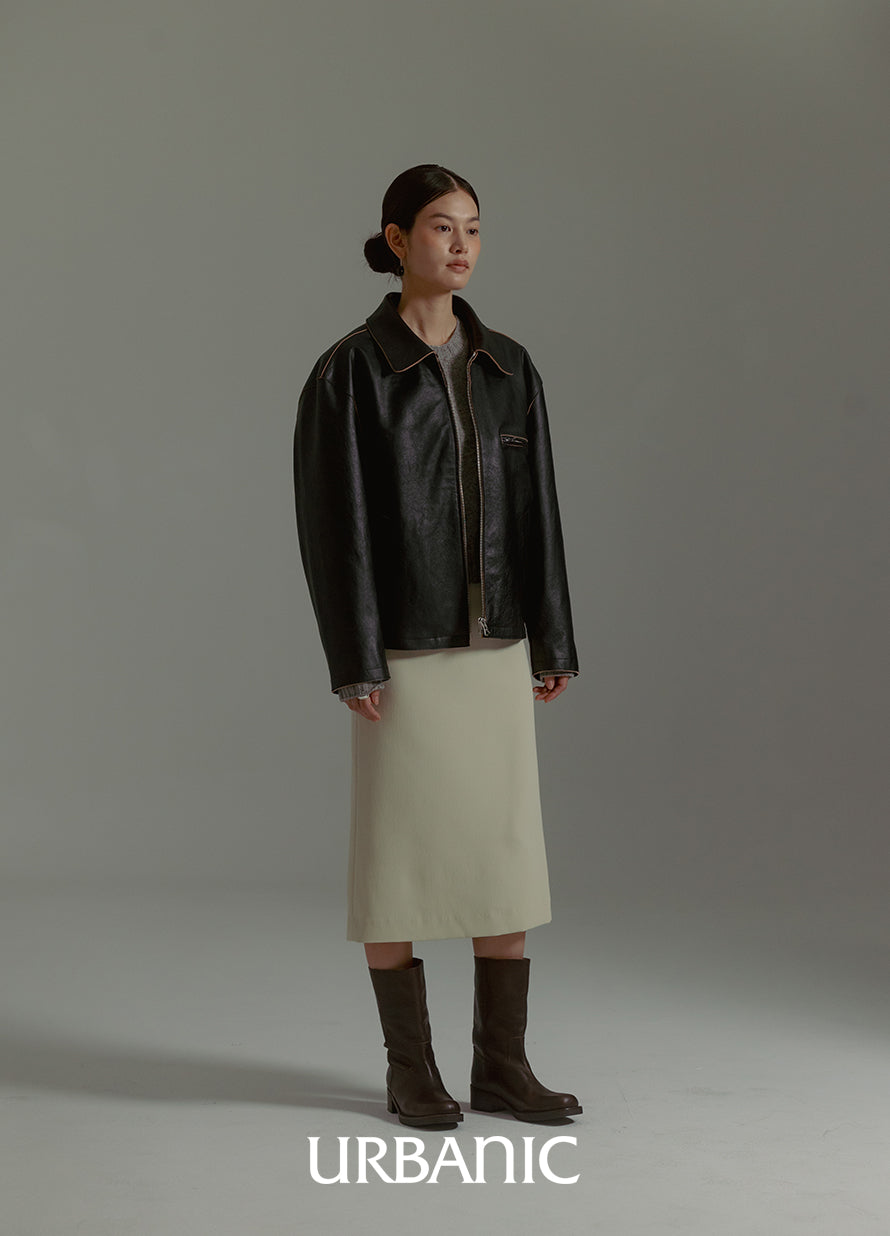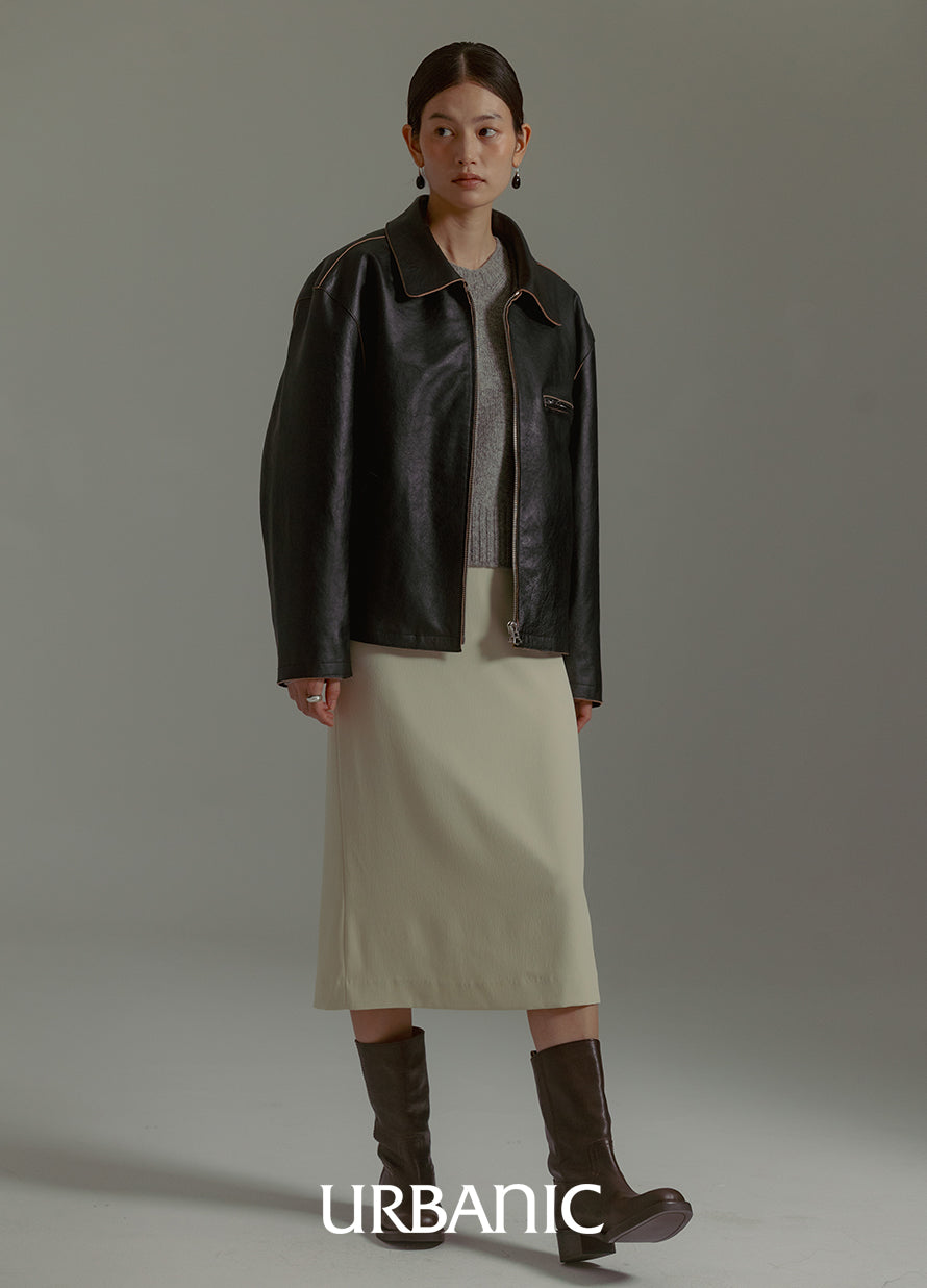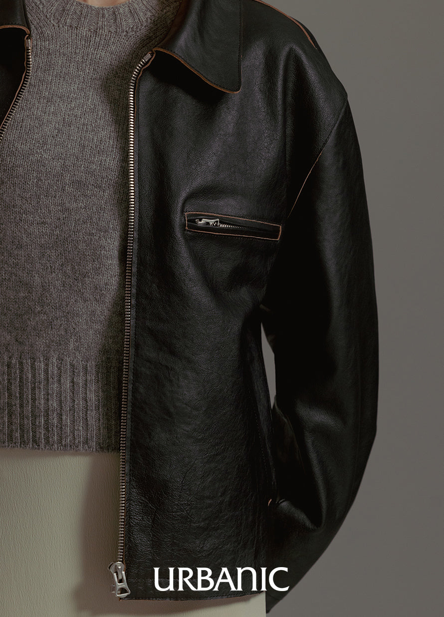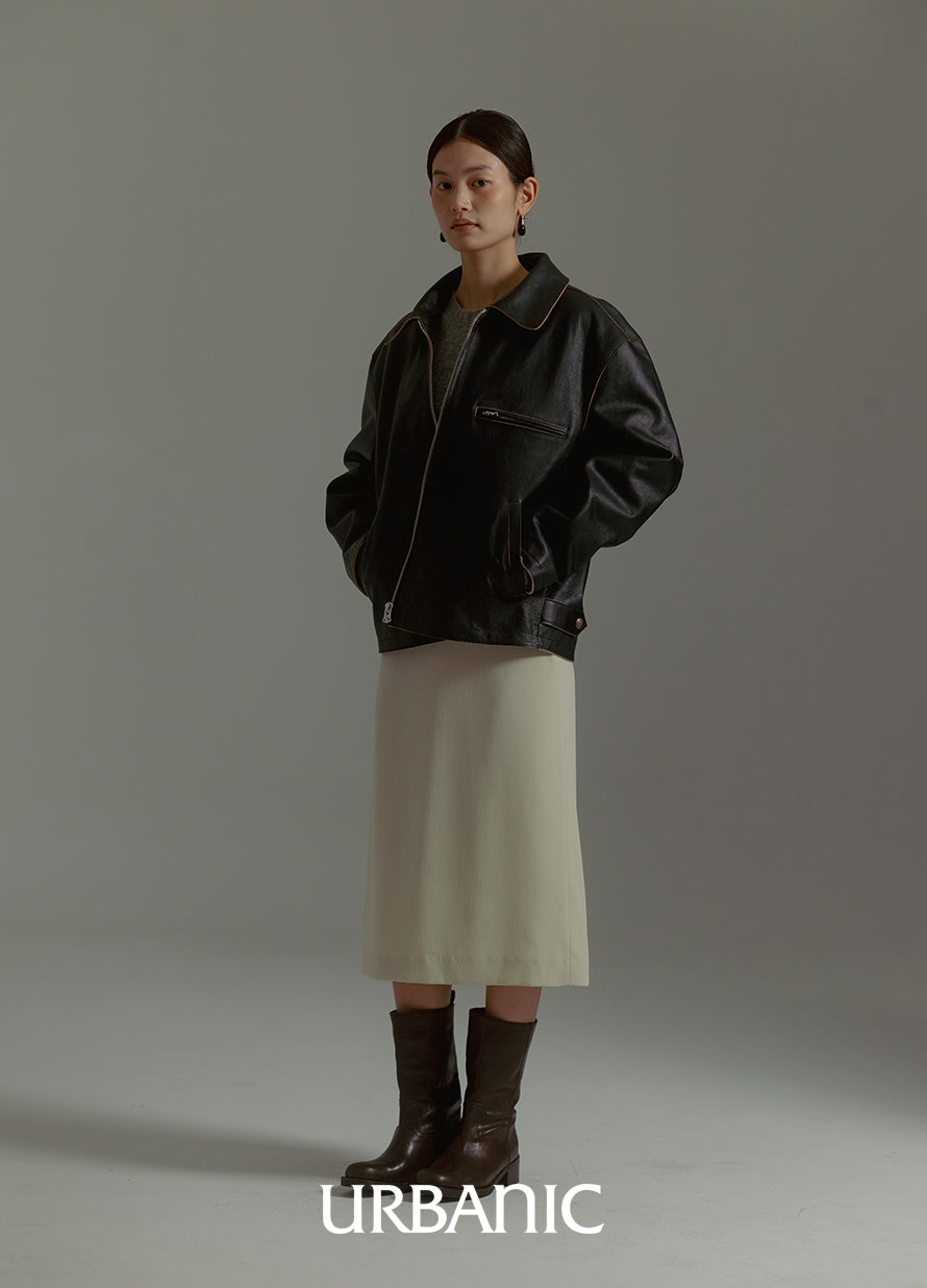 This is a leather jacket made from buffalo leather with a boxy fit. The design highlights a simple yet meticulous attention to detail, with the raw edges left exposed for a distinctive look.