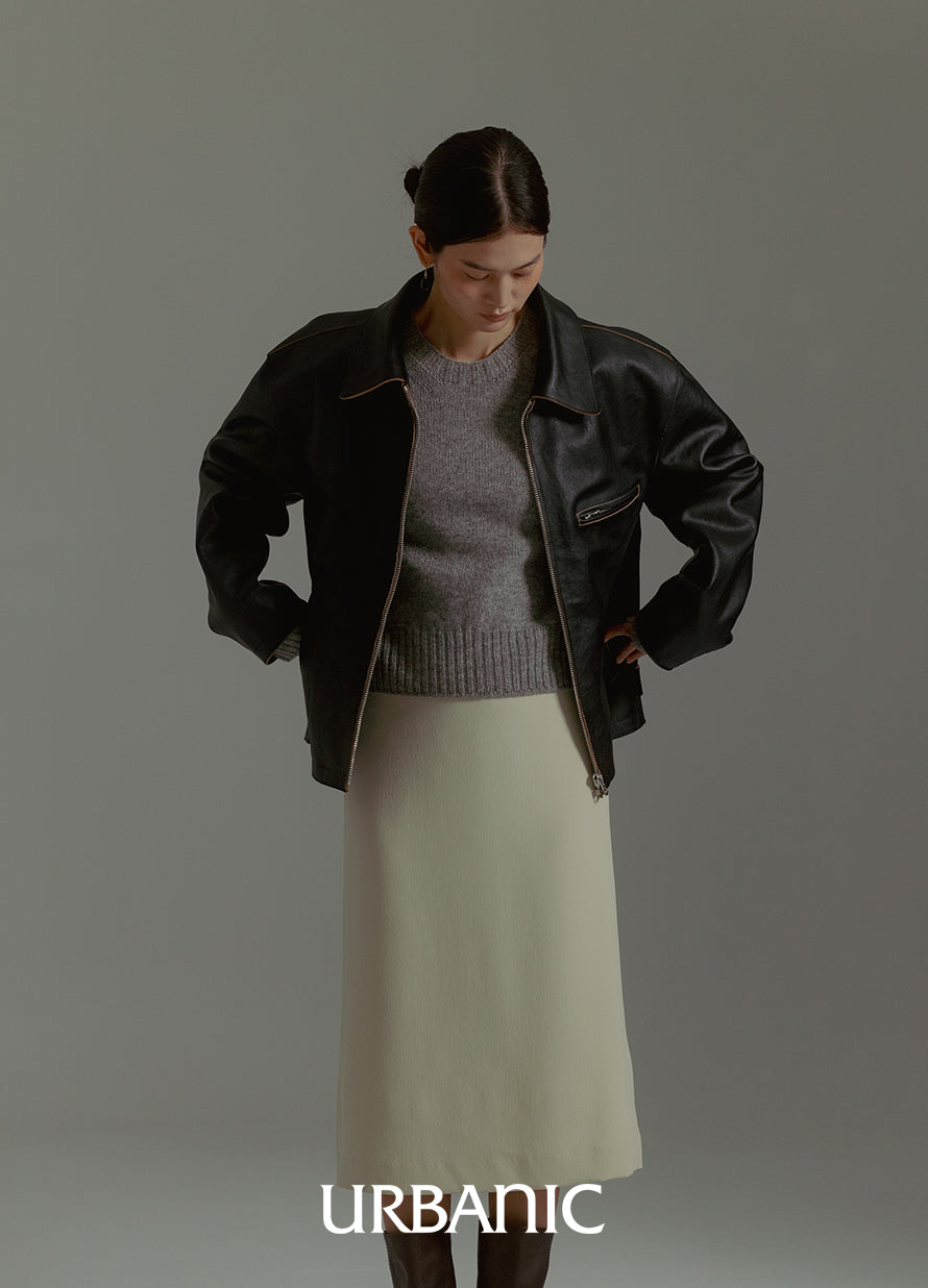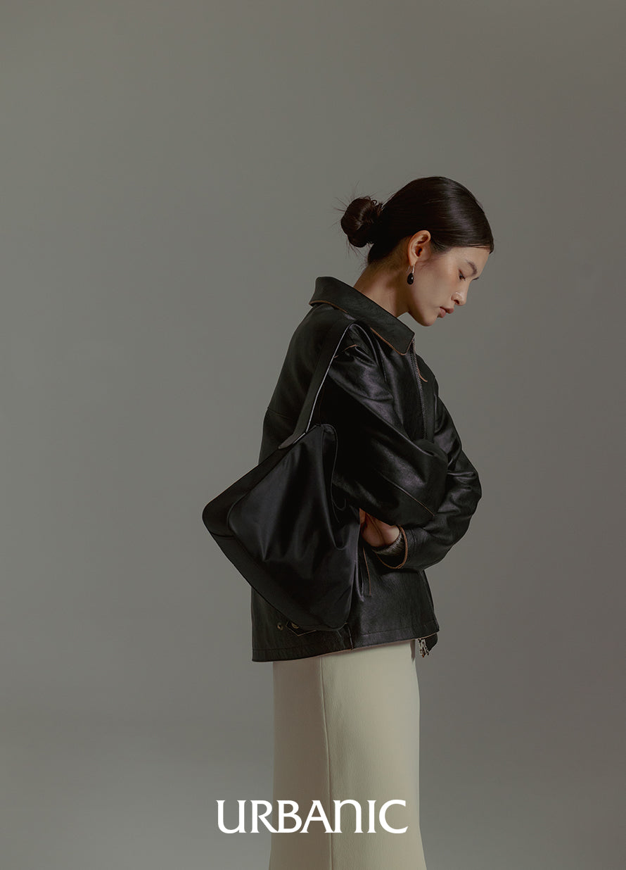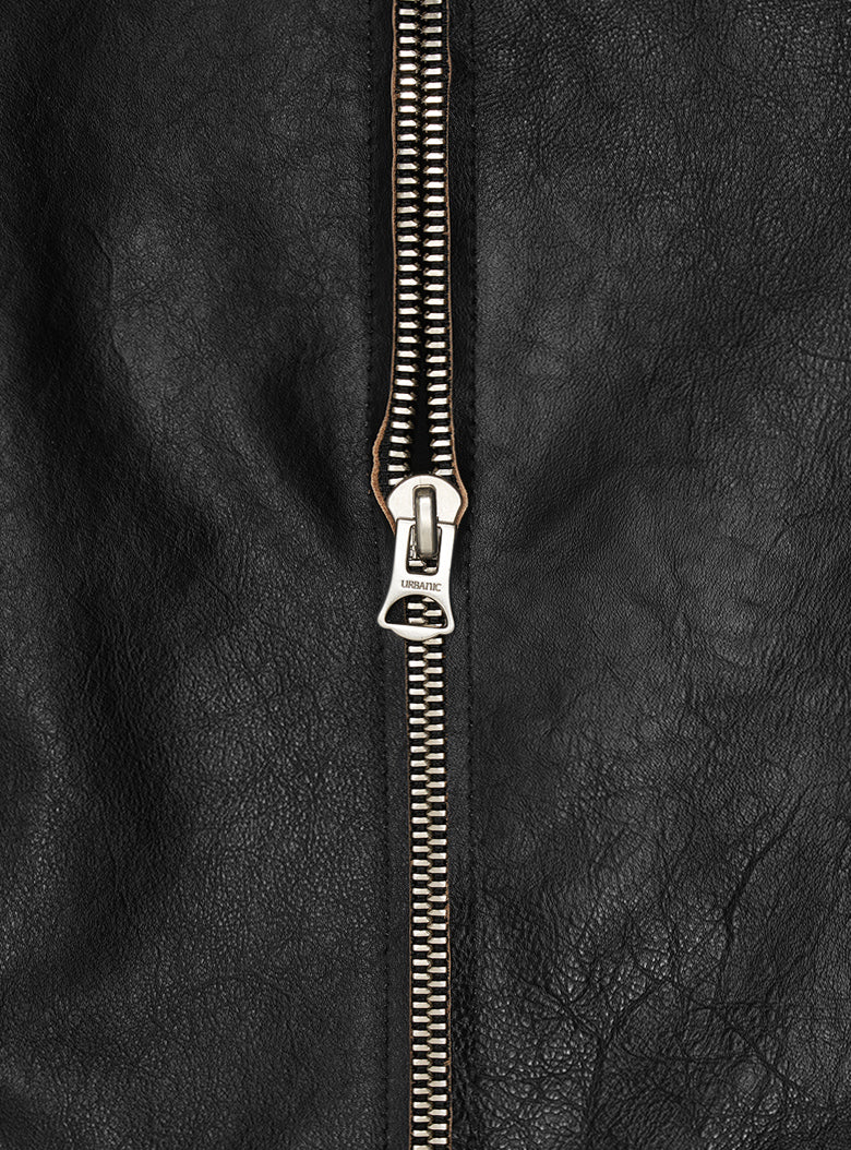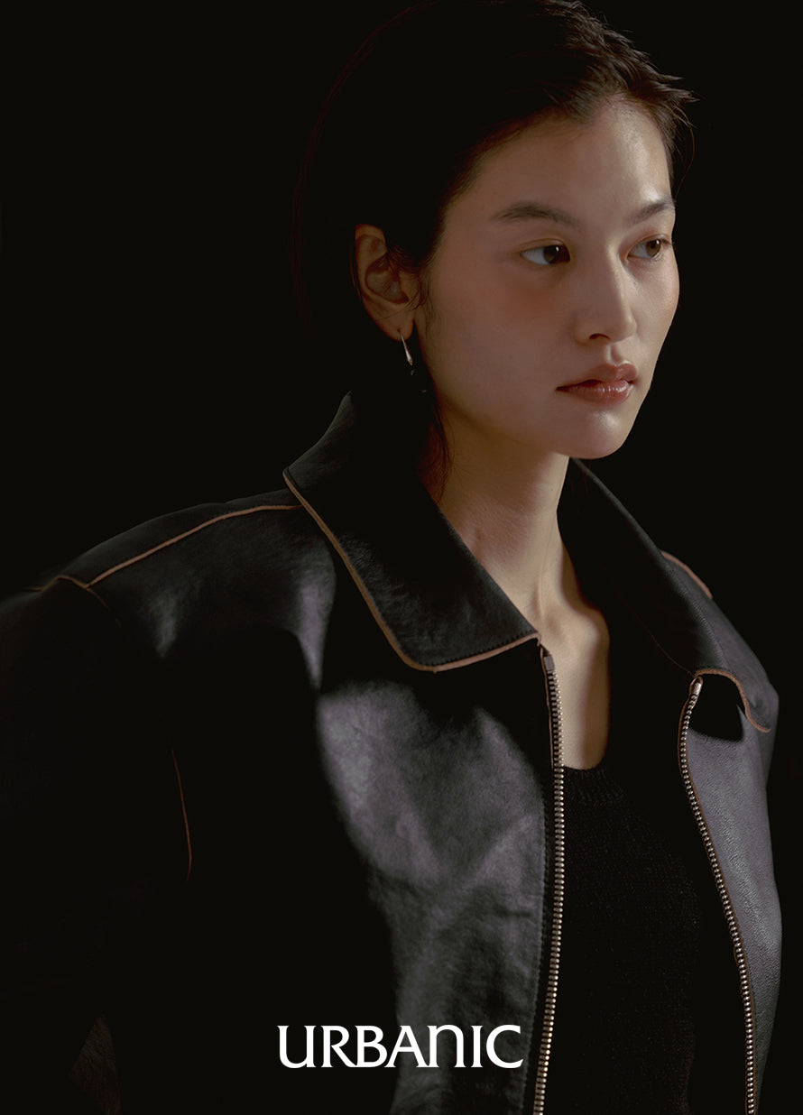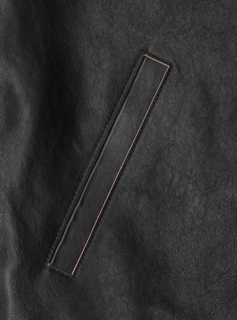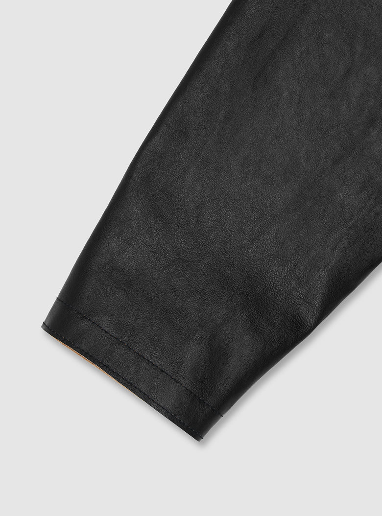 This is a leather jacket made from buffalo leather with a boxy fit. The design highlights a simple yet meticulous attention to detail, with the raw edges left exposed for a distinctive look.