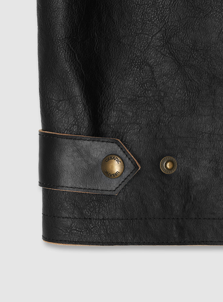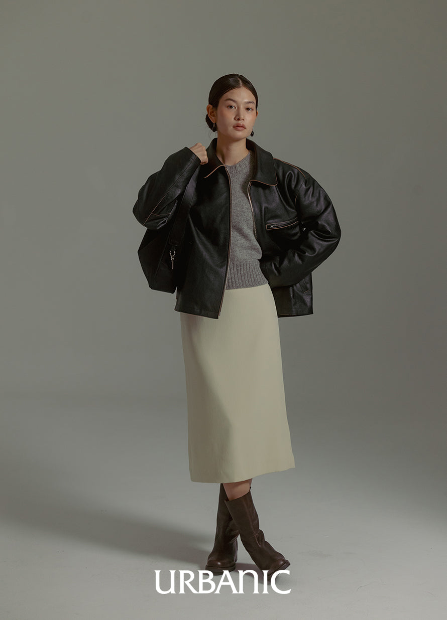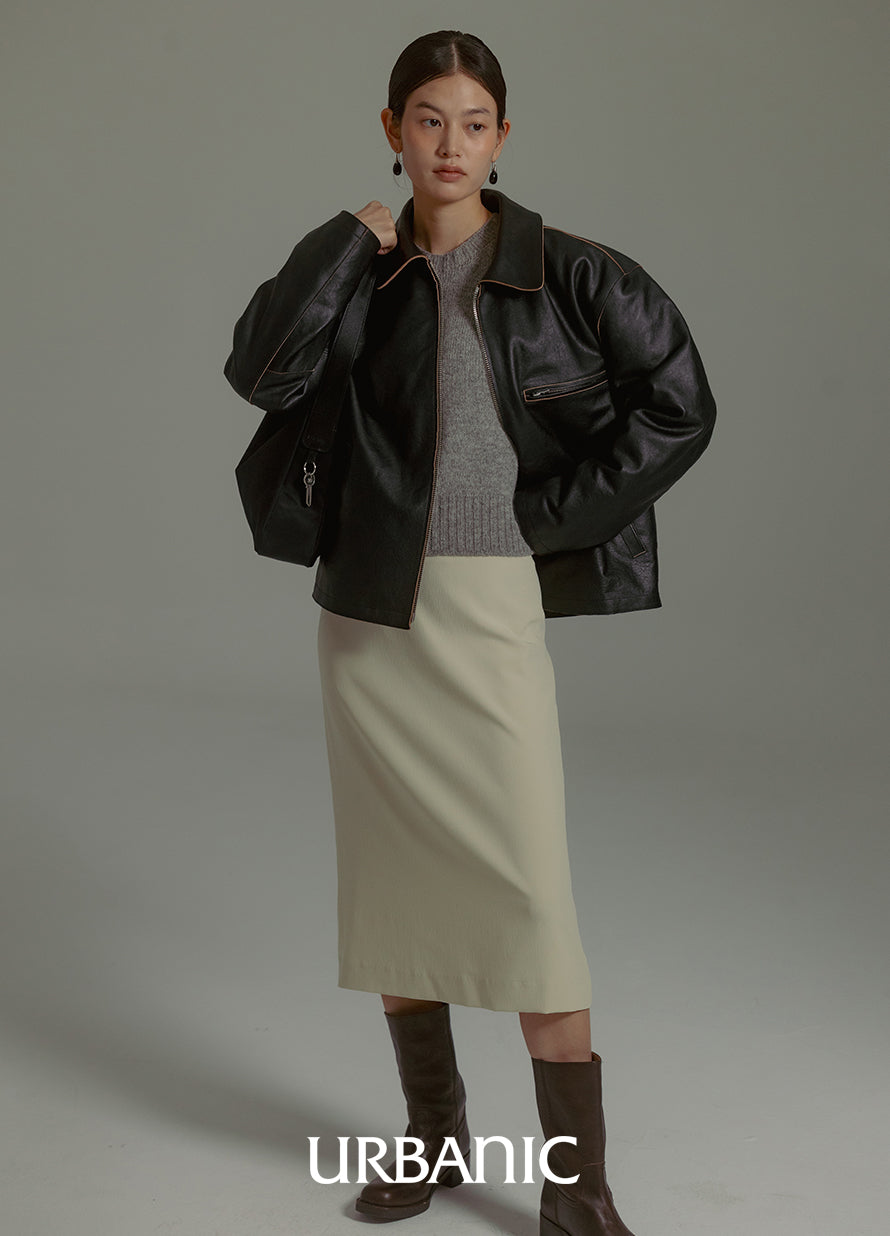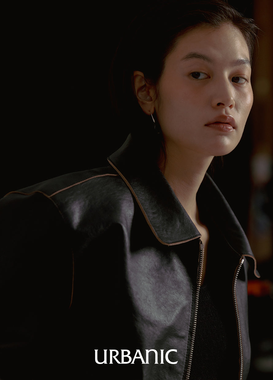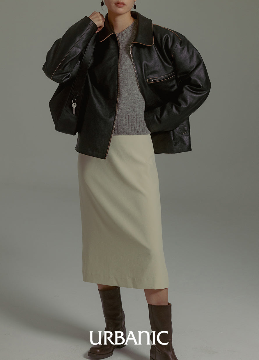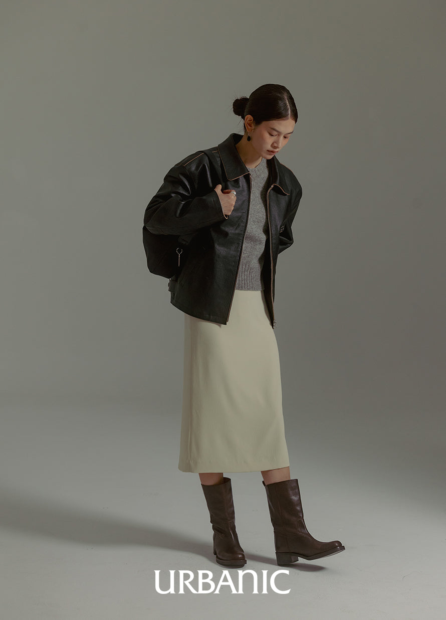 This is a leather jacket made from buffalo leather with a boxy fit. The design highlights a simple yet meticulous attention to detail, with the raw edges left exposed for a distinctive look.