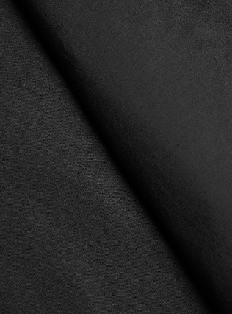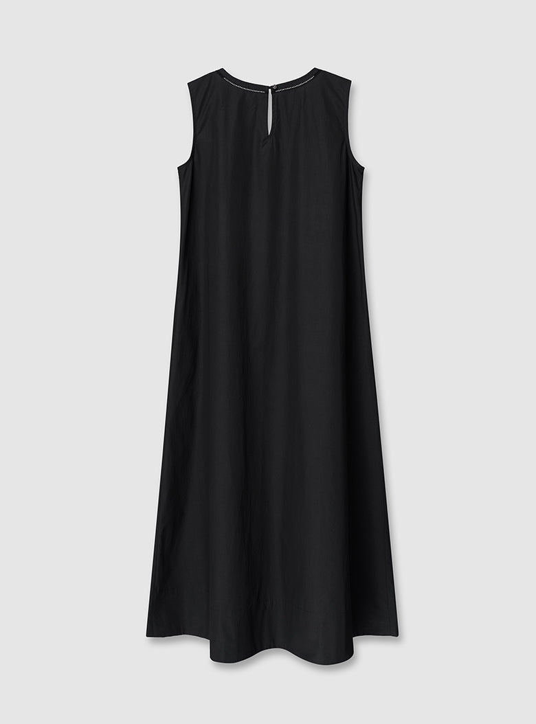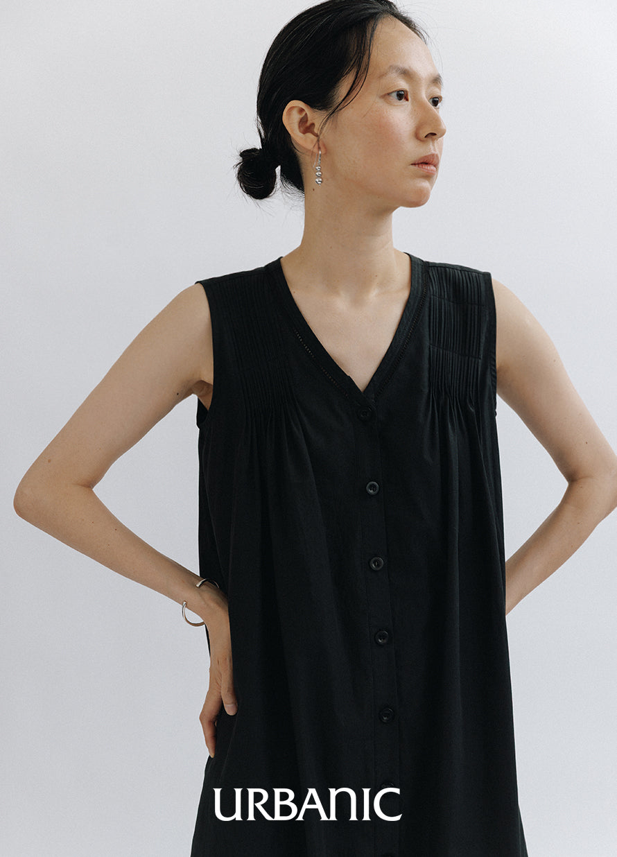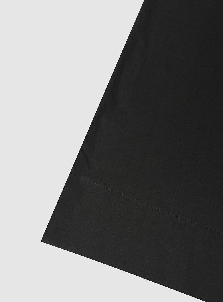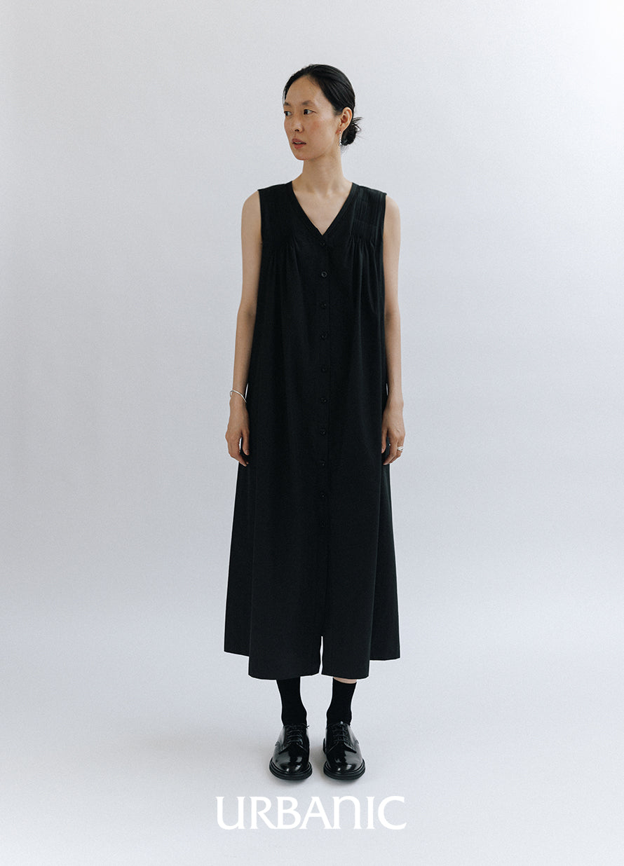 Delicate folds fall from just beneath the shoulders, softly shaping the upper body before opening into a gentle flare. The wide hemline anchors the silhouette, adding volume without weight—measured, composed, and effortlessly graceful.