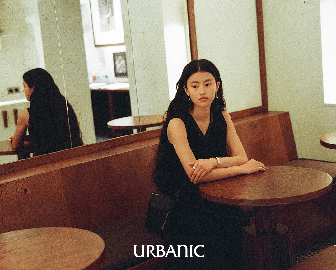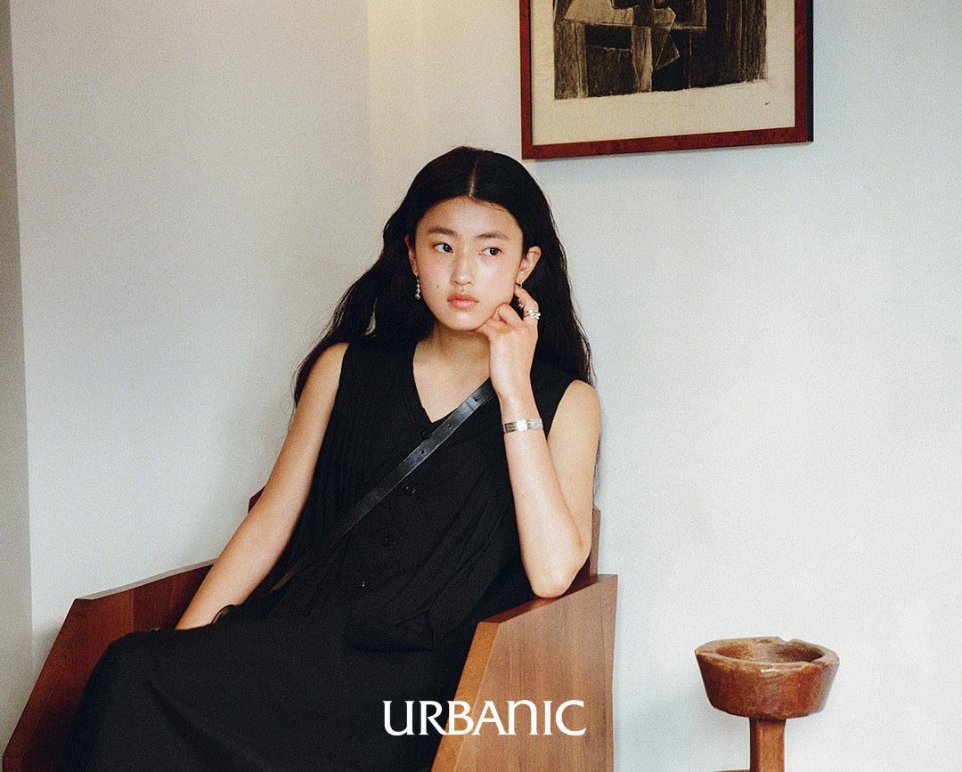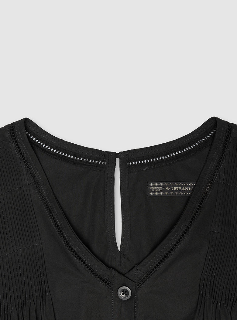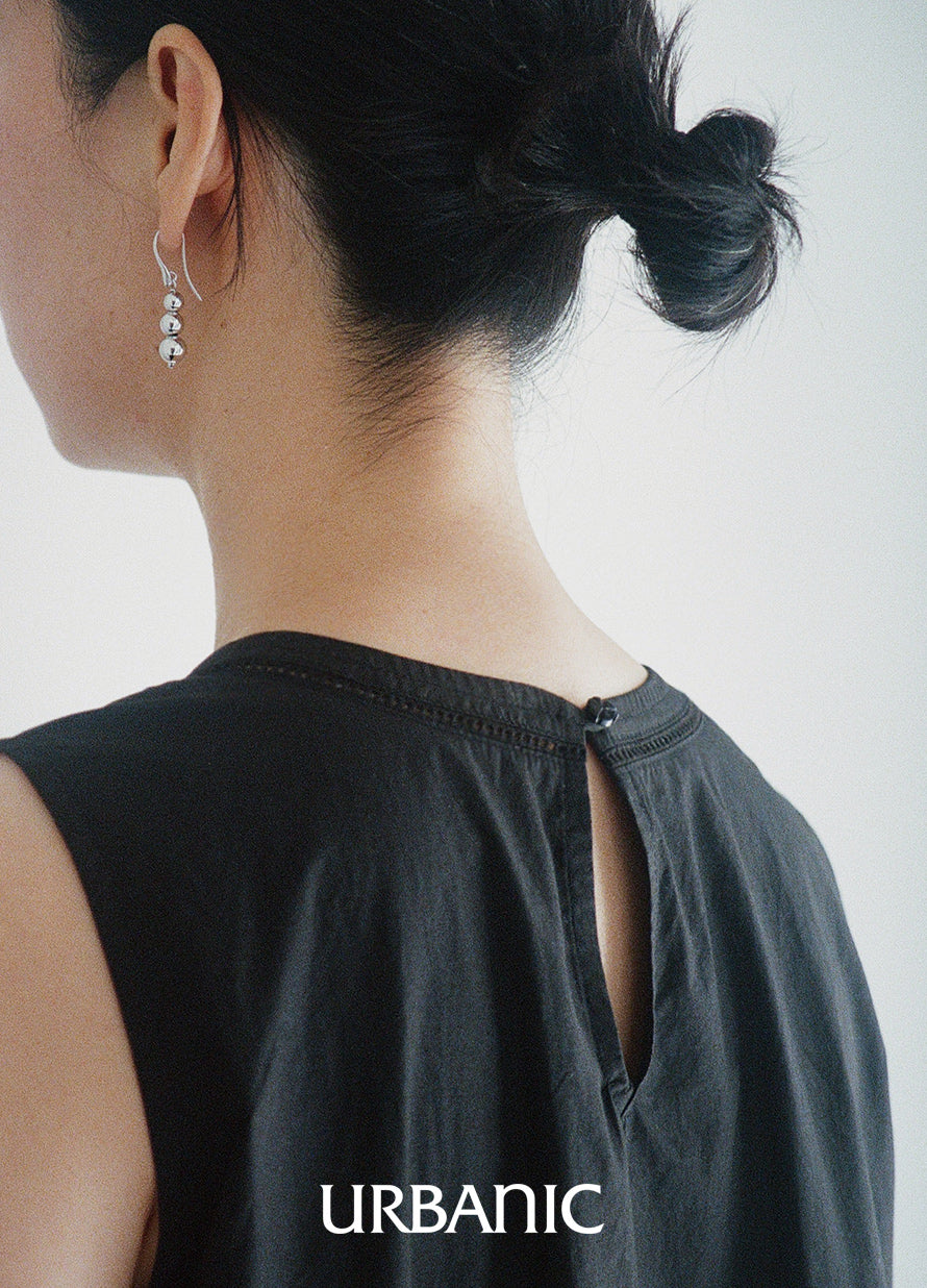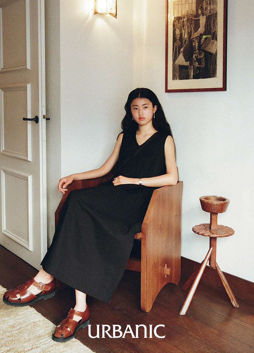 Delicate folds fall from just beneath the shoulders, softly shaping the upper body before opening into a gentle flare. The wide hemline anchors the silhouette, adding volume without weight—measured, composed, and effortlessly graceful.