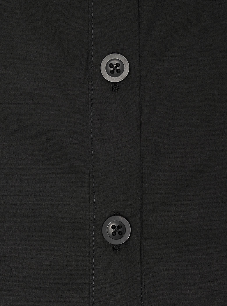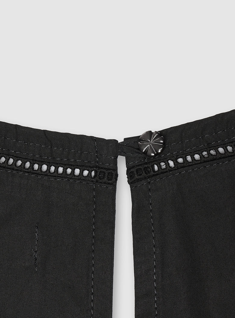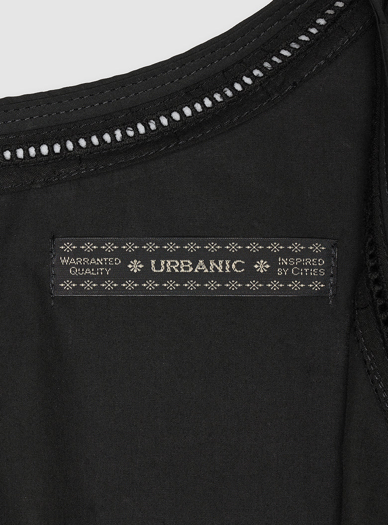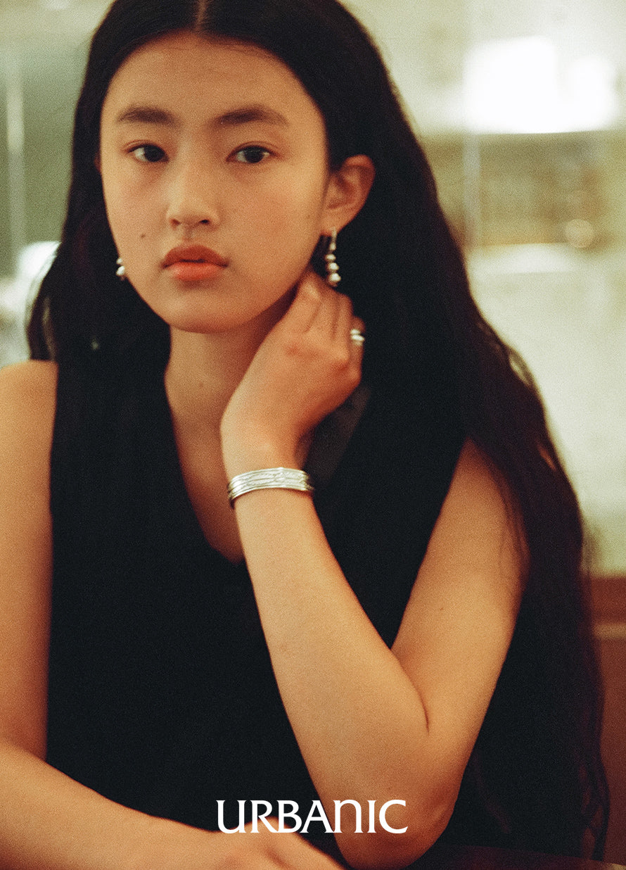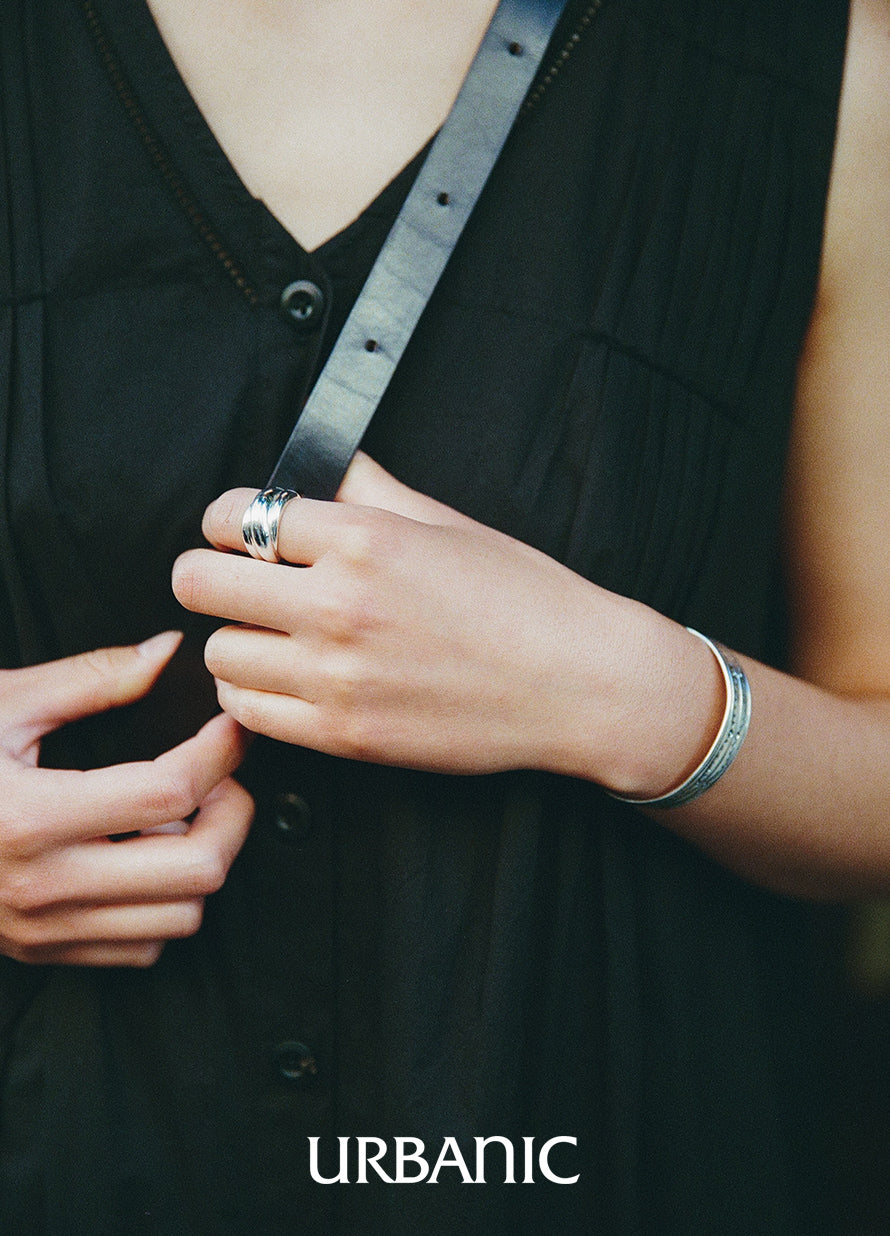 Delicate folds fall from just beneath the shoulders, softly shaping the upper body before opening into a gentle flare. The wide hemline anchors the silhouette, adding volume without weight—measured, composed, and effortlessly graceful.