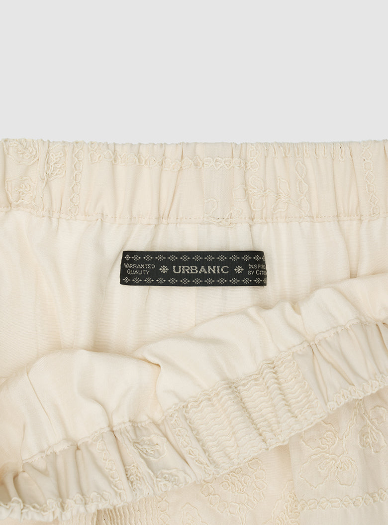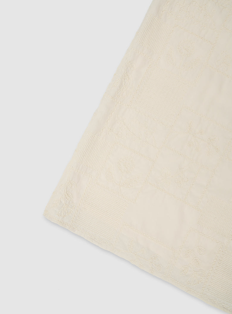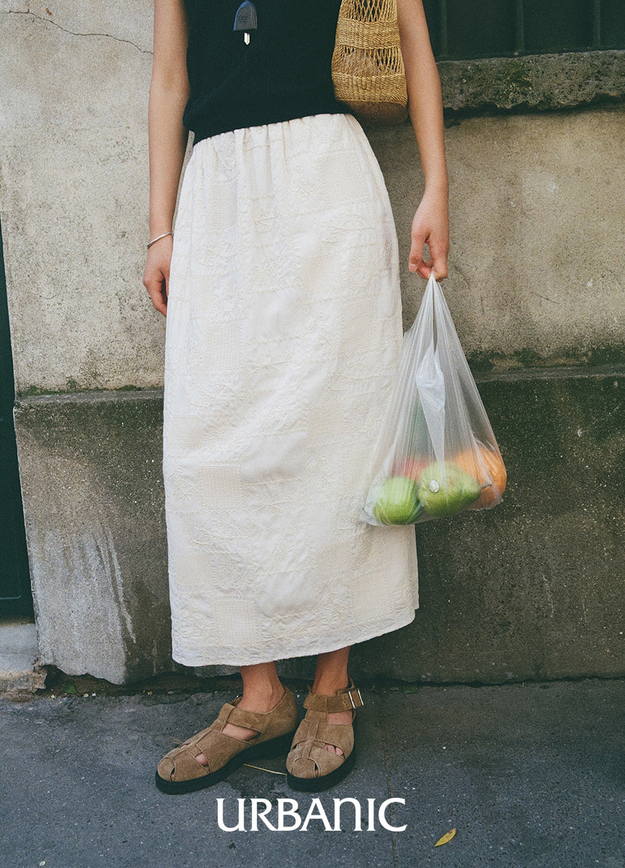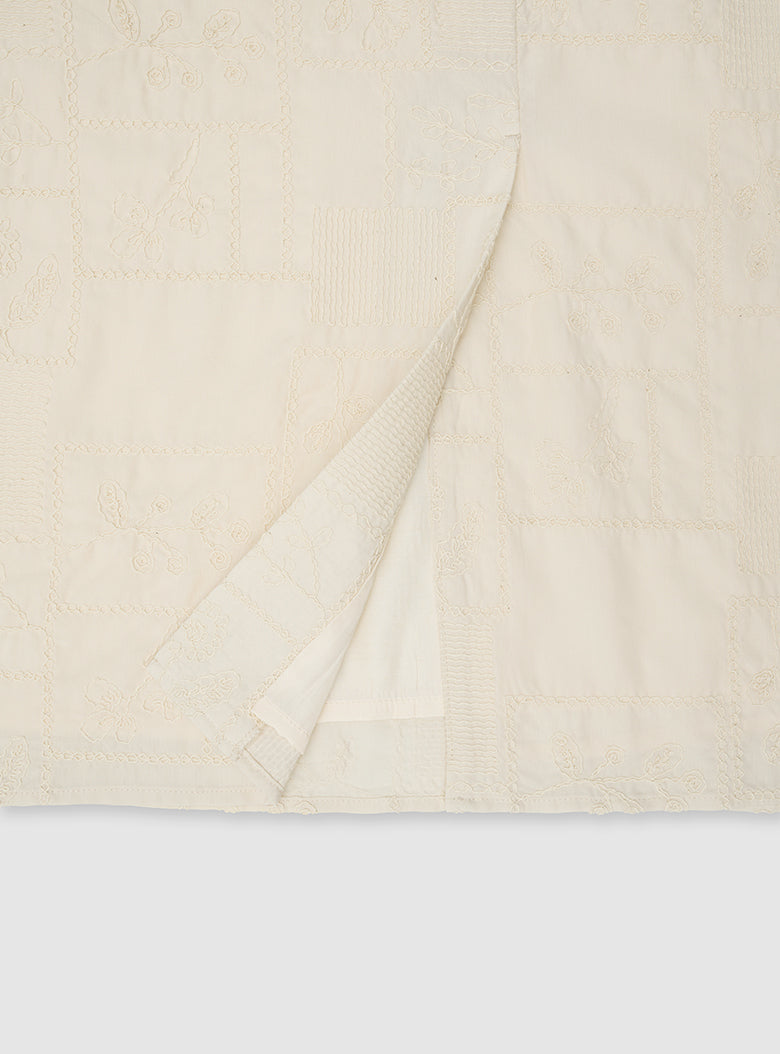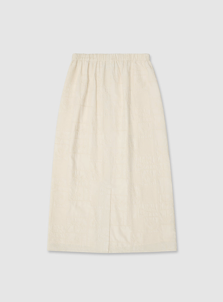 The Cucito Skirt features an arrangement of embroidered floral motifs, scattered across the surface like a painted field. Made from smooth 100% Tencel in a soft buttercream tone, the fabric has a gentle sheen and fluid touch. The embroidery adds texture with subtle variation, bringing depth to its calm impression.