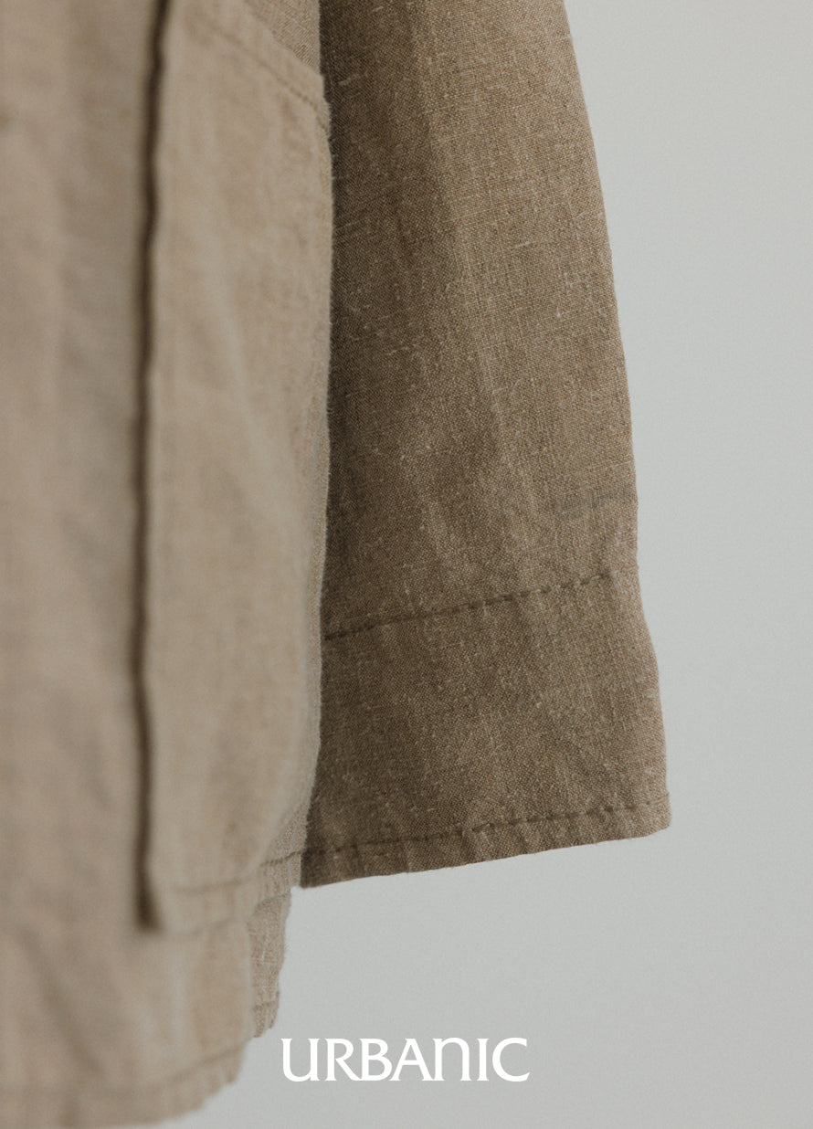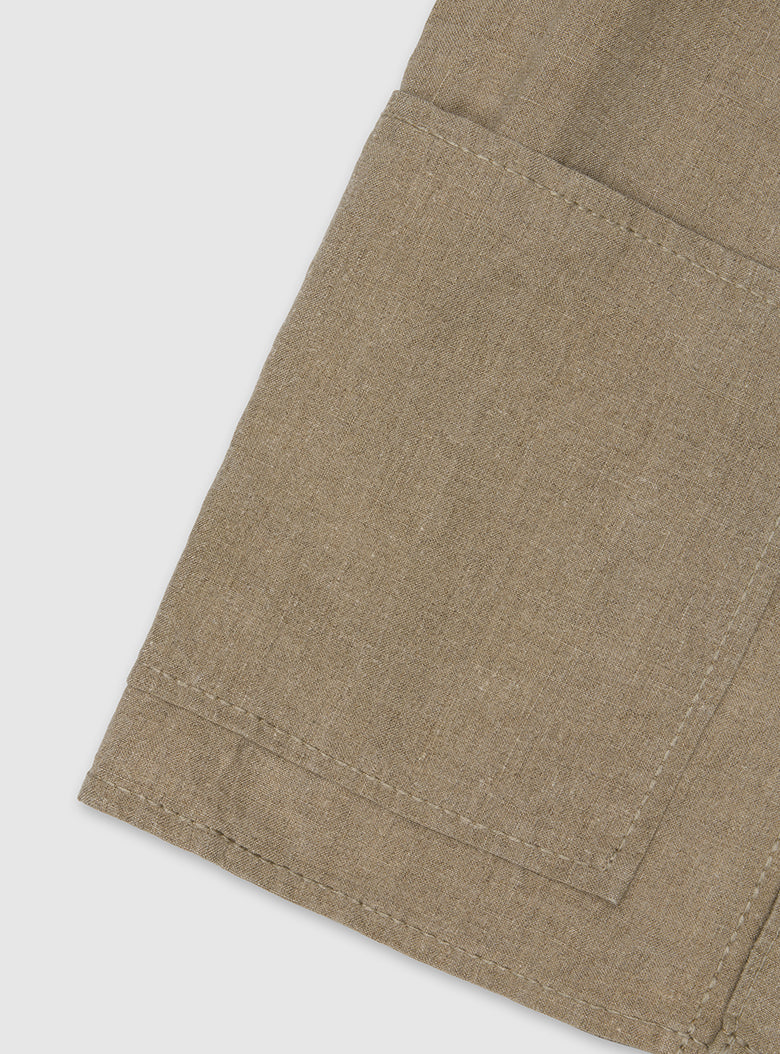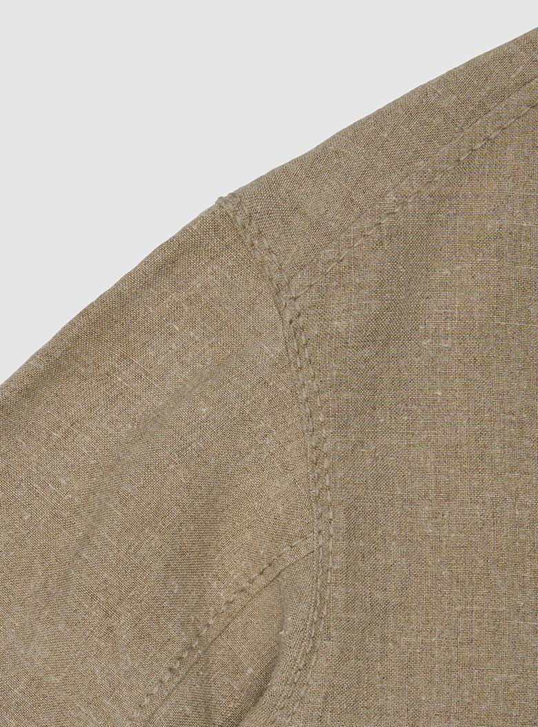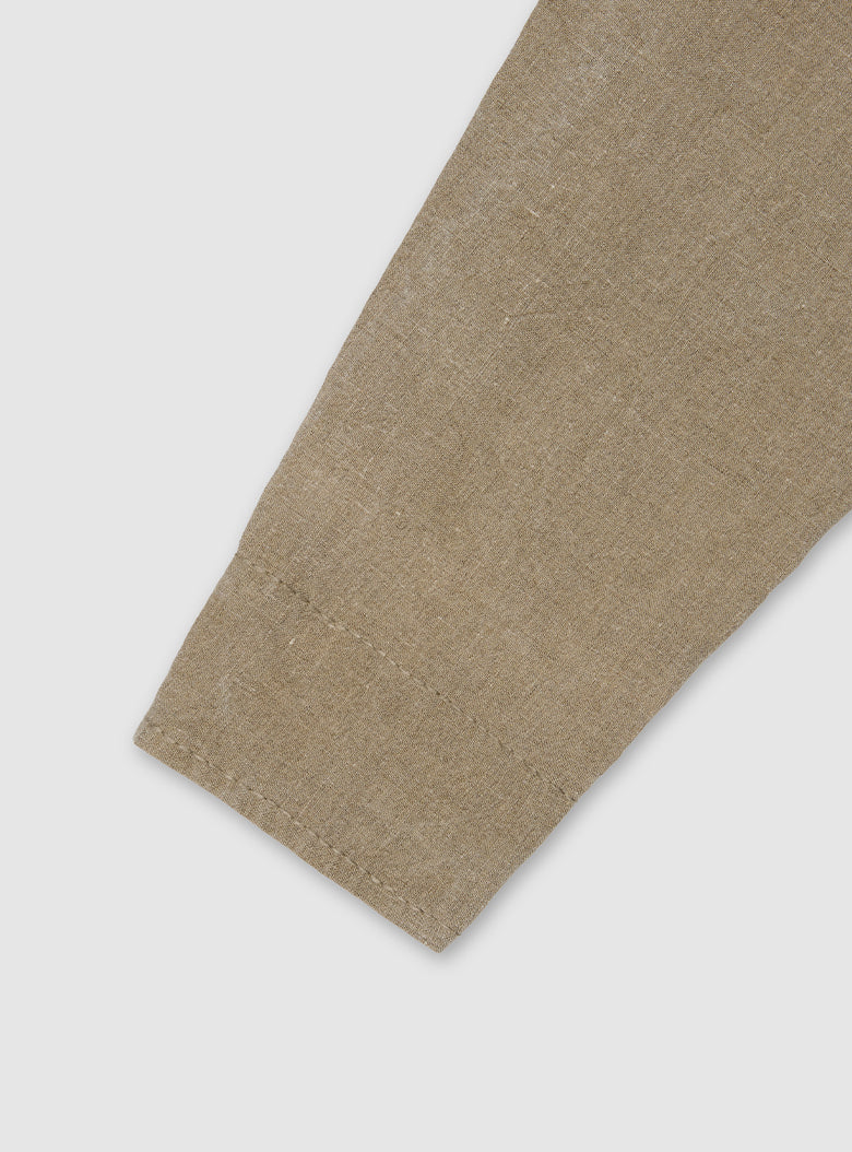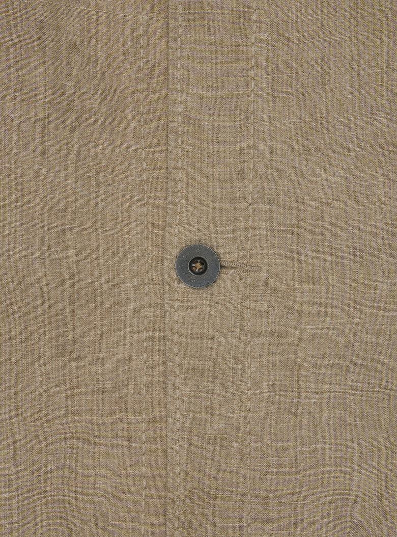 Made from vintage French military sheet fabric, featuring a low standing collar and large patch pockets with a subtle aged character.