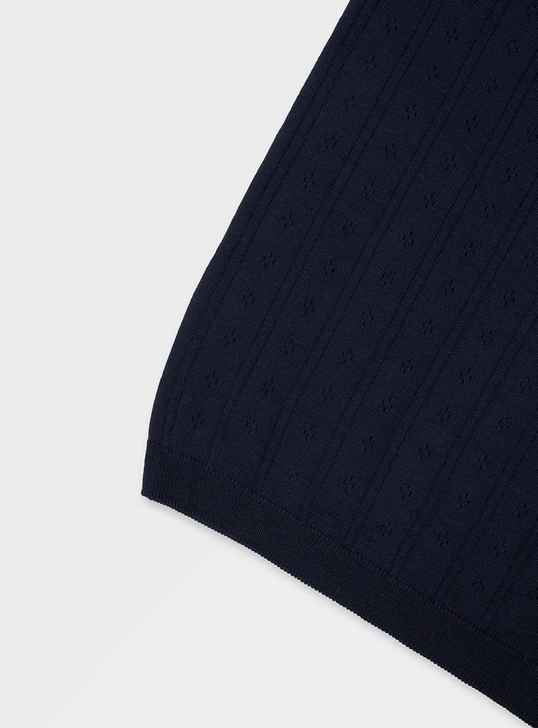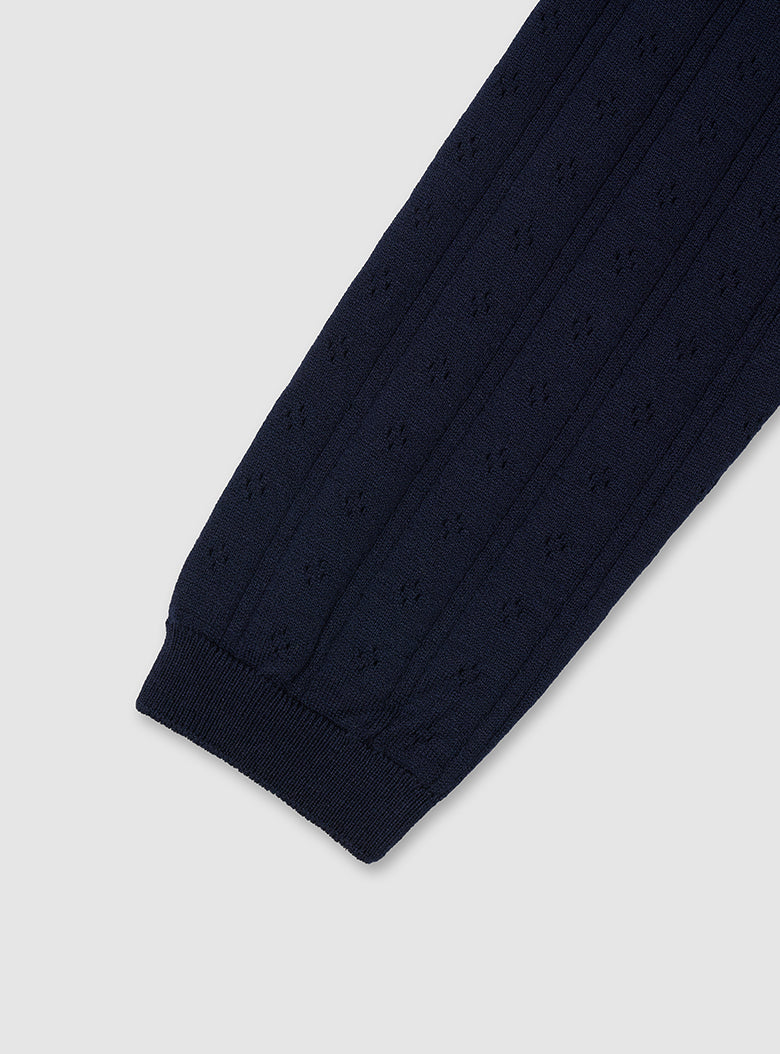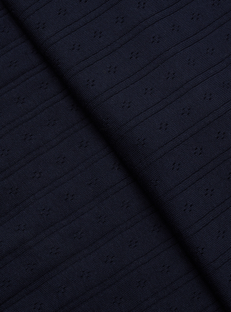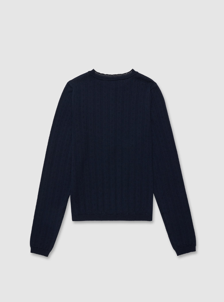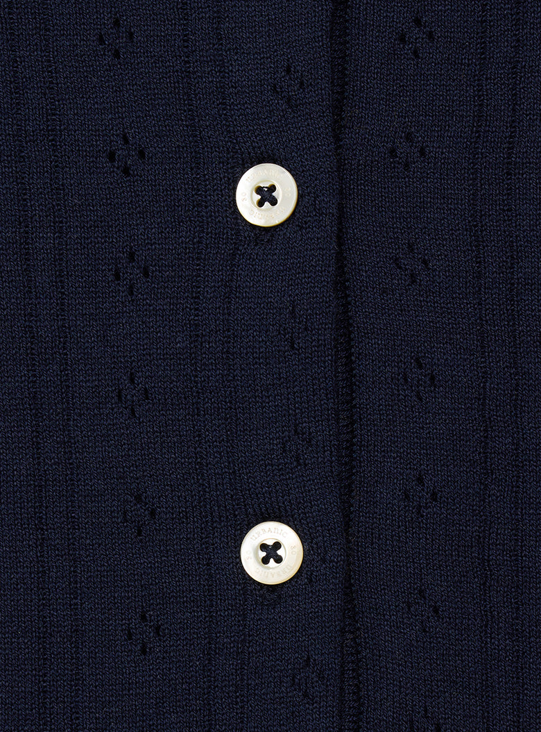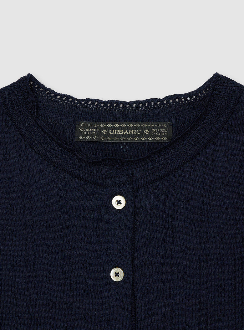 The Foret Button Knit evokes a romantic mood with intricate pointelle detailing and delicate ruffled lace accents. Crafted from a lightweight, soft blend of 70% cotton and 30% silk, it offers comfort without heaviness. The subtle sheen of silk lends sophistication, ensuring the knit feels refined and polished rather than overly delicate or lingerie-like.