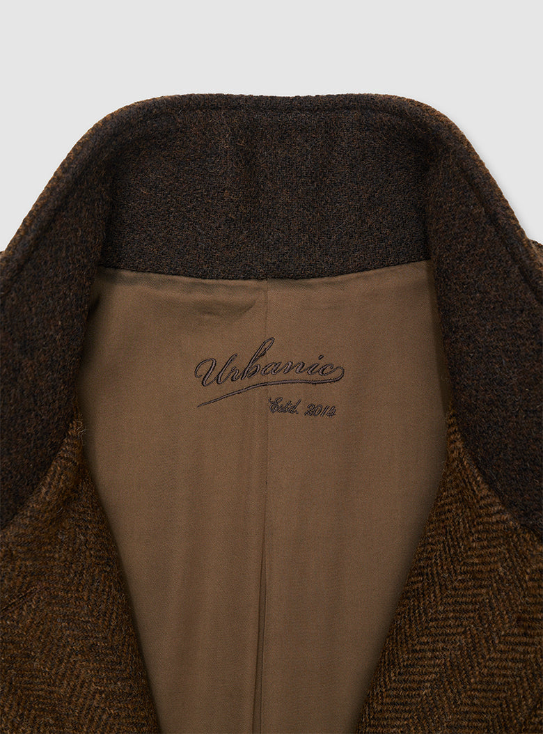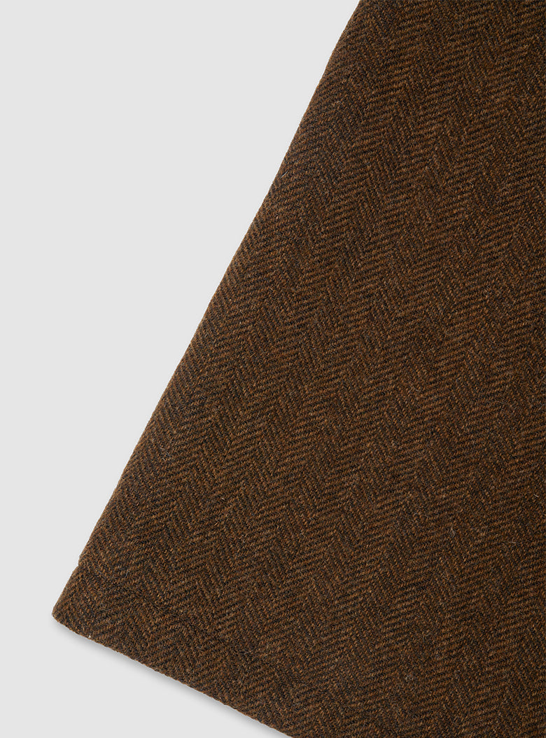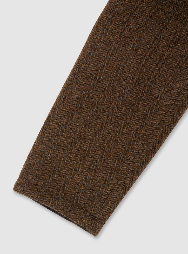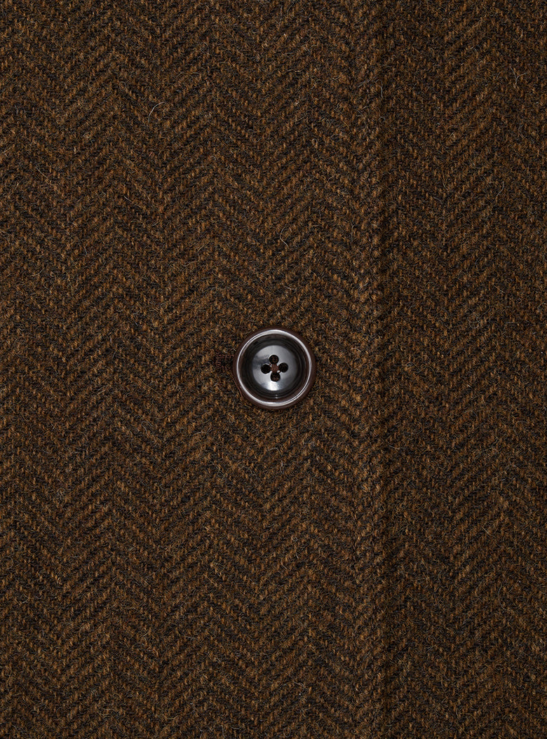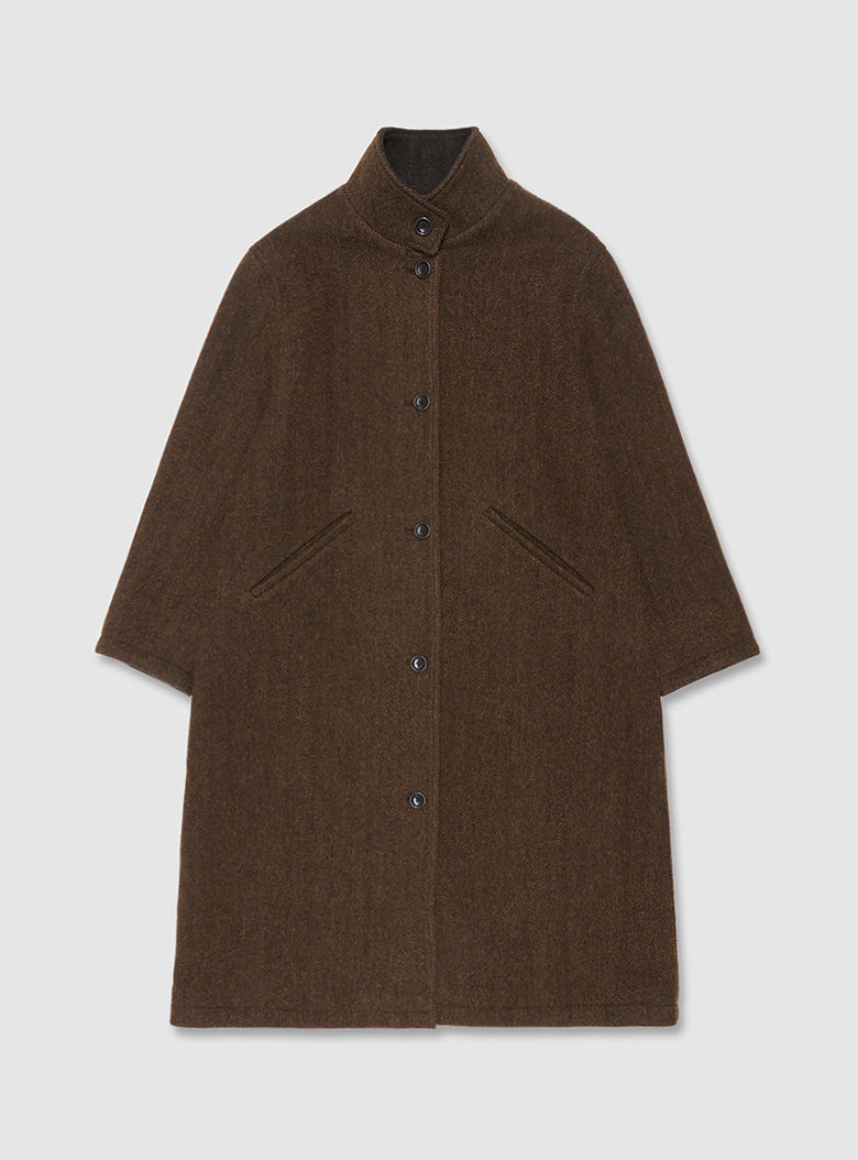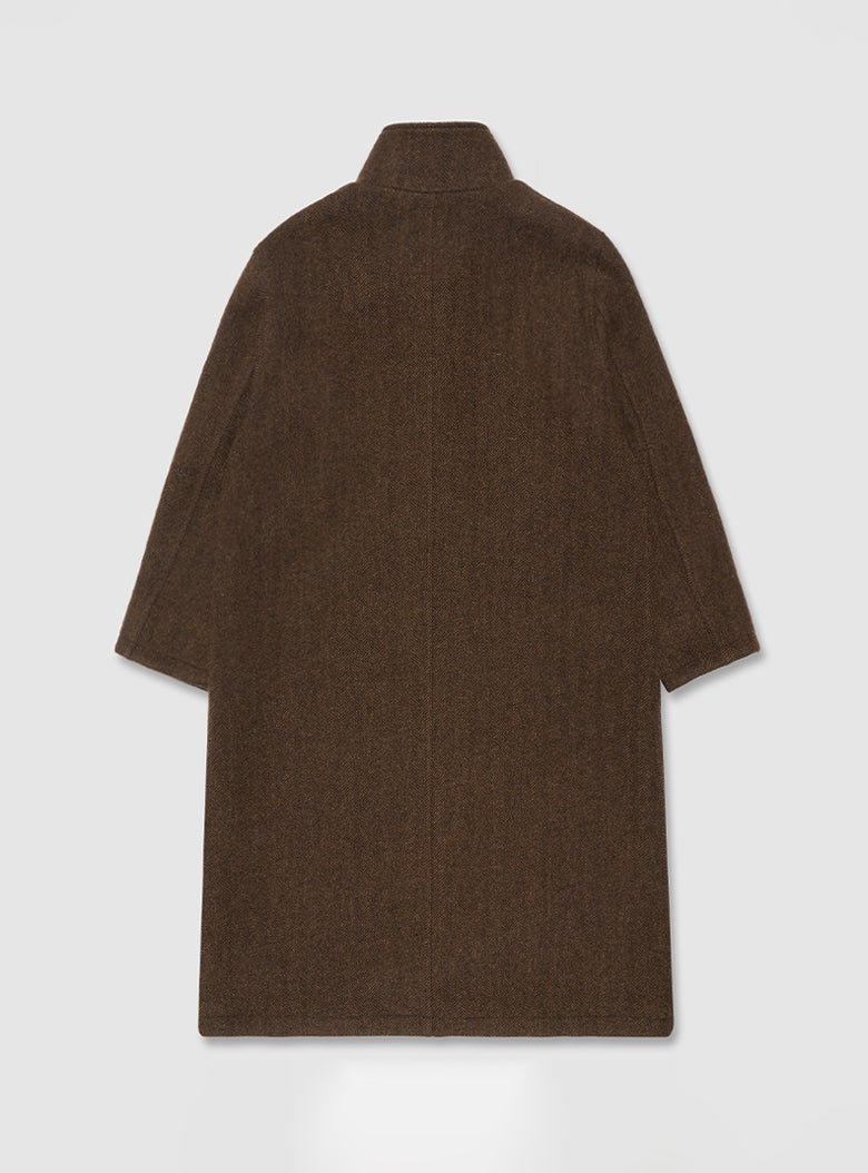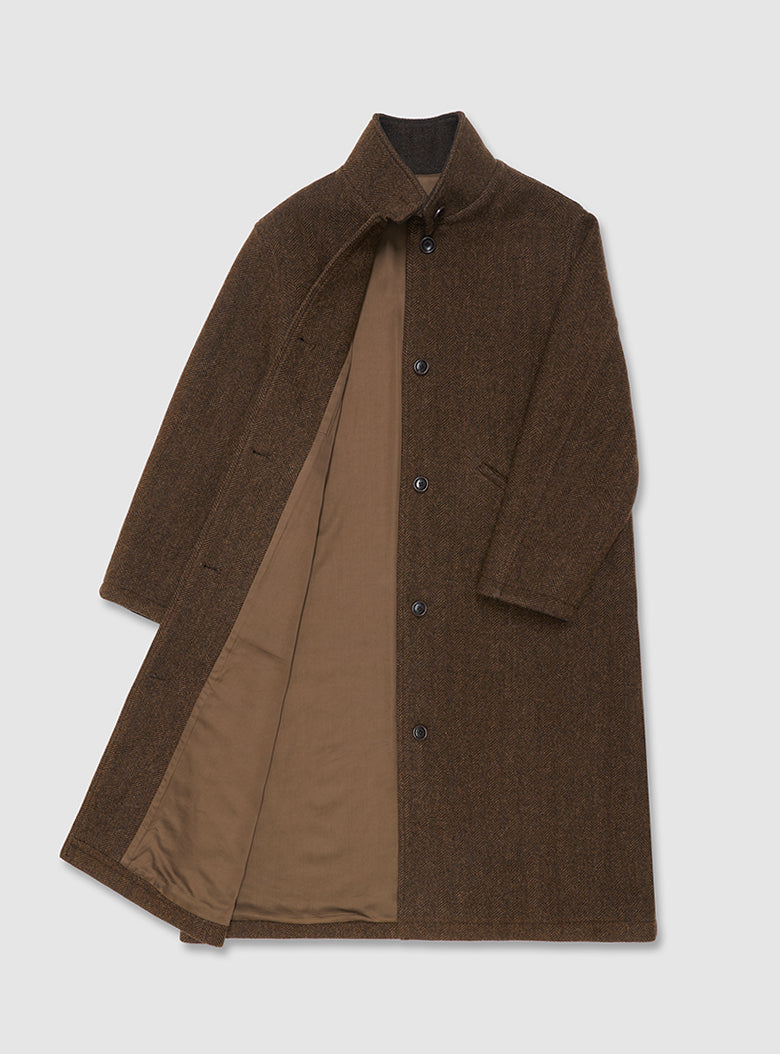 A long coat made from wool fabric featuring a brown-toned herringbone pattern. The double-faced material offers warmth without the weight, and the cuffs can be folded to reveal a tone-on-tone contrast.
