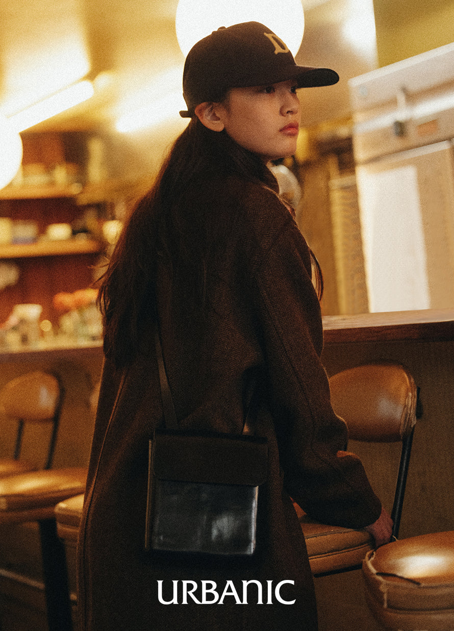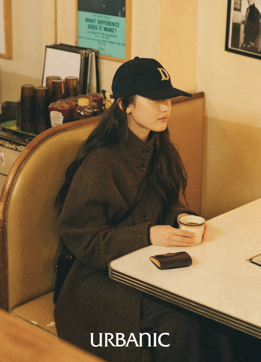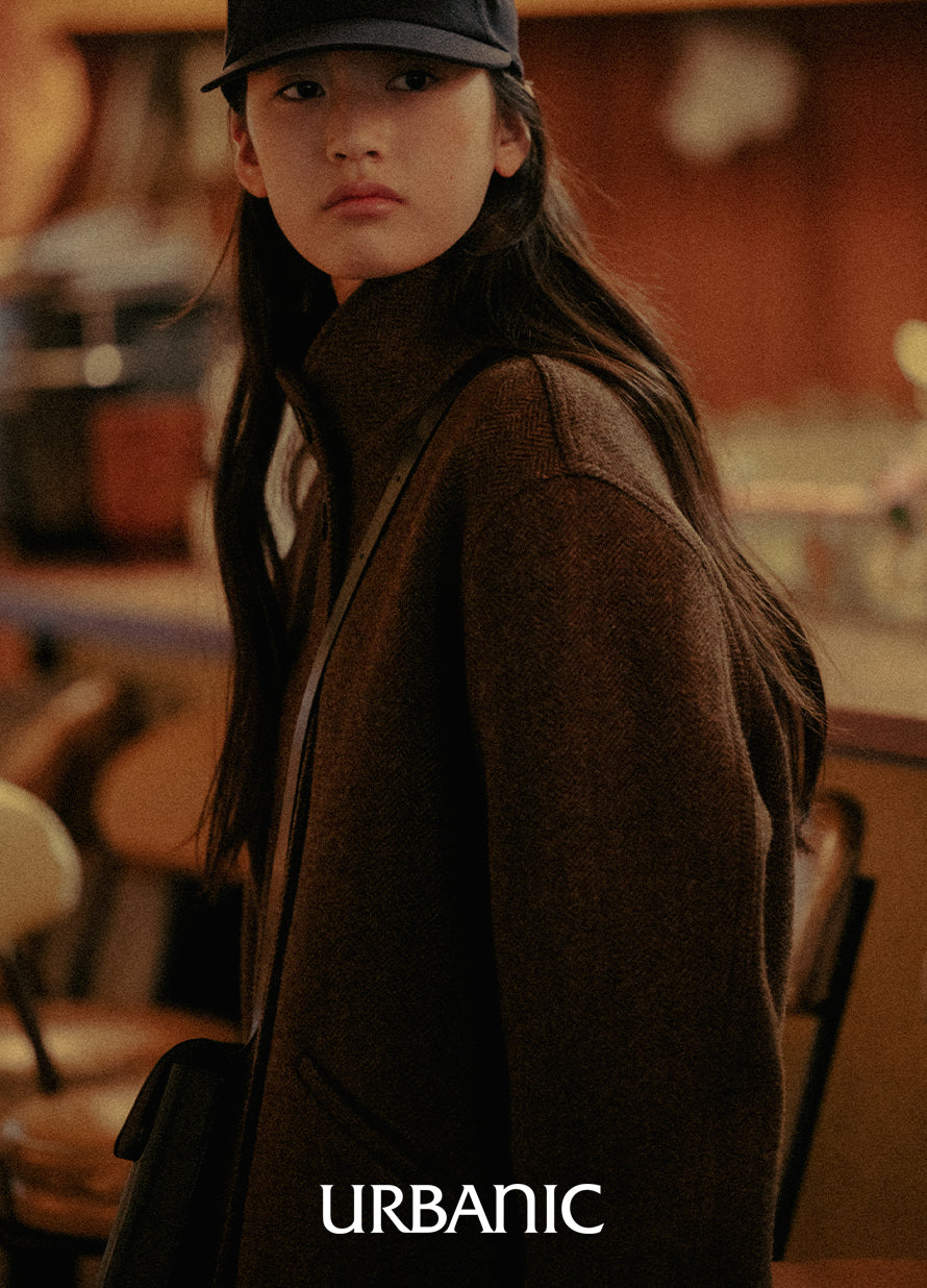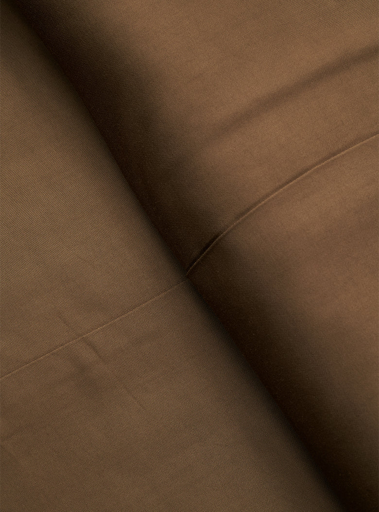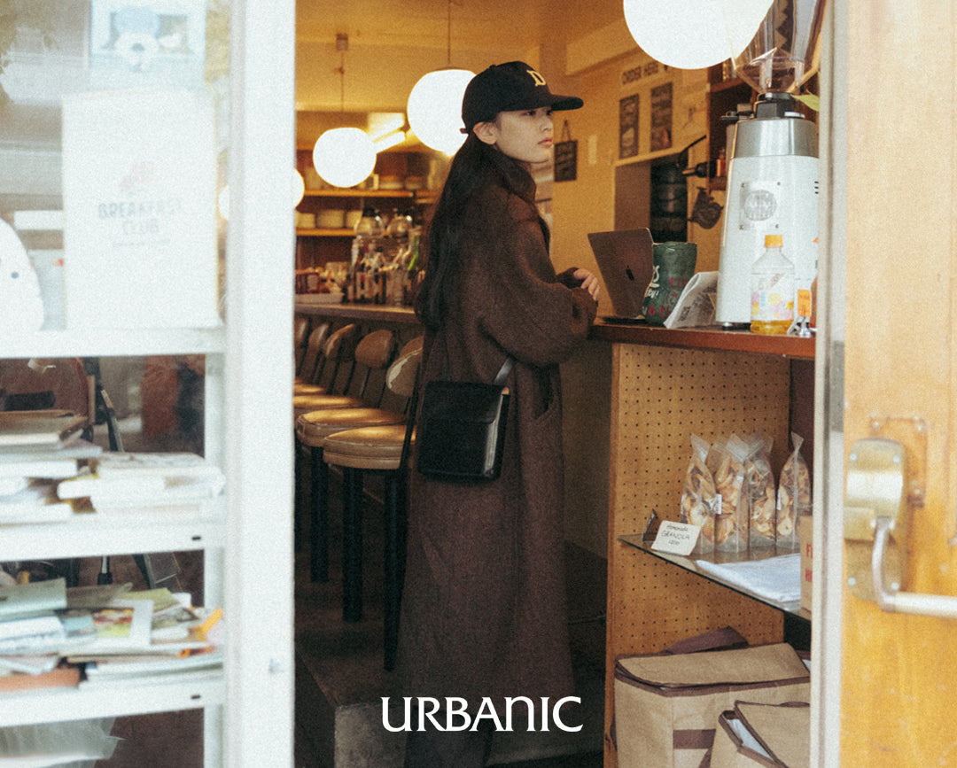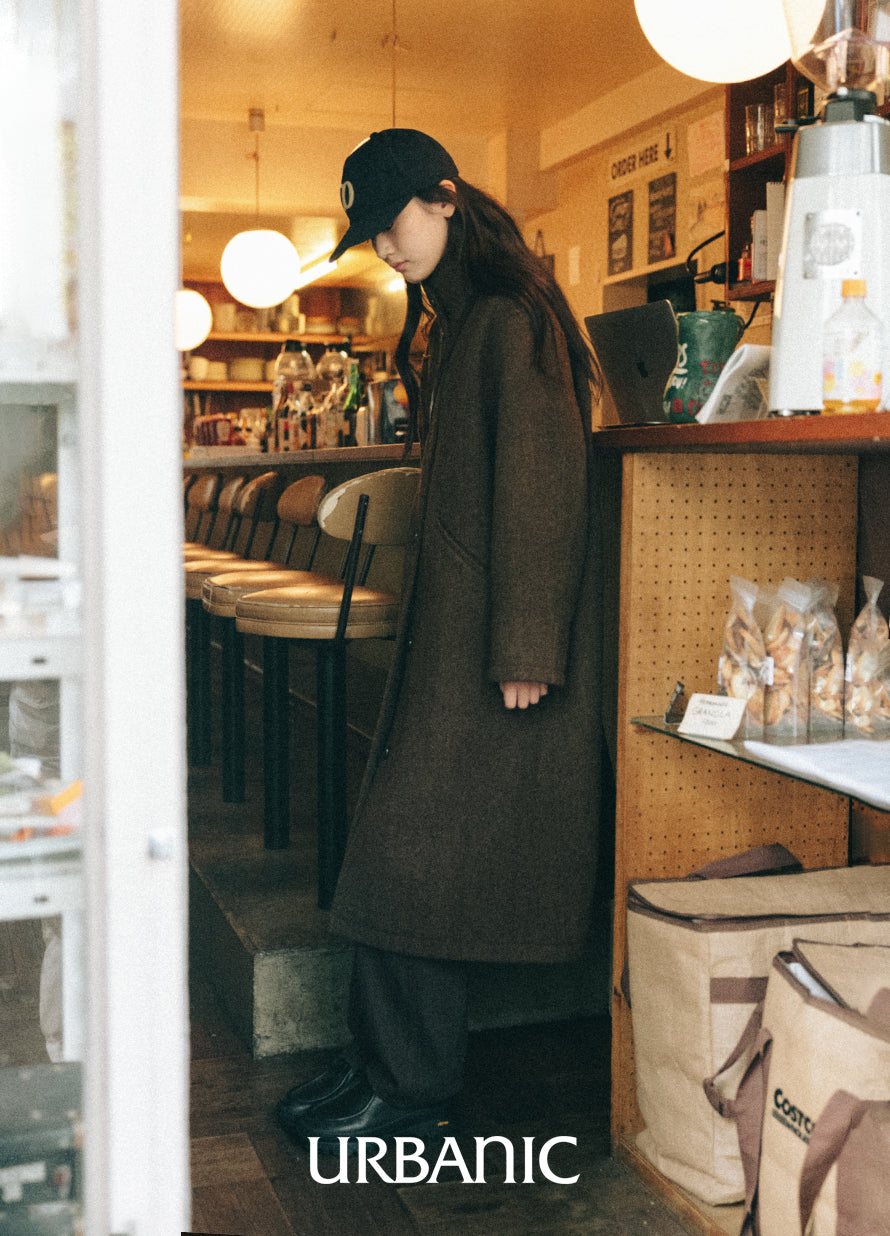 A long coat made from wool fabric featuring a brown-toned herringbone pattern. The double-faced material offers warmth without the weight, and the cuffs can be folded to reveal a tone-on-tone contrast.