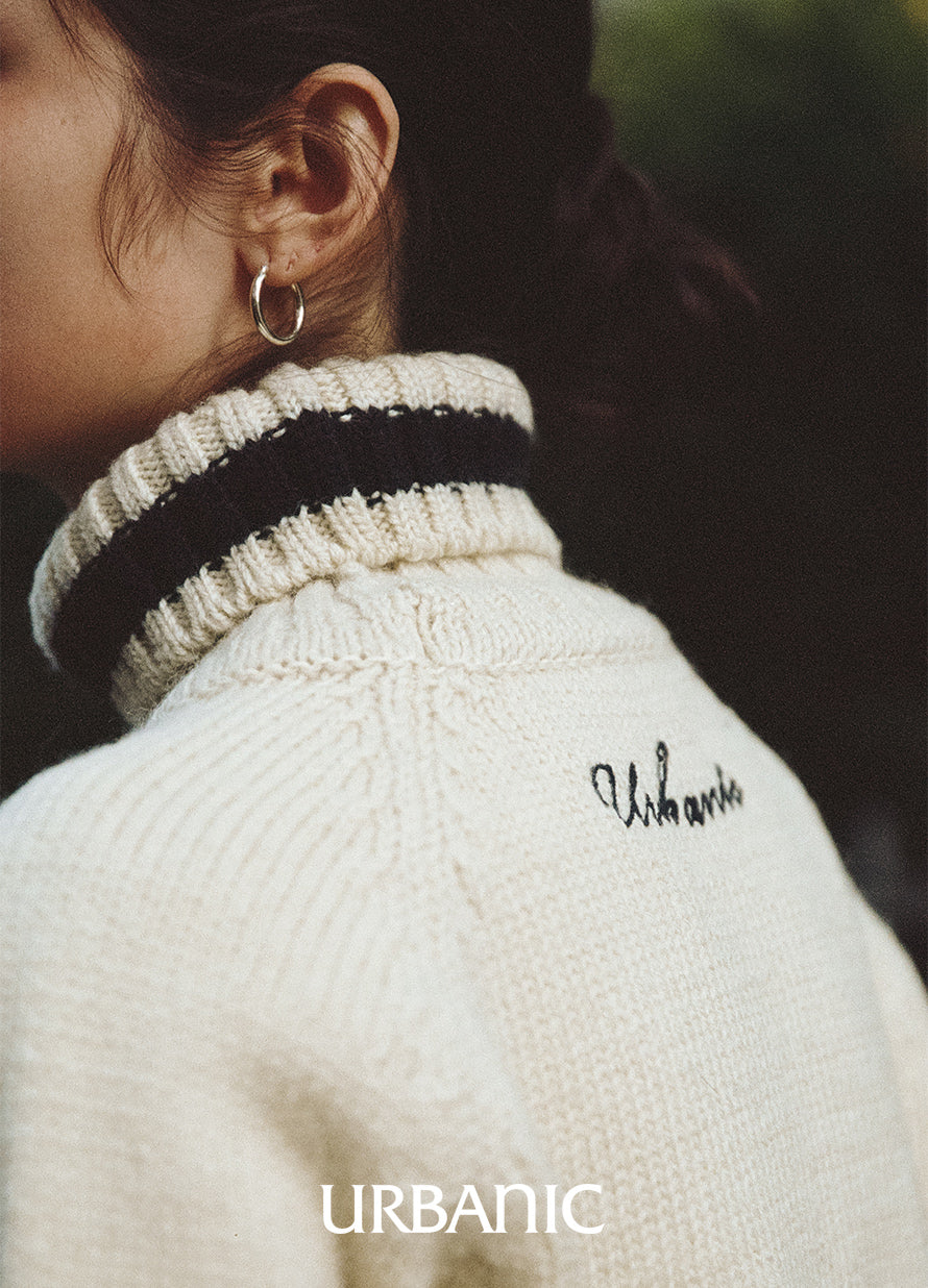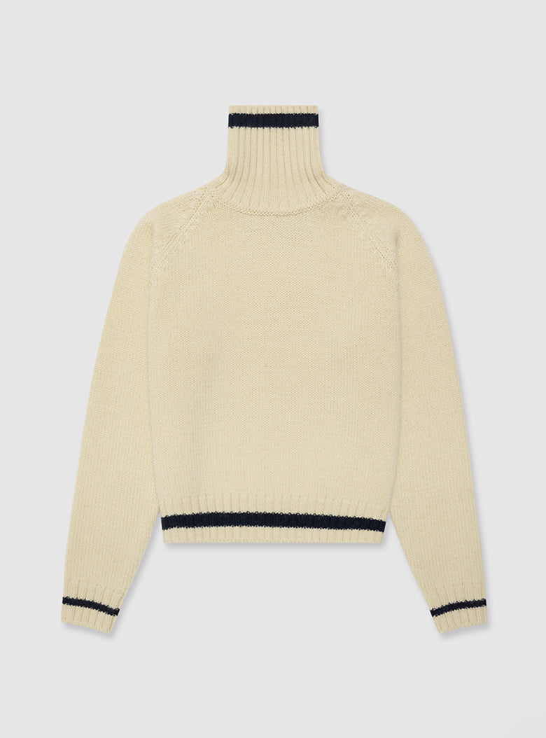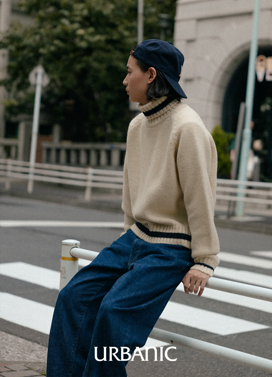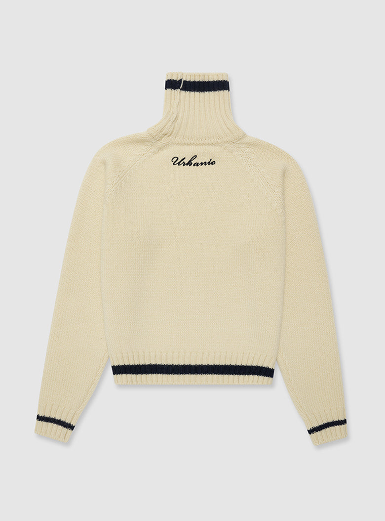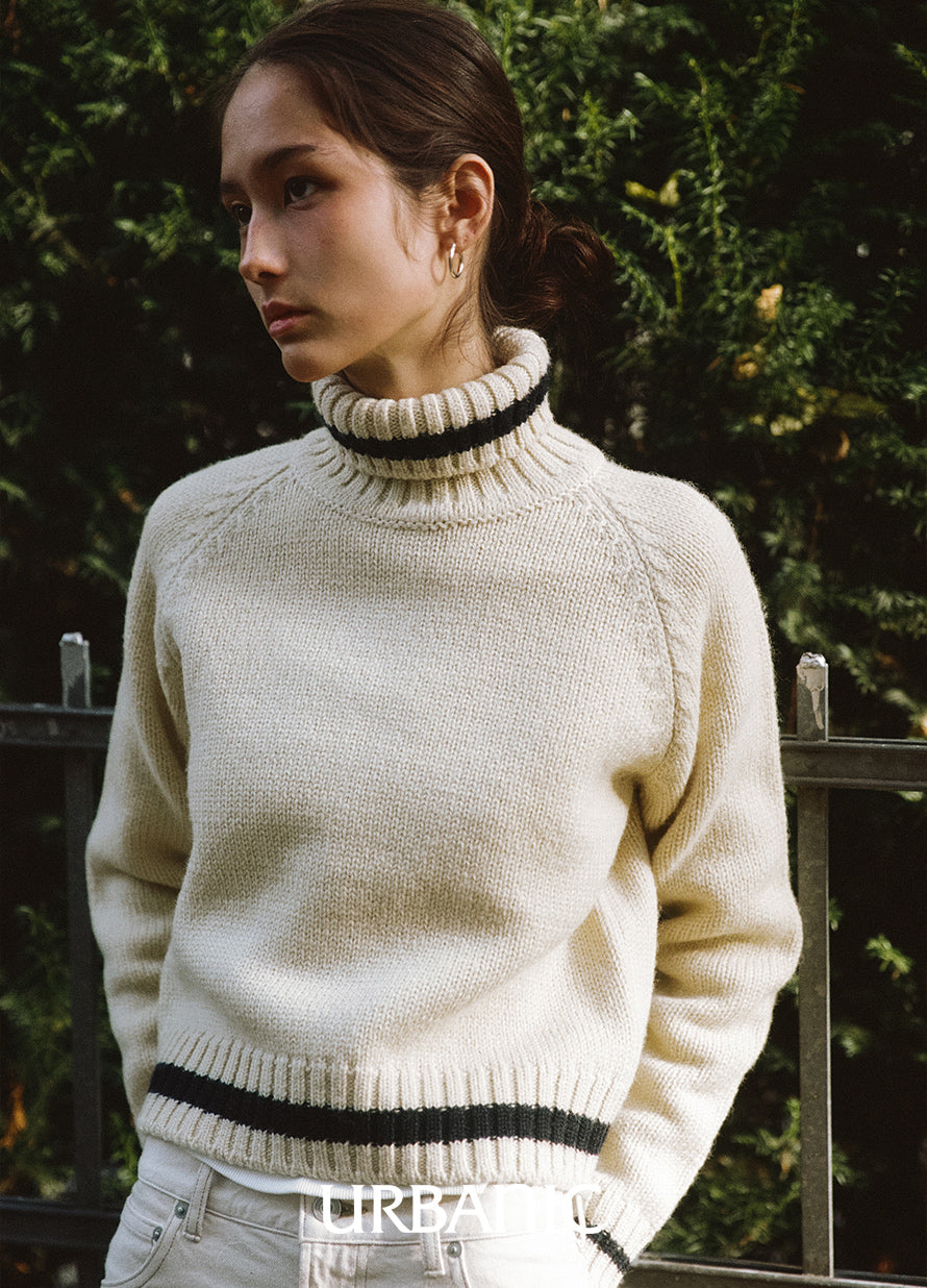 A chunky turtleneck knit crafted with cream-colored wool yarn for a vintage vibe. It features navy striped accents on the turtleneck, hemline, and cuffs, making it suitable for both men and women.