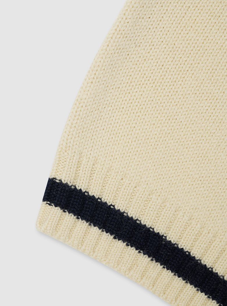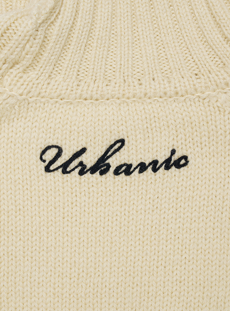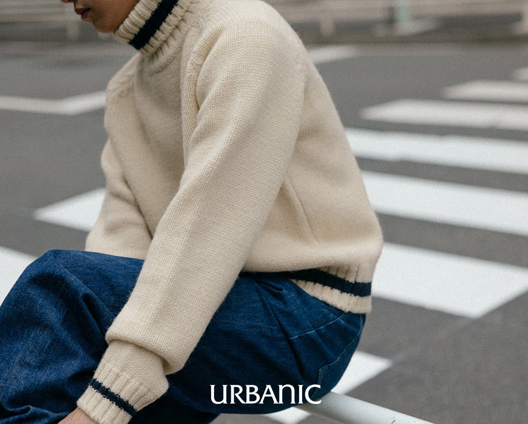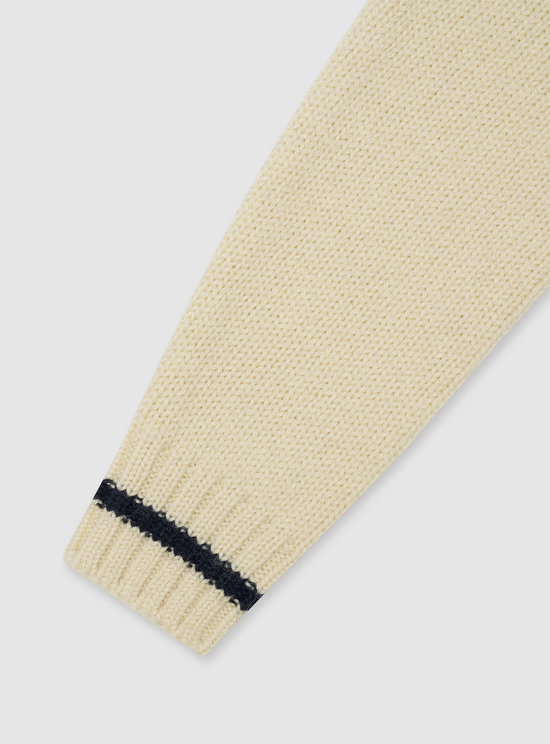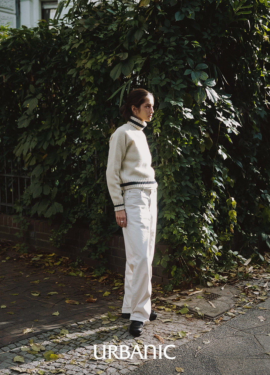 A chunky turtleneck knit crafted with cream-colored wool yarn for a vintage vibe. It features navy striped accents on the turtleneck, hemline, and cuffs, making it suitable for both men and women.