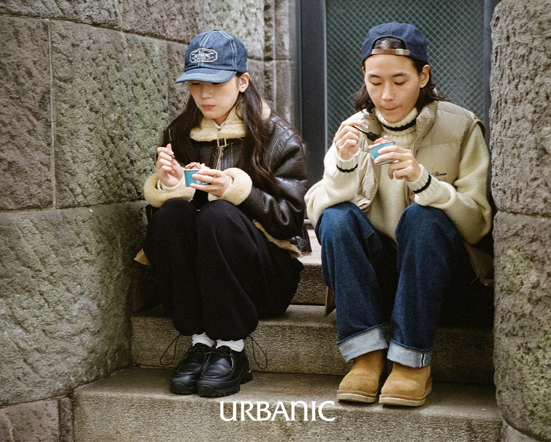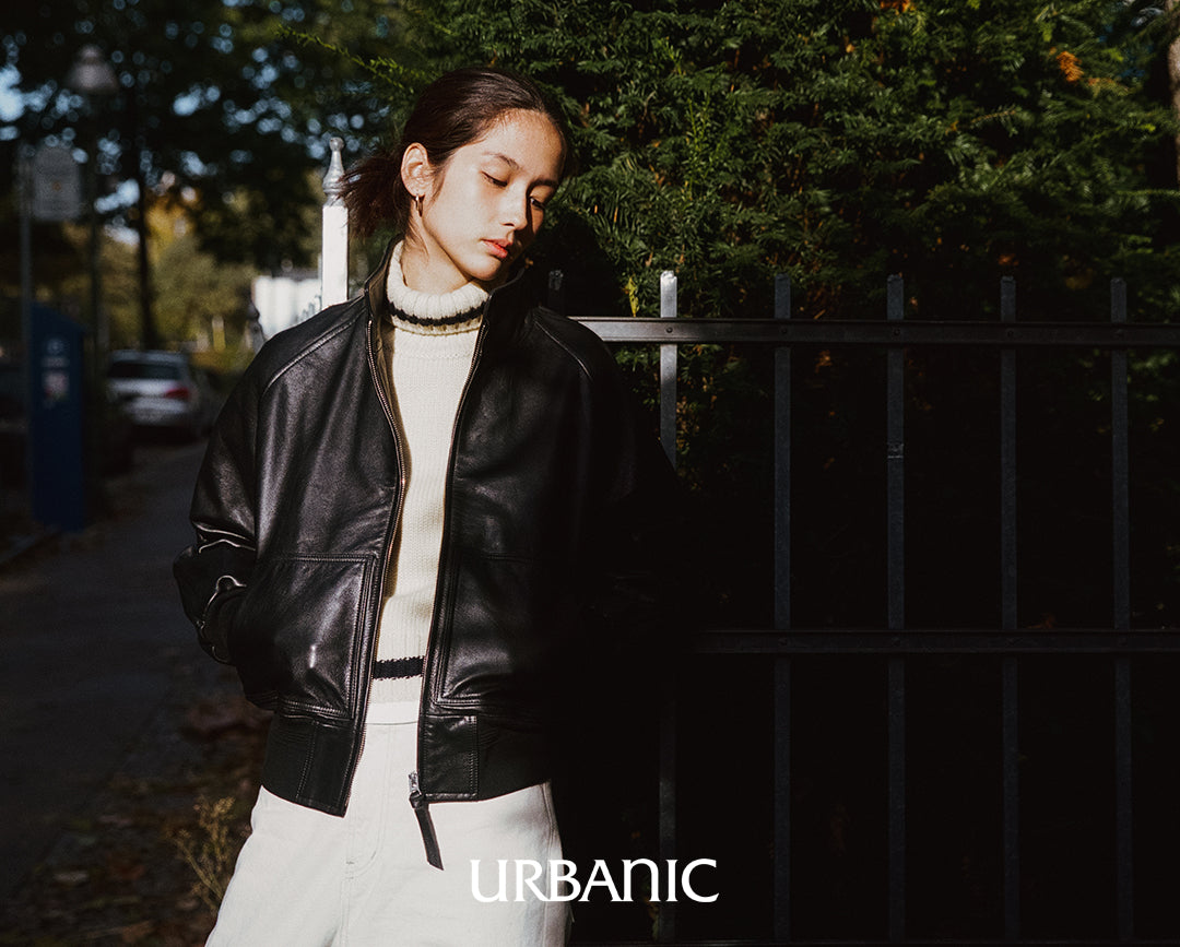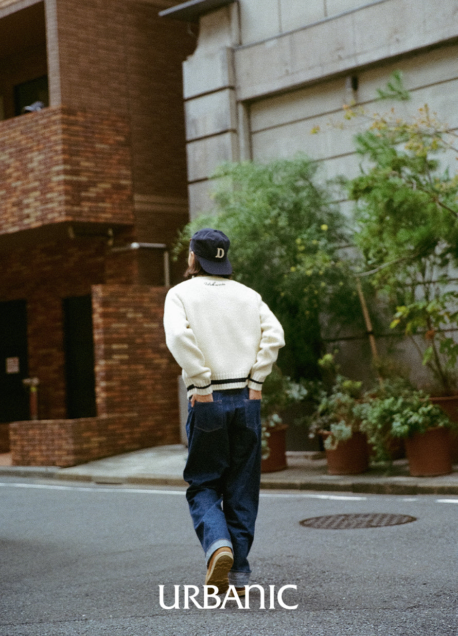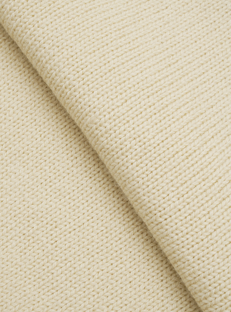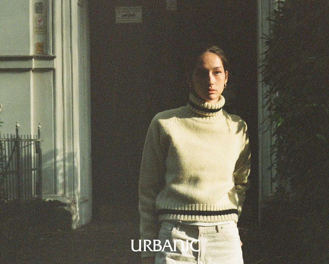 A chunky turtleneck knit crafted with cream-colored wool yarn for a vintage vibe. It features navy striped accents on the turtleneck, hemline, and cuffs, making it suitable for both men and women.