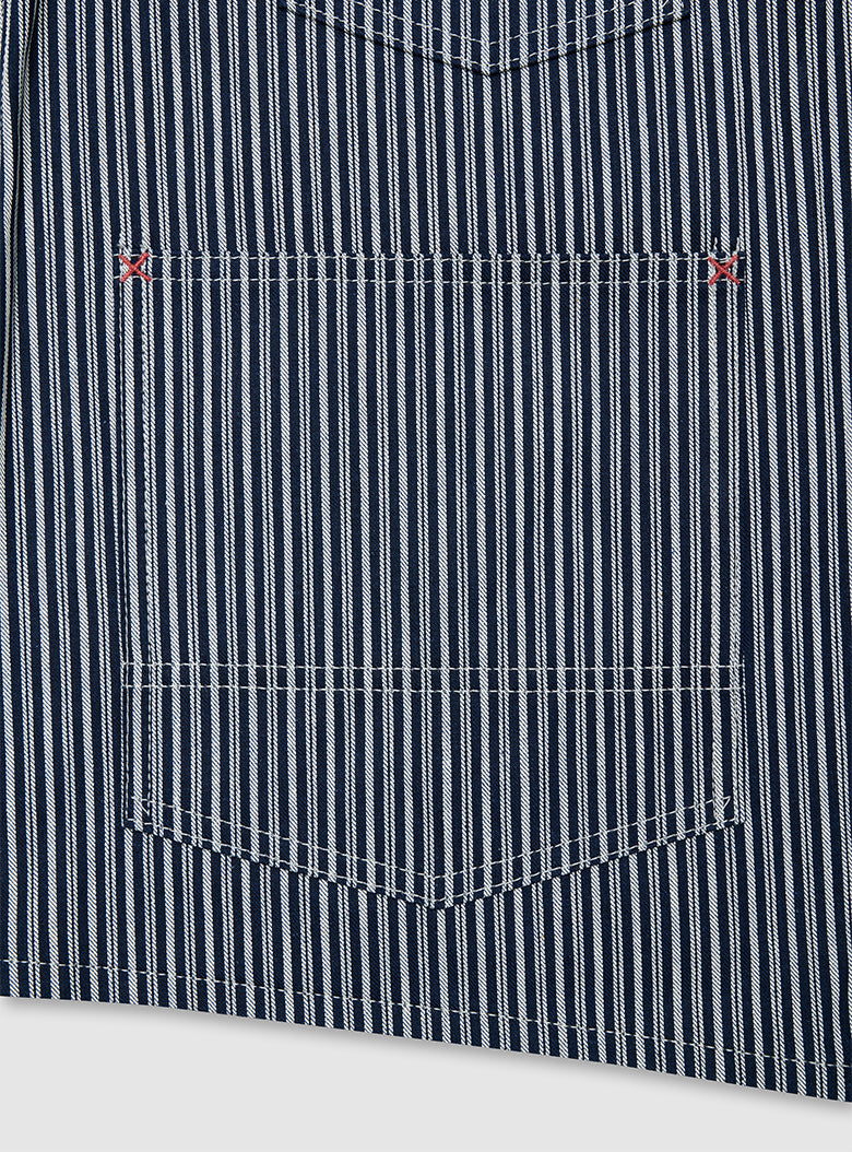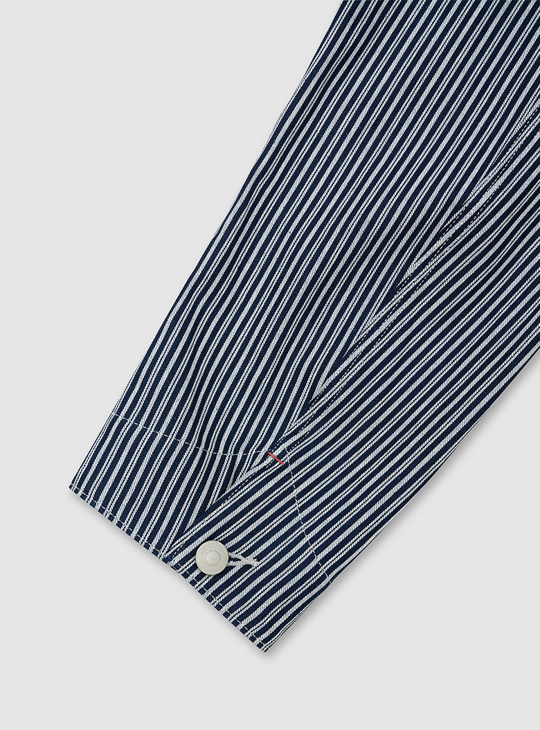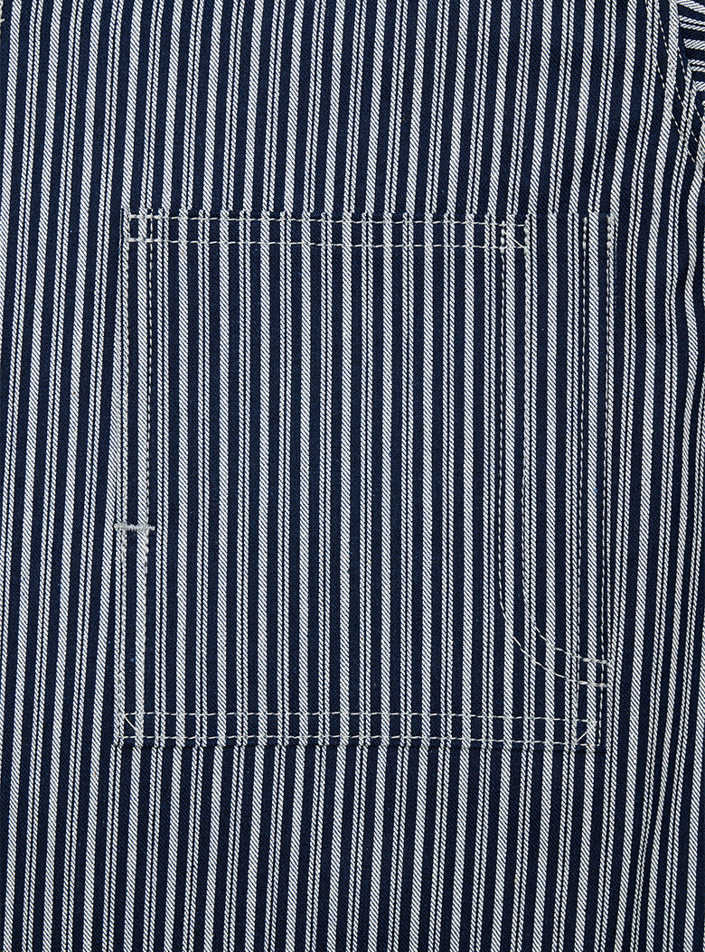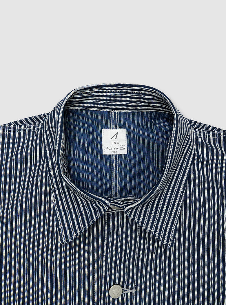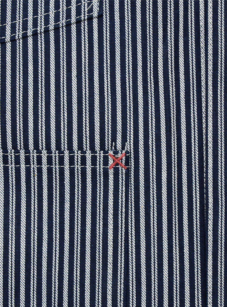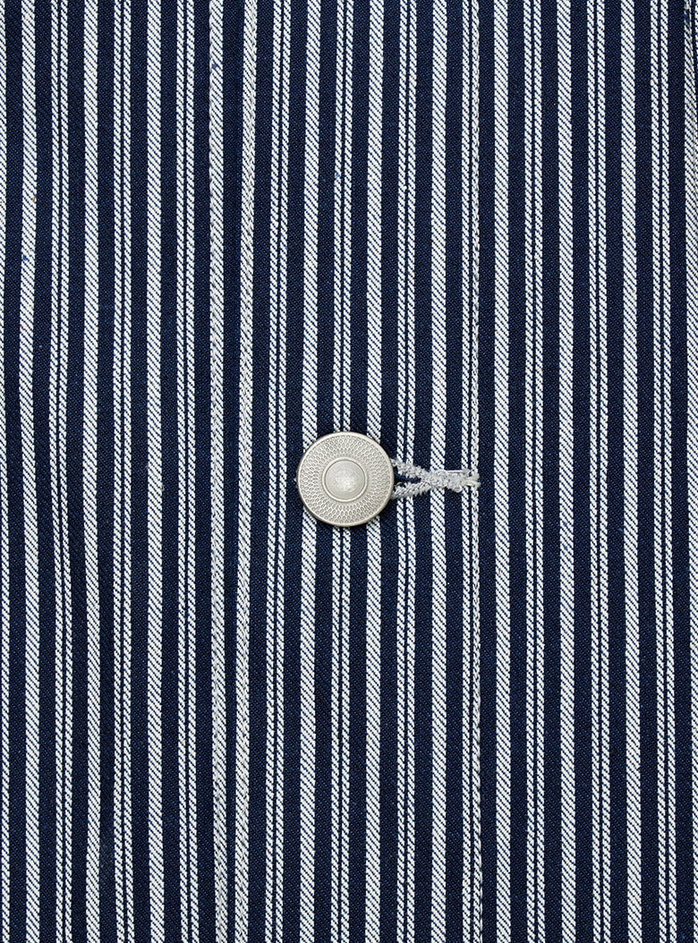 This is a Hickory Coverall Jacket made in collaboration with Anatomica. The classic workwear style of the Hickory Coverall Jacket, which becomes more vintage and stylish with each wear, is made from "Hickory" fabric, which has been favored as workwear since the late 19th century. The fabric is as sturdy as denim but lightweight and not stiff. Designed with a relaxed fit around the shoulders and chest, it has a shirt-like shape that comfortably covers the hips, making it perfect for layering like a jacket.