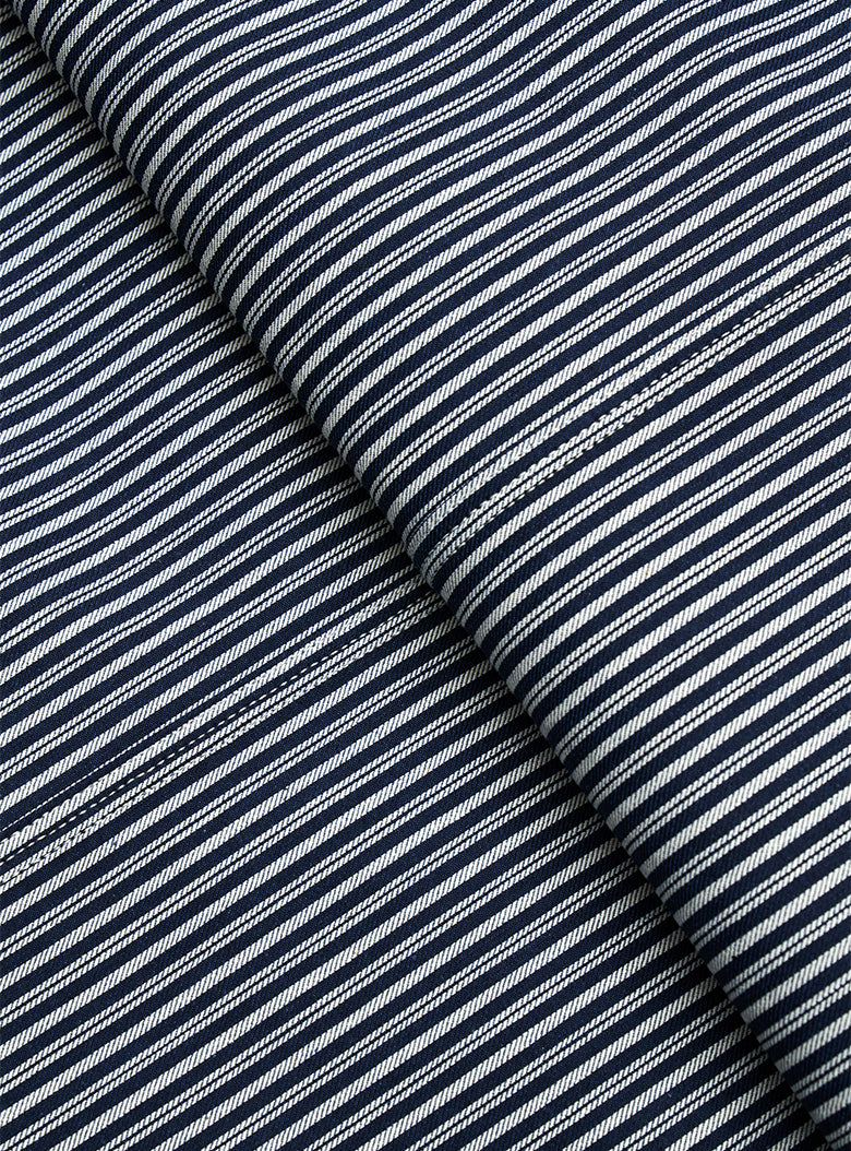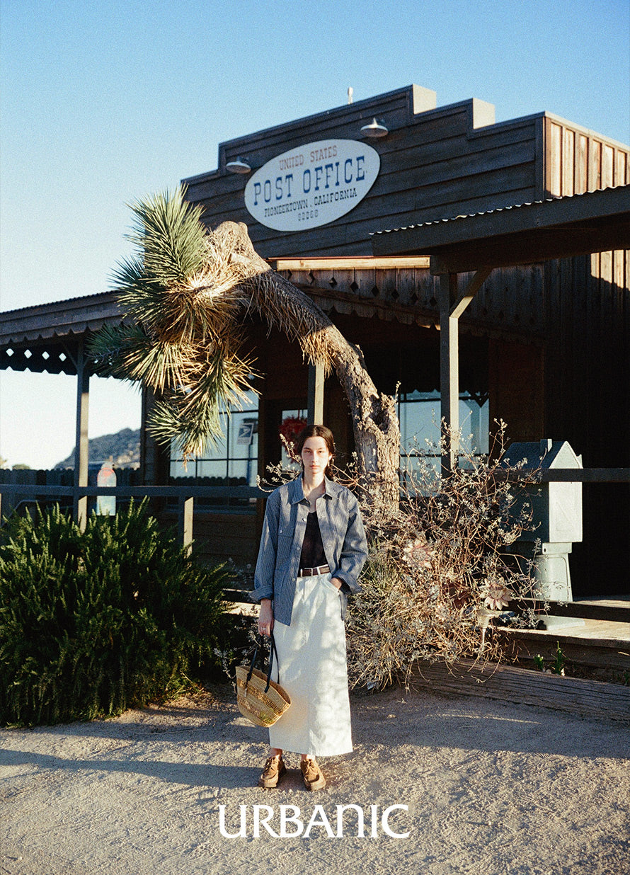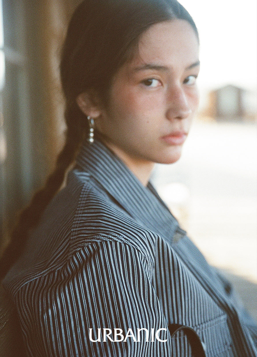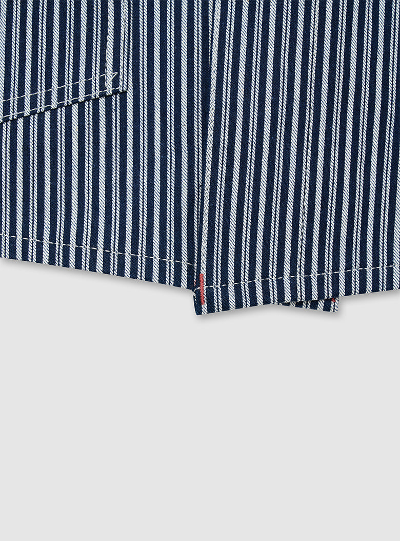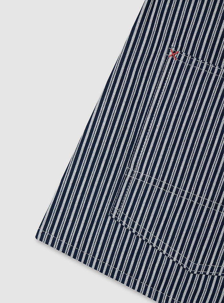 This is a Hickory Coverall Jacket made in collaboration with Anatomica. The classic workwear style of the Hickory Coverall Jacket, which becomes more vintage and stylish with each wear, is made from "Hickory" fabric, which has been favored as workwear since the late 19th century. The fabric is as sturdy as denim but lightweight and not stiff. Designed with a relaxed fit around the shoulders and chest, it has a shirt-like shape that comfortably covers the hips, making it perfect for layering like a jacket.