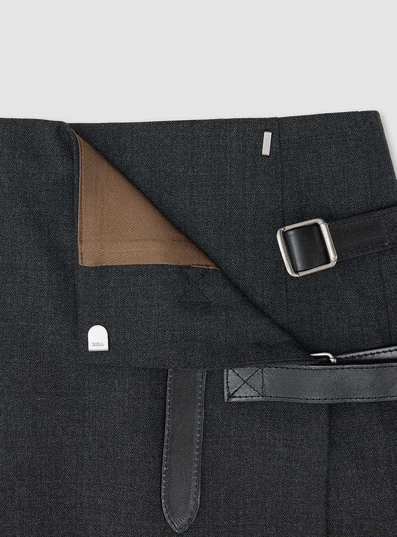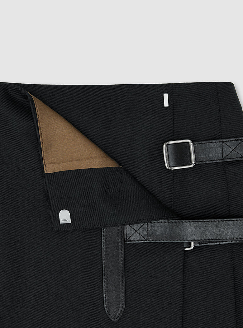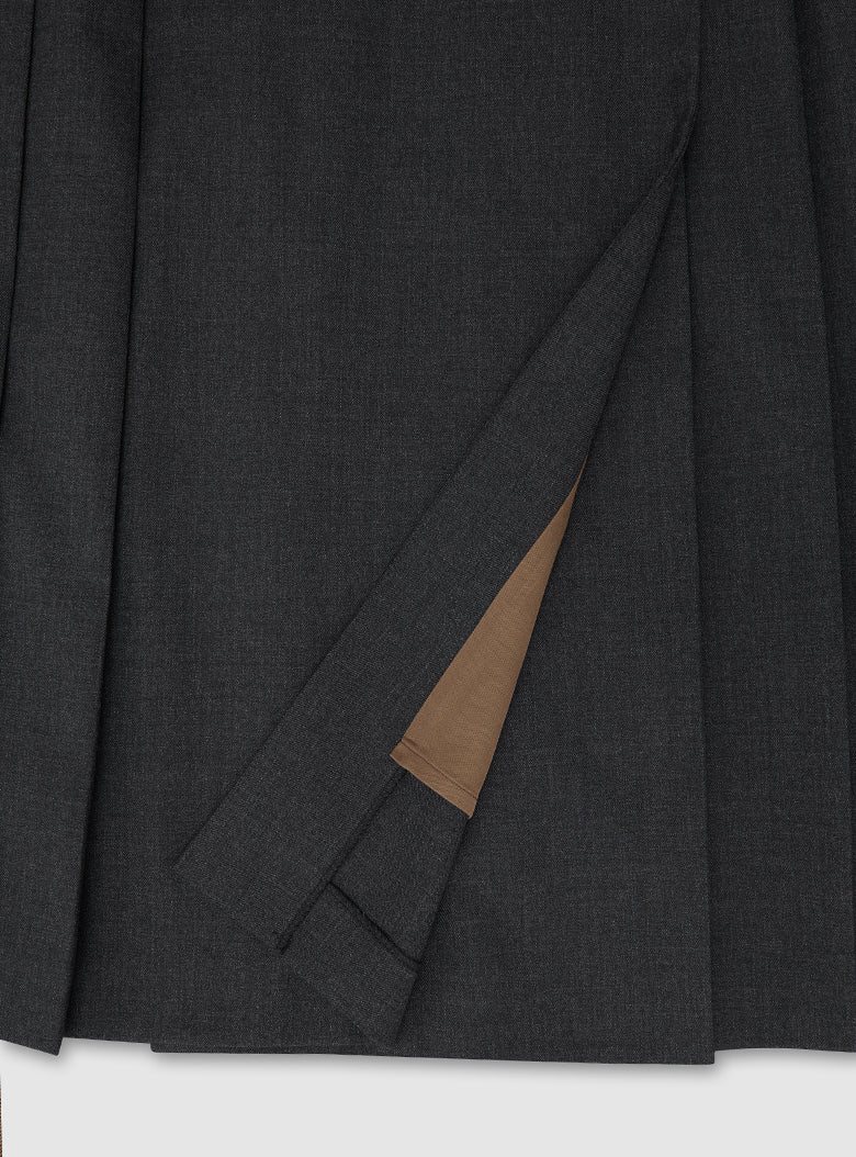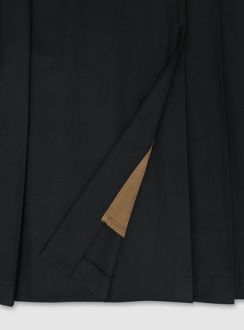 The Highland Skirt adapts the classic kilt silhouette for a contemporary women’s wardrobe. Made from a finely woven wool–polyester twill, the skirt falls with a clean, understated line and is finished with pleating inspired by traditional kilt construction.