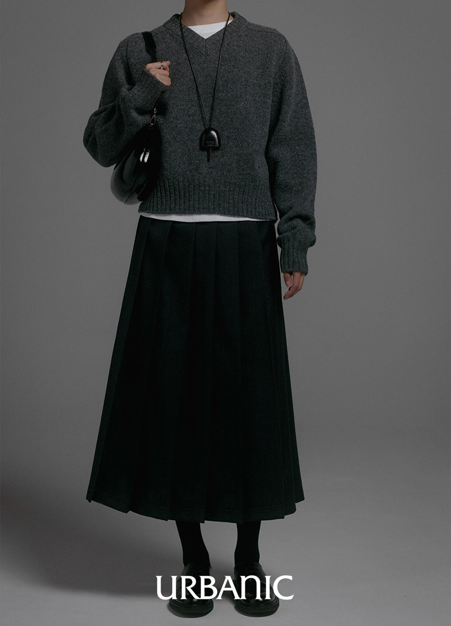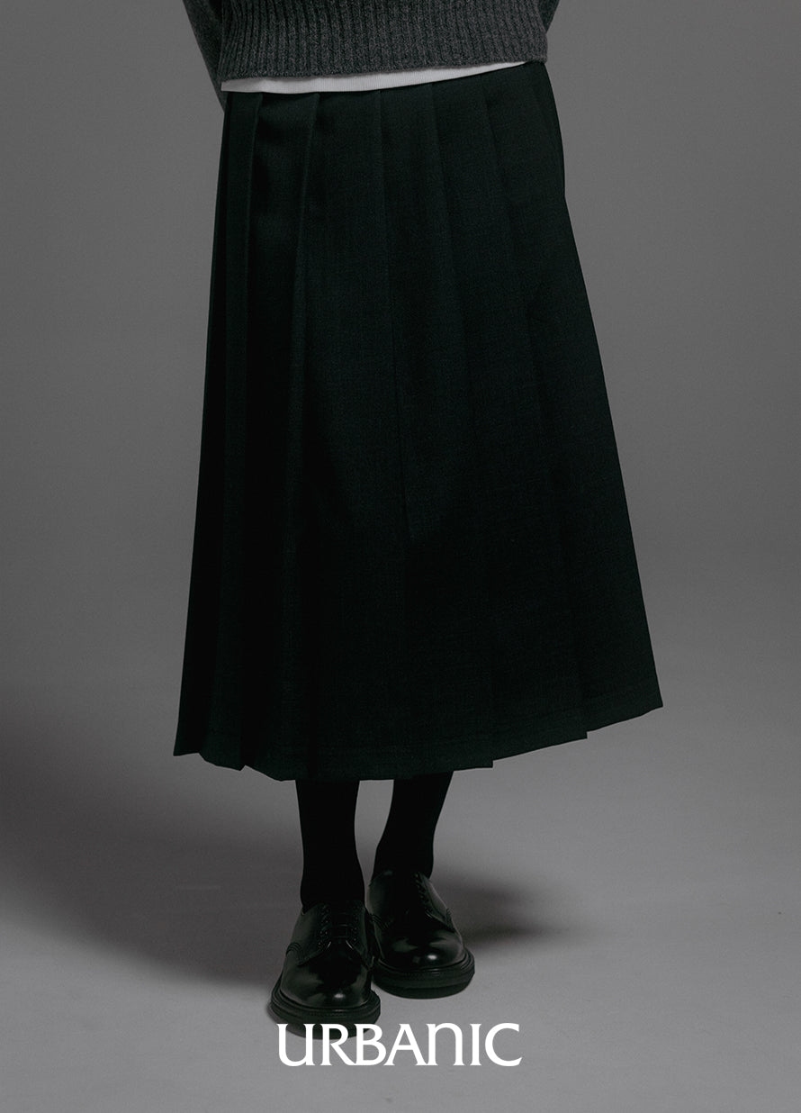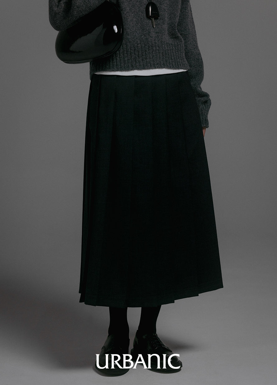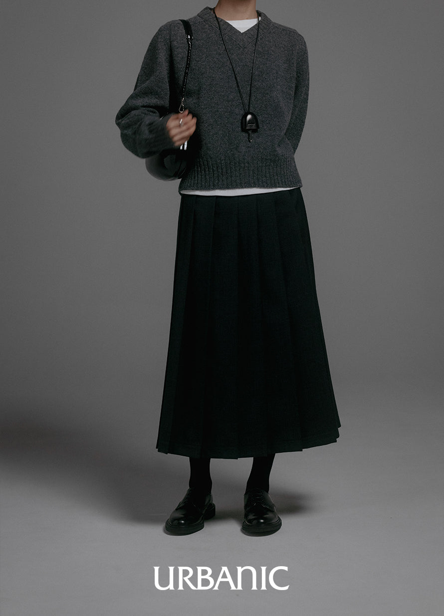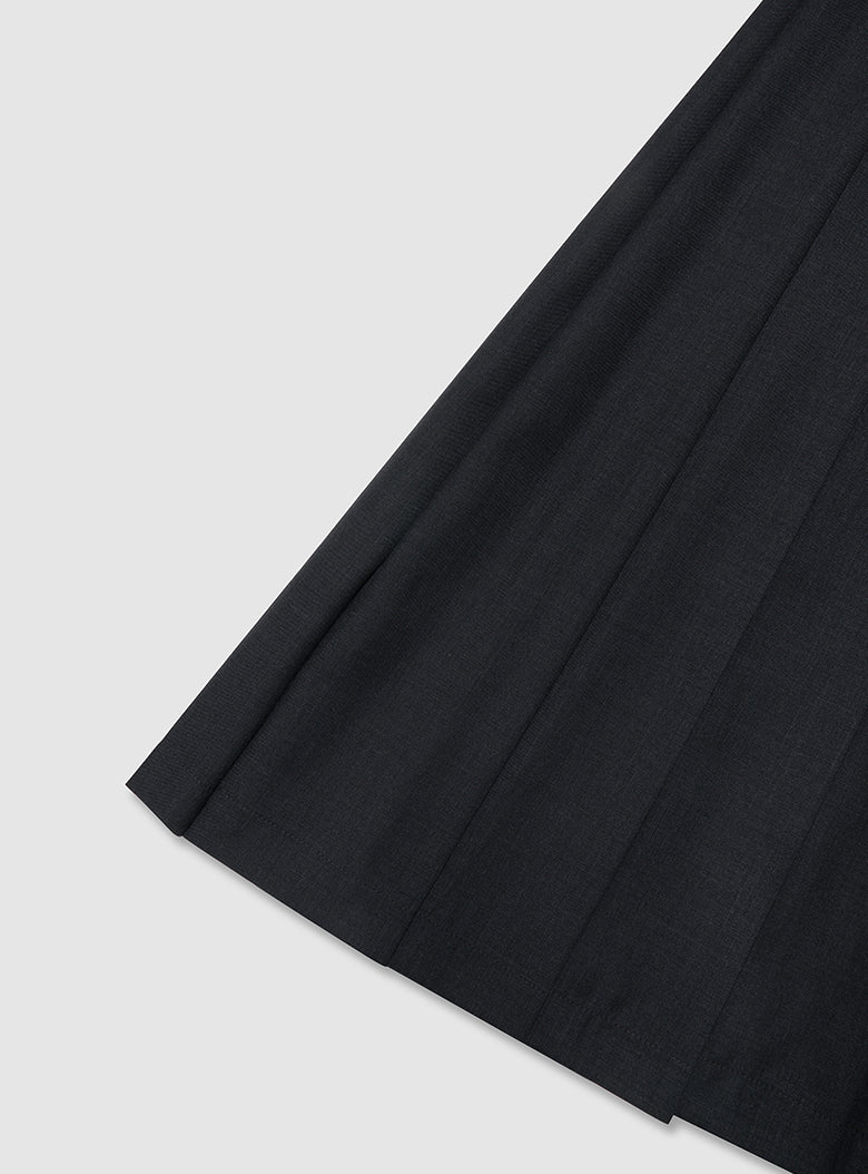 This charcoal-colored skirt features wide knife pleats and an A-line silhouette. It fastens with a side zipper and button, creating a classic mood when worn.