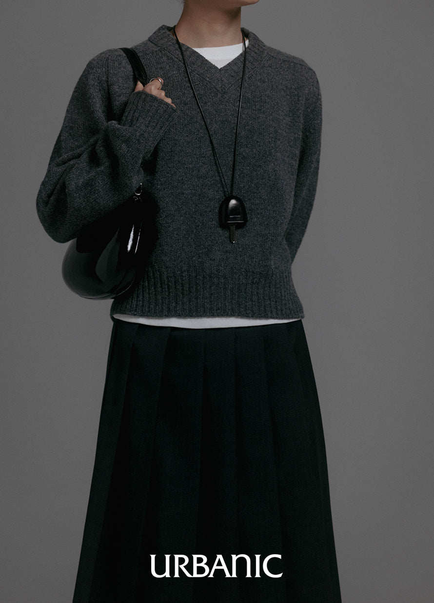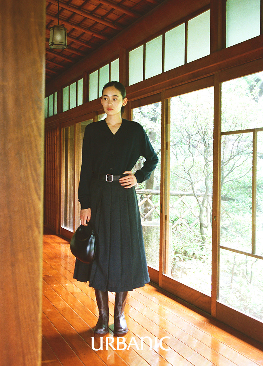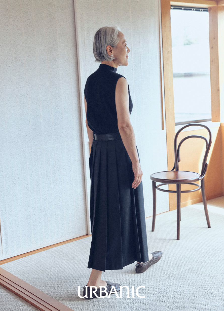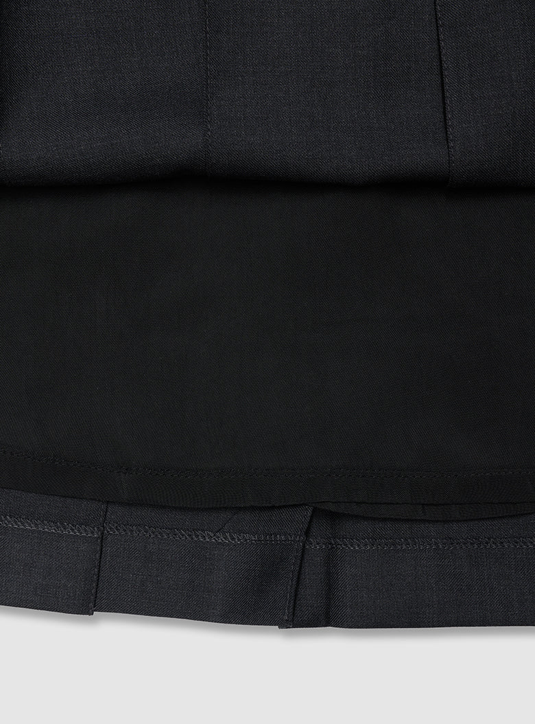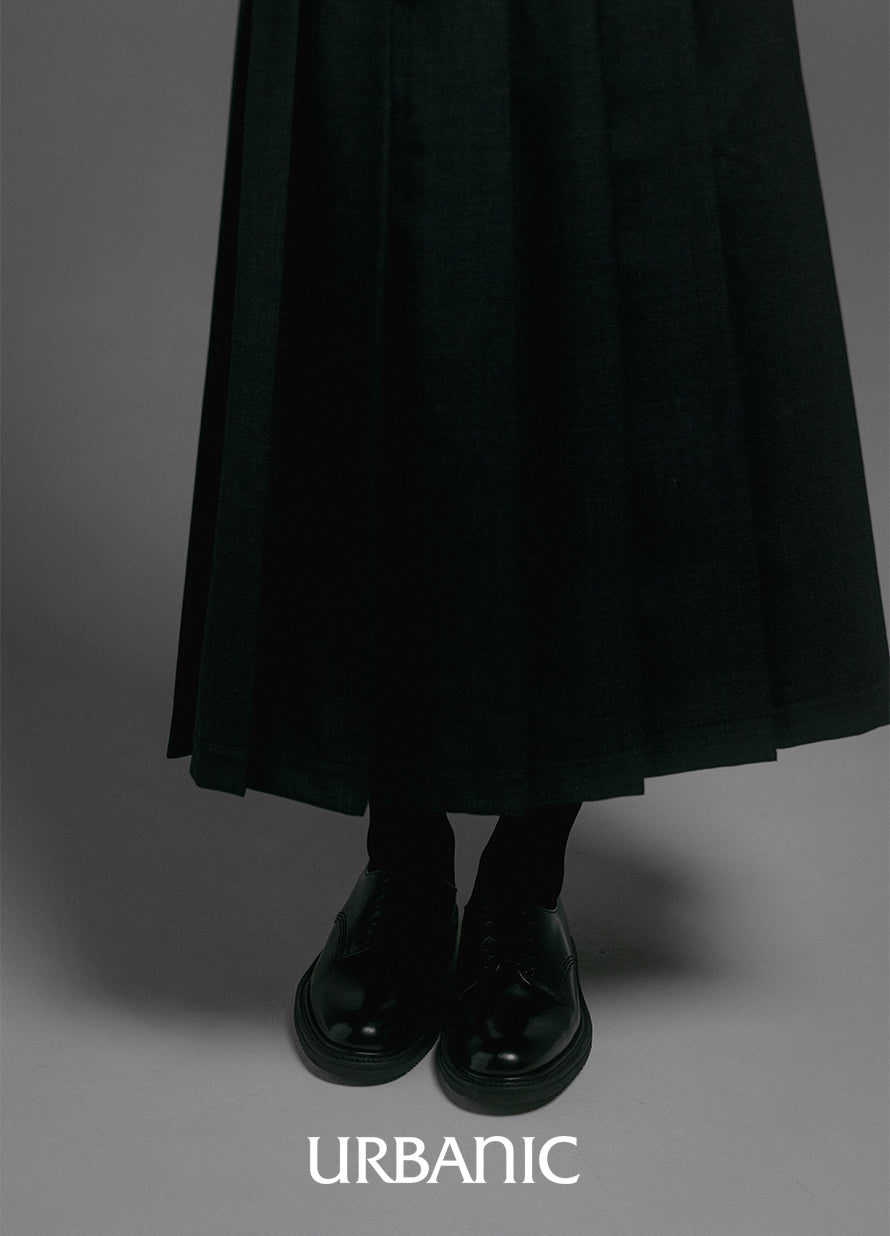 This charcoal-colored skirt features wide knife pleats and an A-line silhouette. It fastens with a side zipper and button, creating a classic mood when worn.