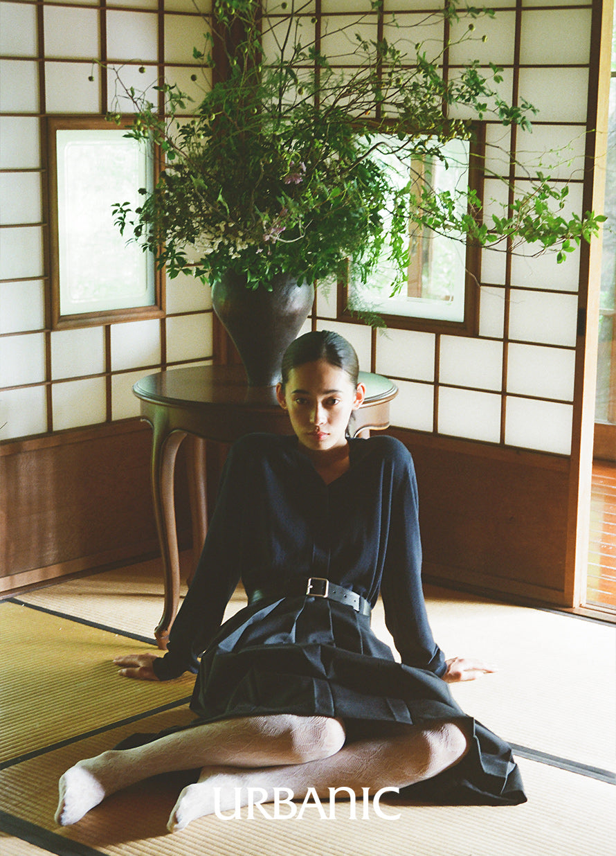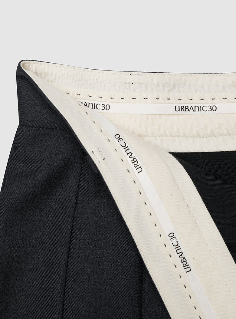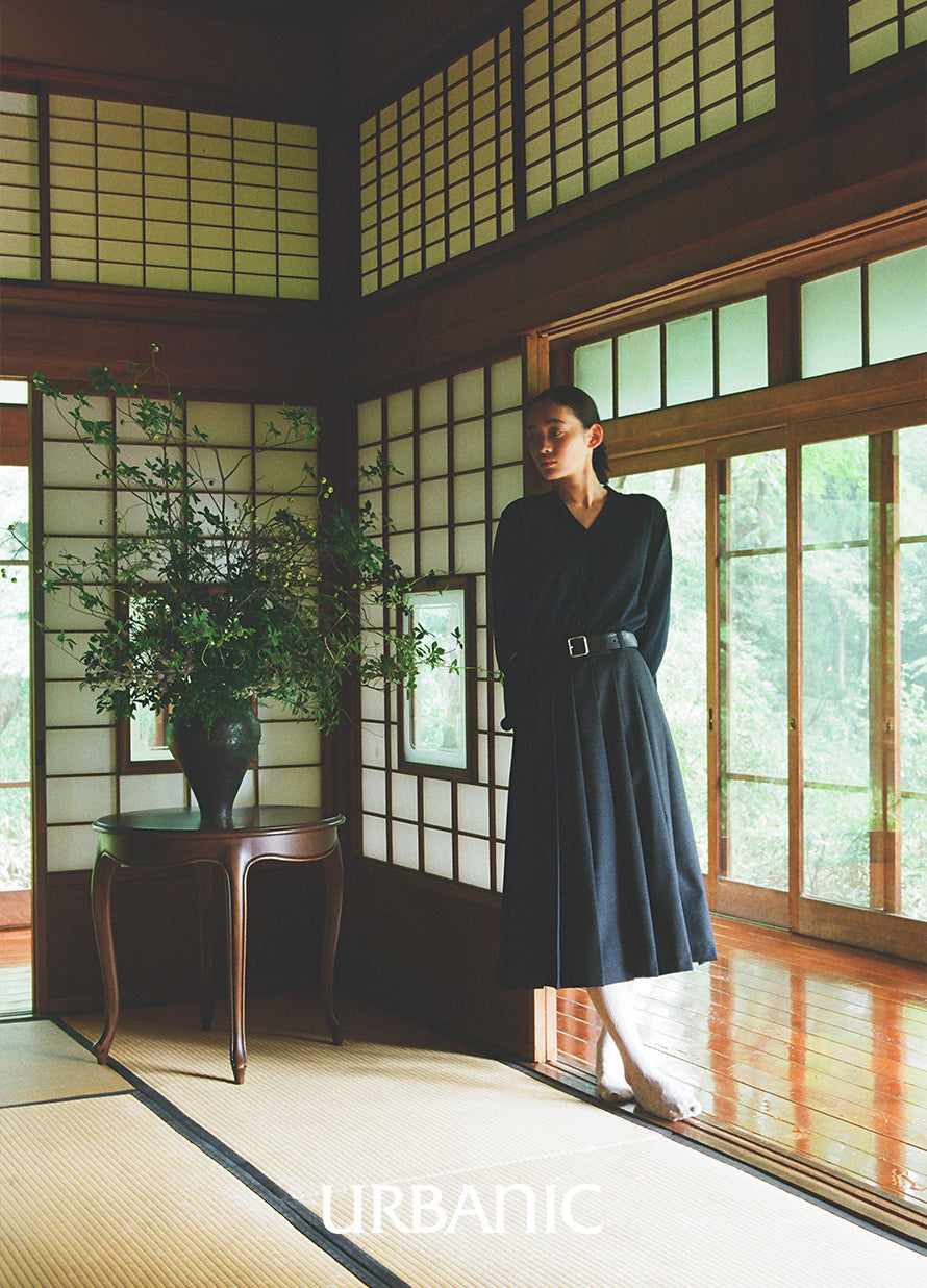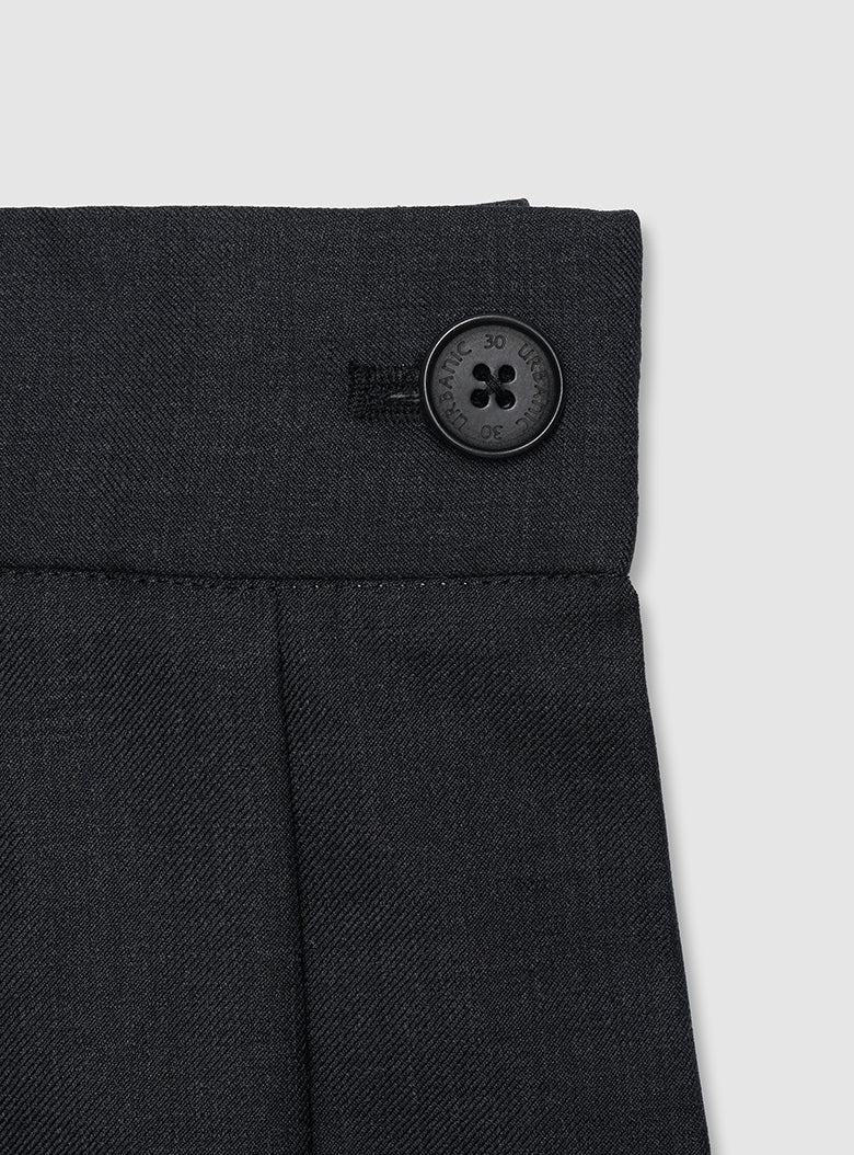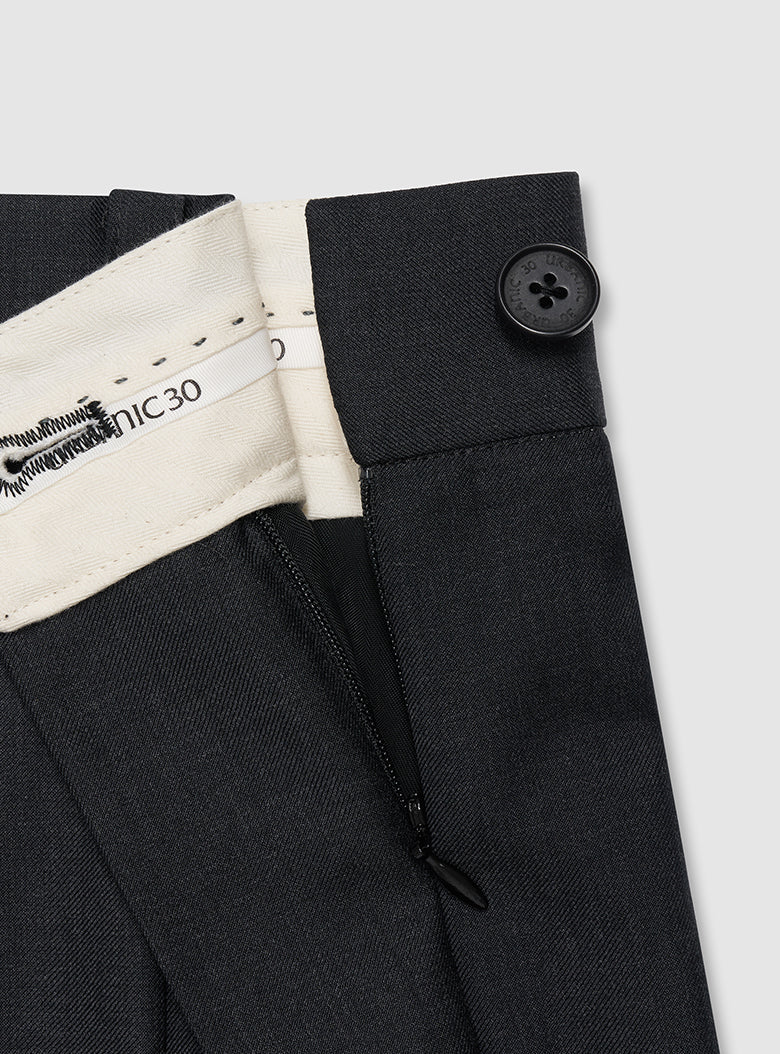 This charcoal-colored skirt features wide knife pleats and an A-line silhouette. It fastens with a side zipper and button, creating a classic mood when worn.