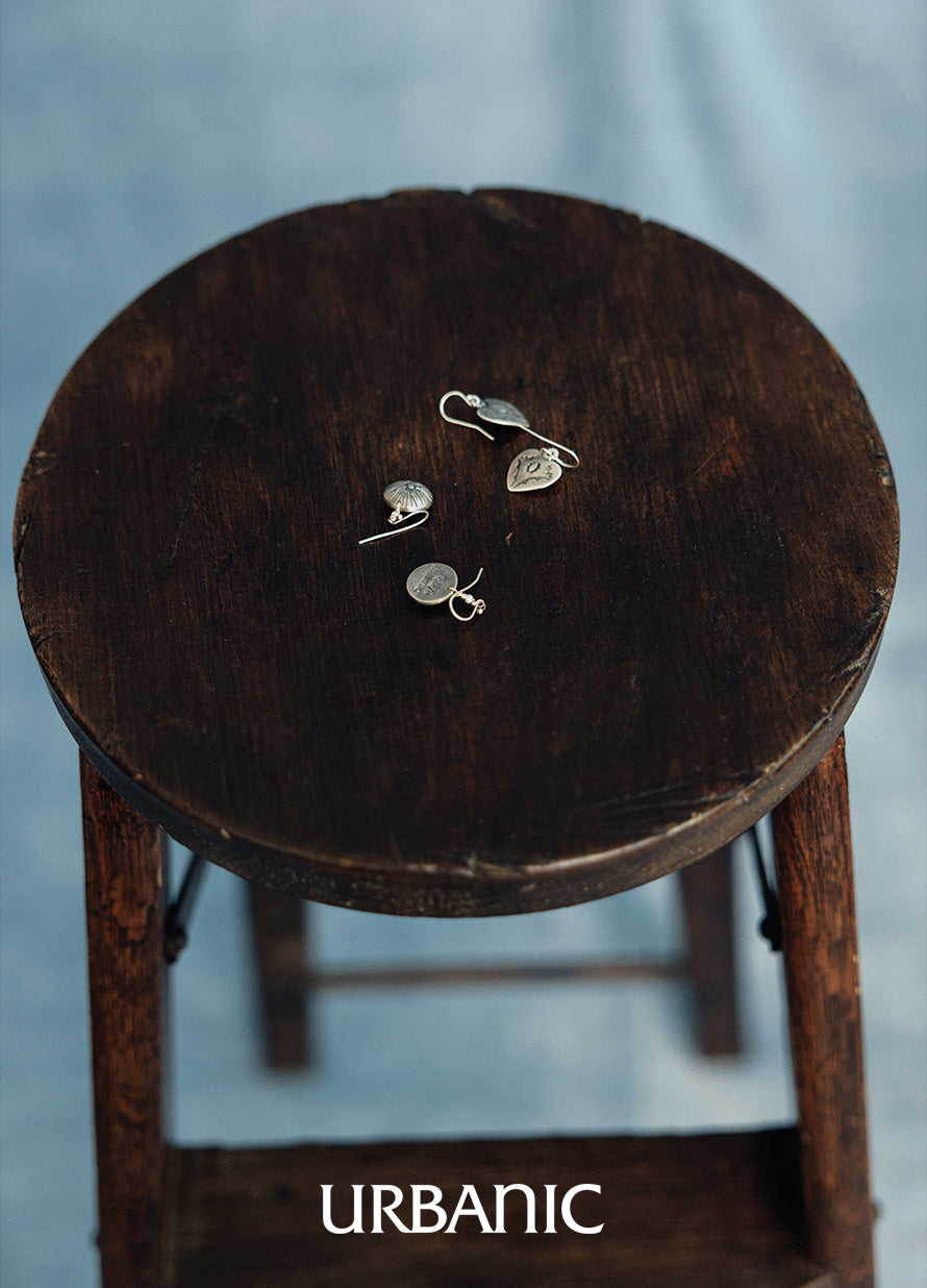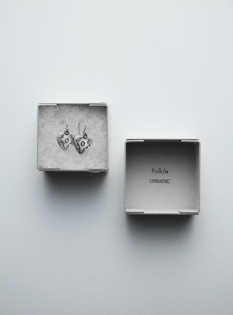 The Indian Heart Earrings are a collaboration piece between URBANIC and the Japanese handmade jewelry brand Folk/N. Crafted entirely from sterling silver, both the gently curved, convex heart pendant and the hook showcase fine artisanal detail. The back of each earring is engraved with the logos of Folk/N and URBANIC, symbolizing the harmony between the two brands.