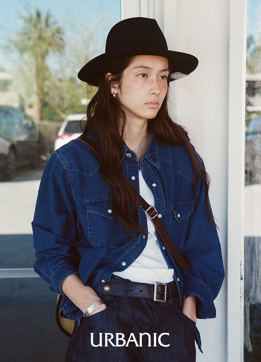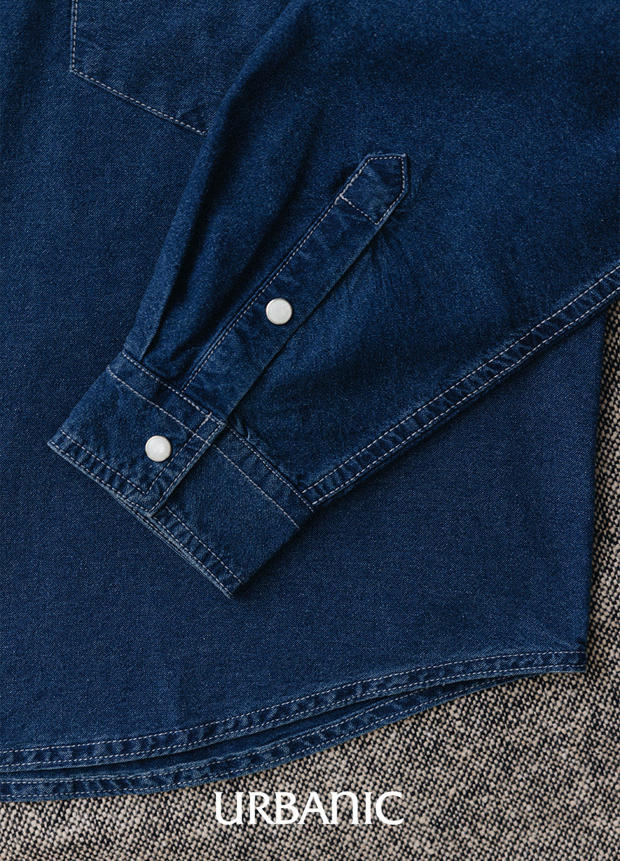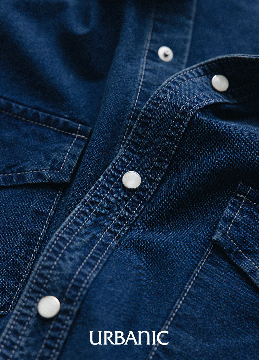 Made from a deep indigo denim fabric developed exclusively by Urbanic, it pairs with delicate silver buttons for a striking contrast, bringing a sense of elevated Western sophistication.
