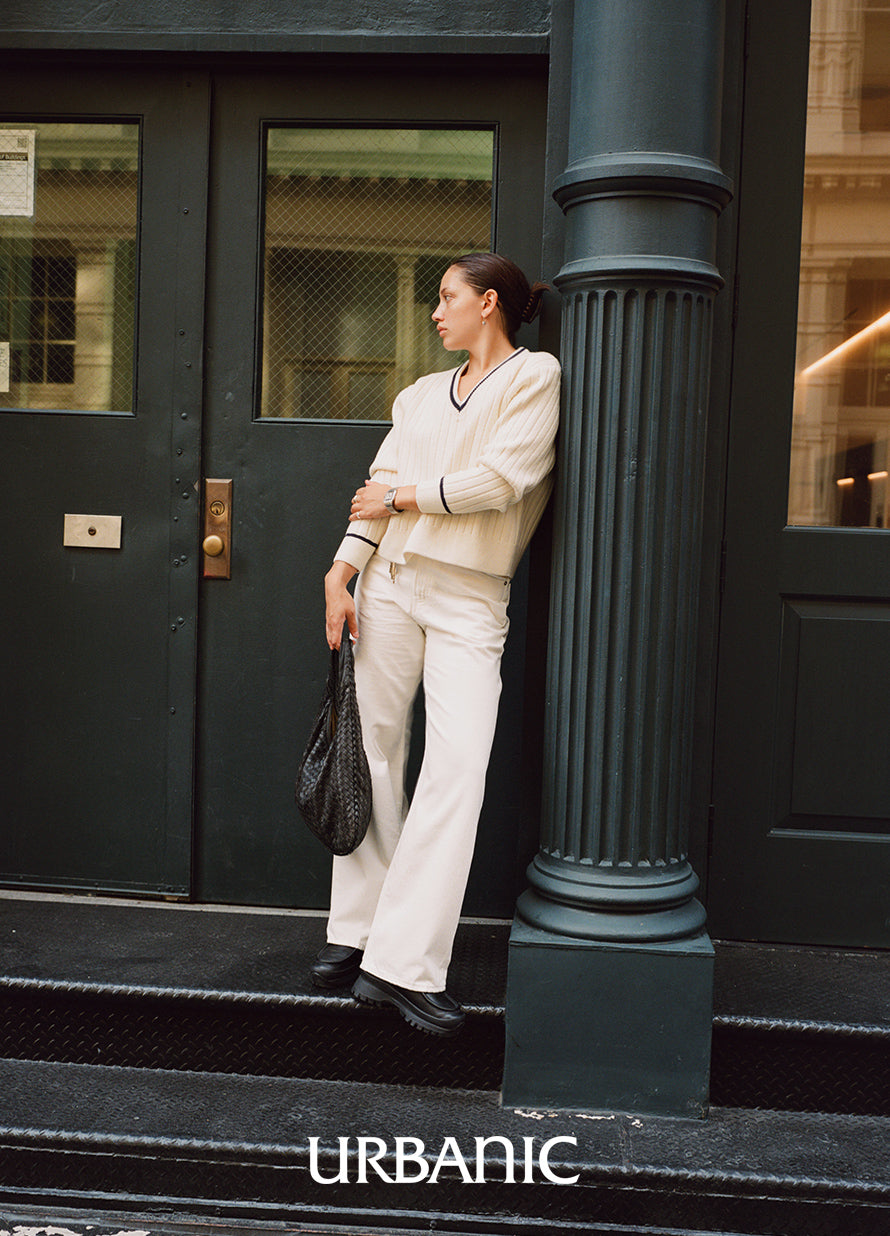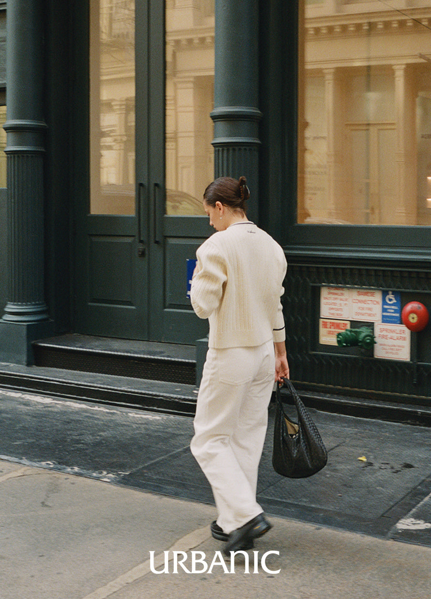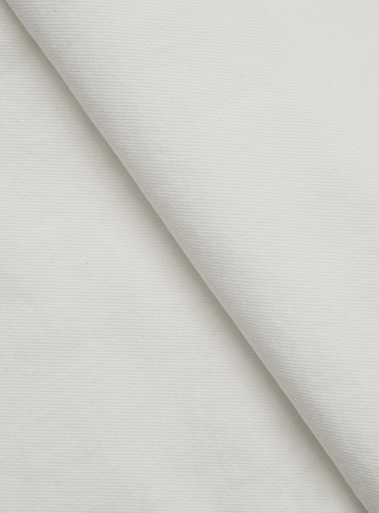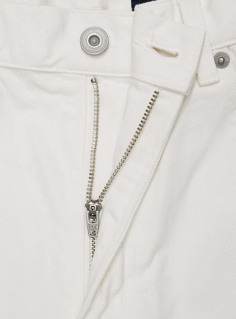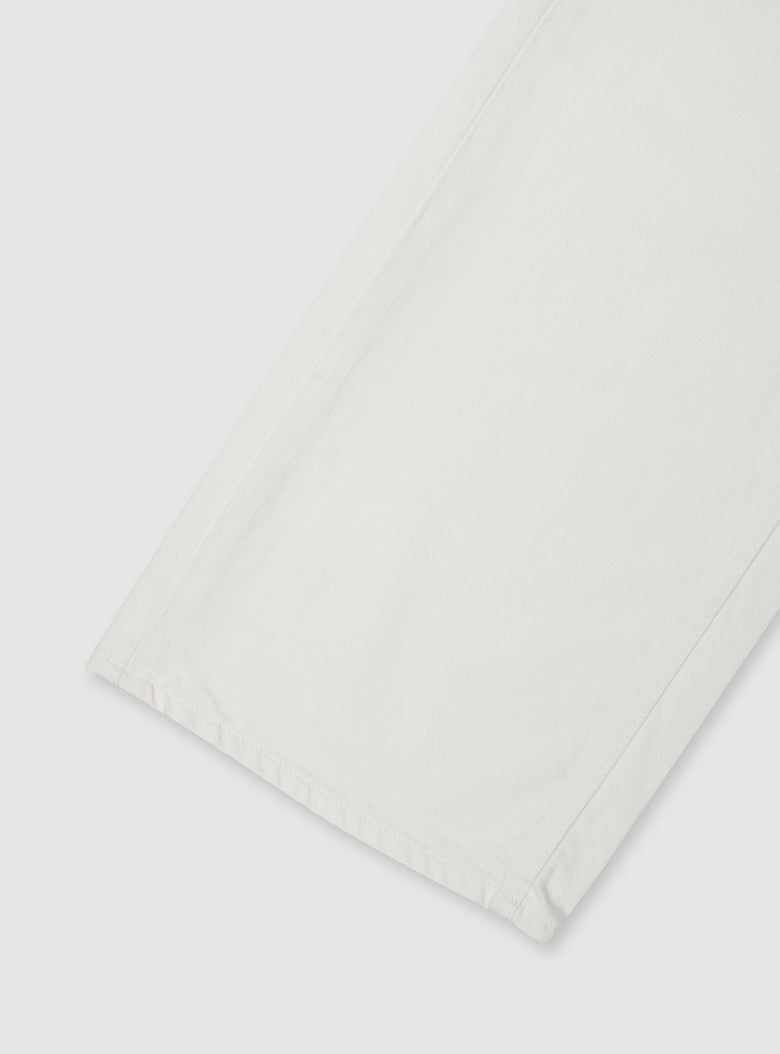These relaxed silhouette cotton denim pants come in an off-white color. They are finished with sturdy and delicate detailing, featuring white stitching in varying thicknesses for added texture and style.