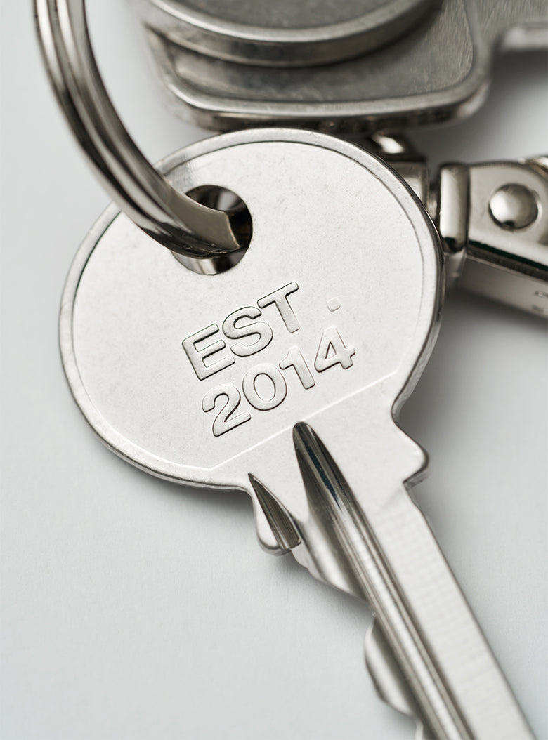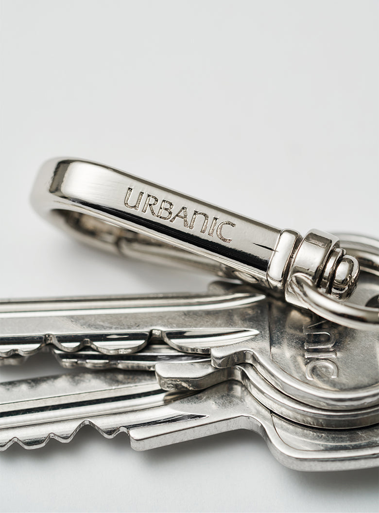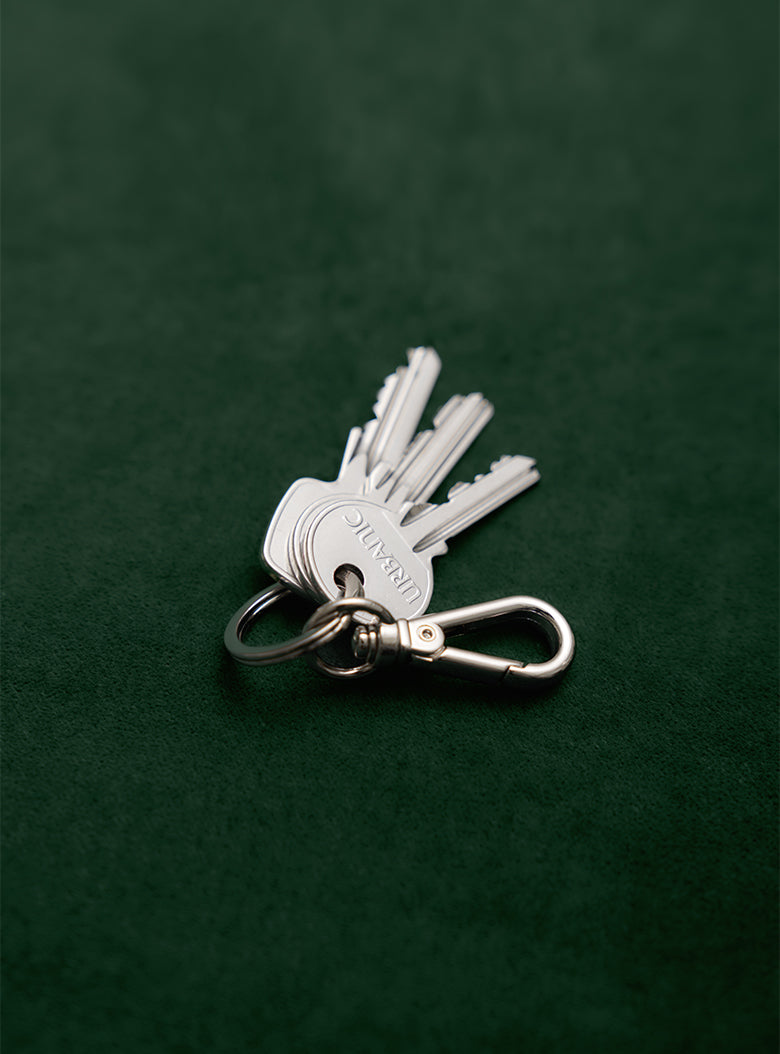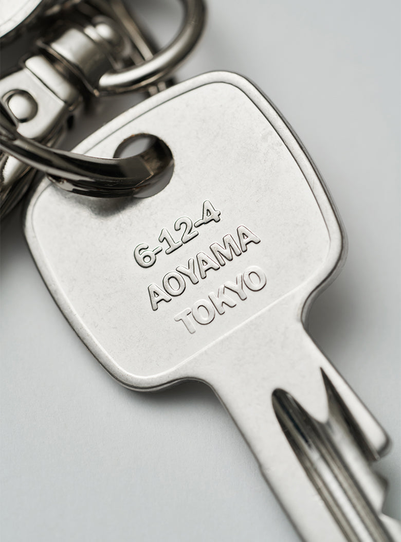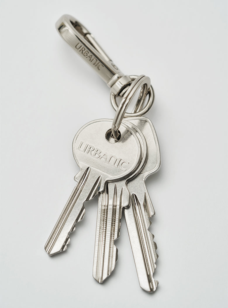 This is a "Key Fob" created to commemorate the opening of Urbanic's flagship store in Aoyama, Tokyo. Designed in the actual size of a real key, the silver brass keys come in three different shapes, each engraved with embossed characters symbolizing Urbanic.