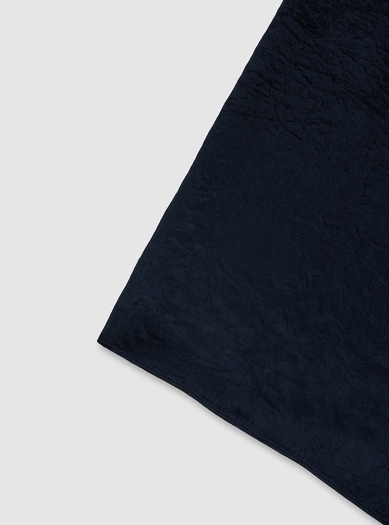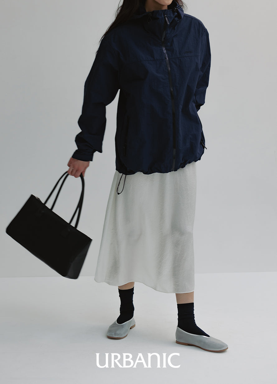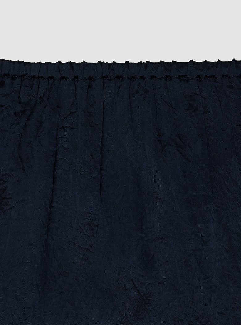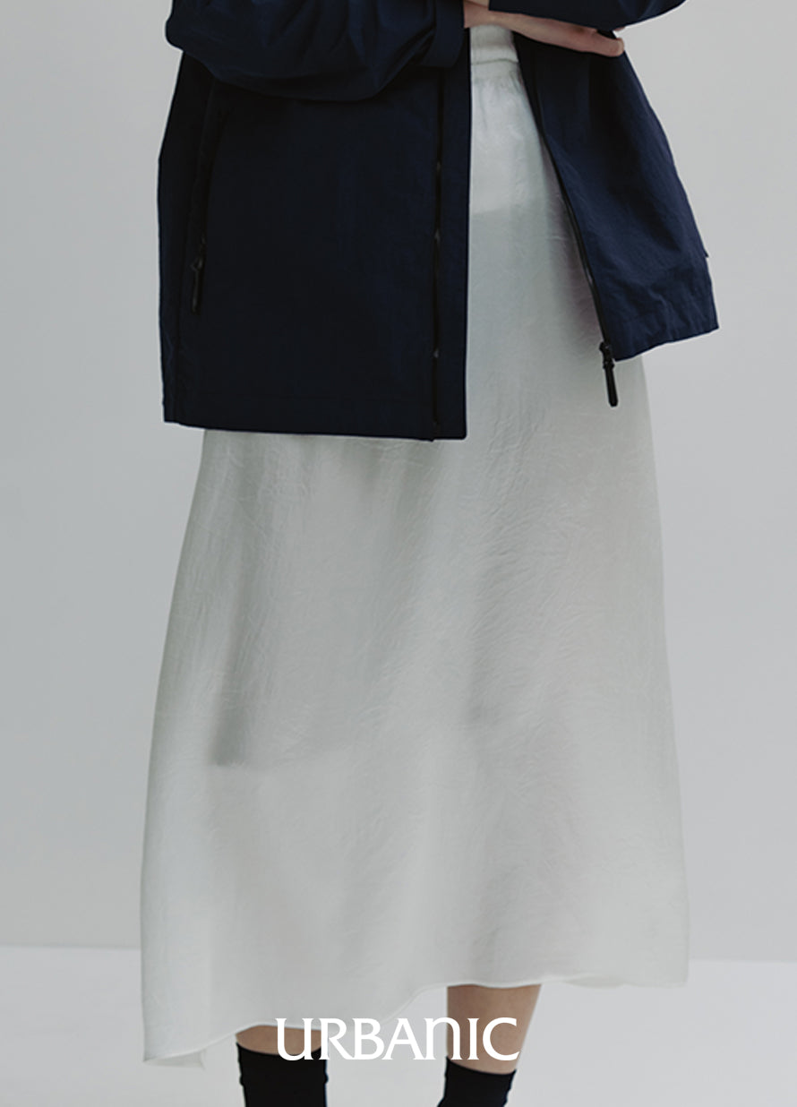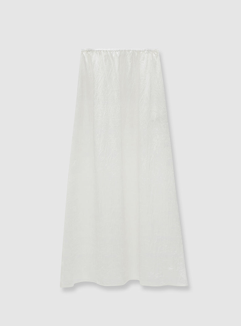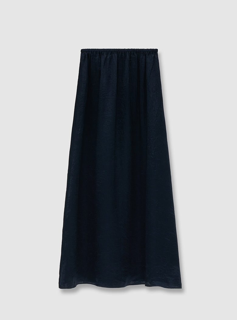 This is a long skirt made from acetate with a vibrant sheen and subtle creases. It comes in versatile colors and features a moderately relaxed silhouette when worn.