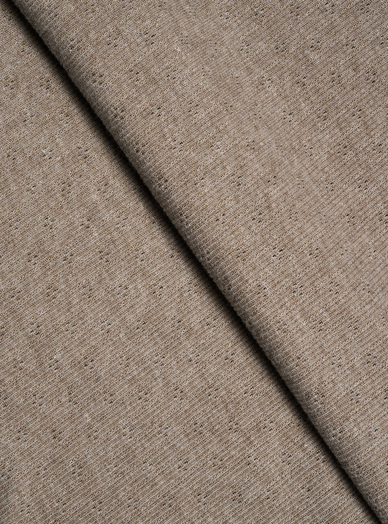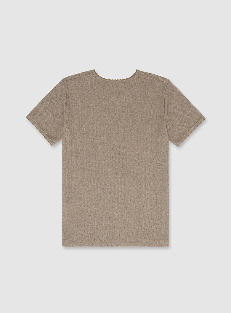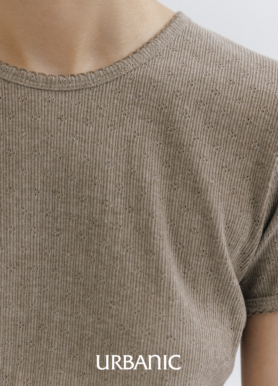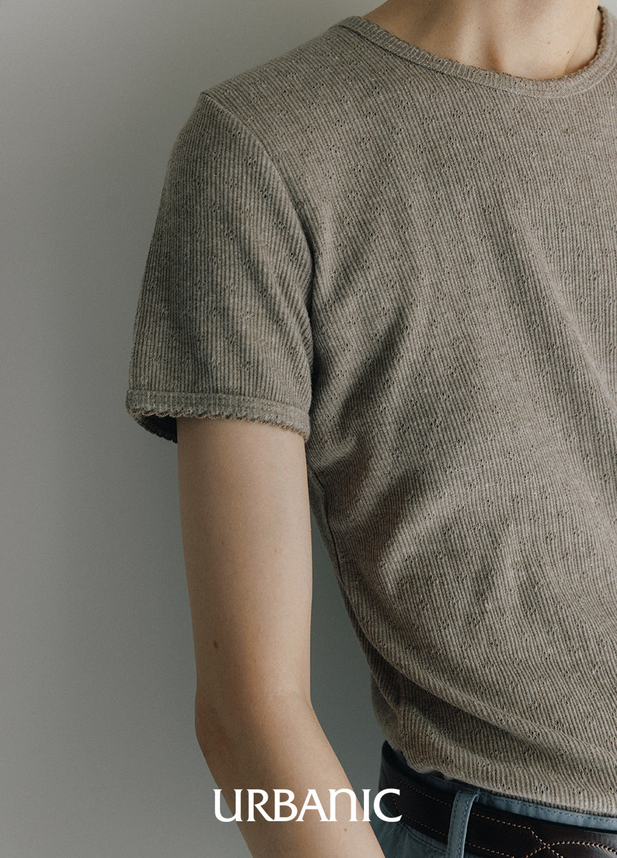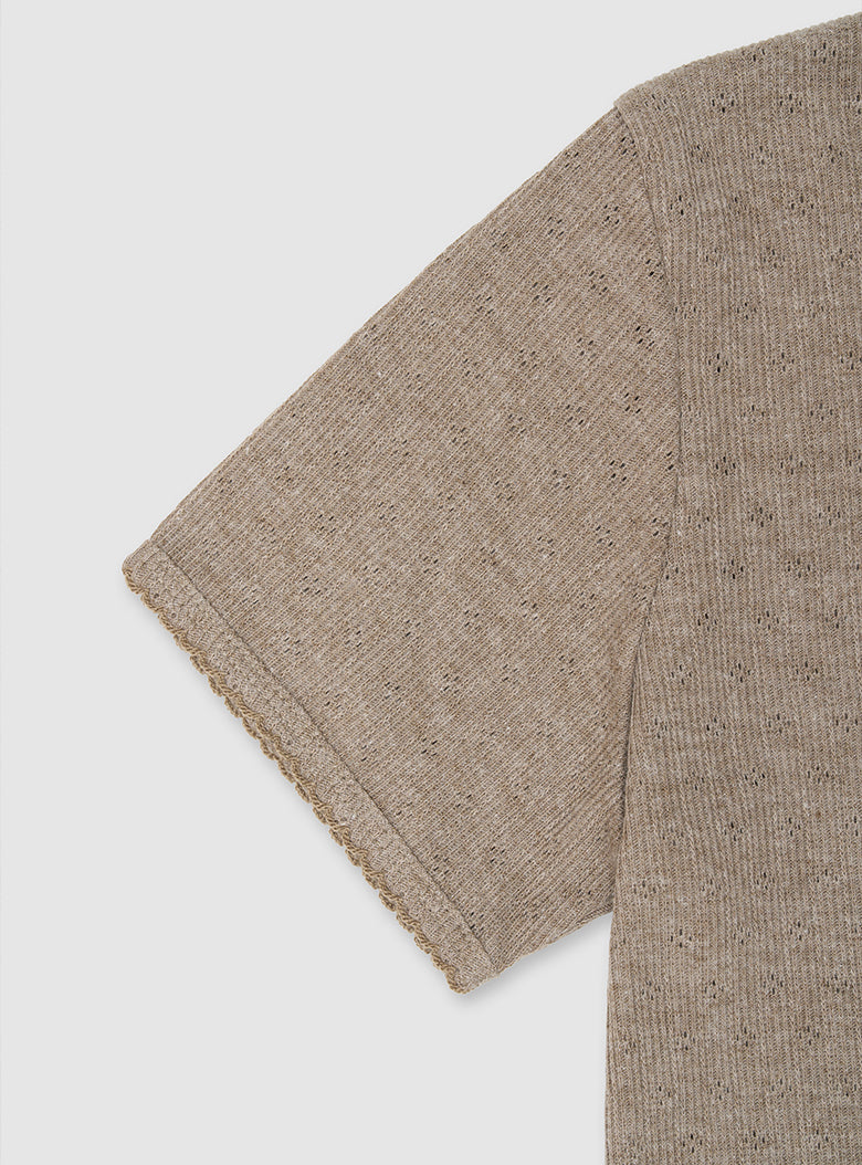 The Marigold Tee charms with its delicate petal-shaped perforations and sweet, rounded loop accents. Crafted from a soft, stretchy jersey fabric made of cotton and recycled polyester, it features a subtle vertical rib texture interwoven with pointelle-like punch details. The result is a light, breathable piece full of gentle character and charm.