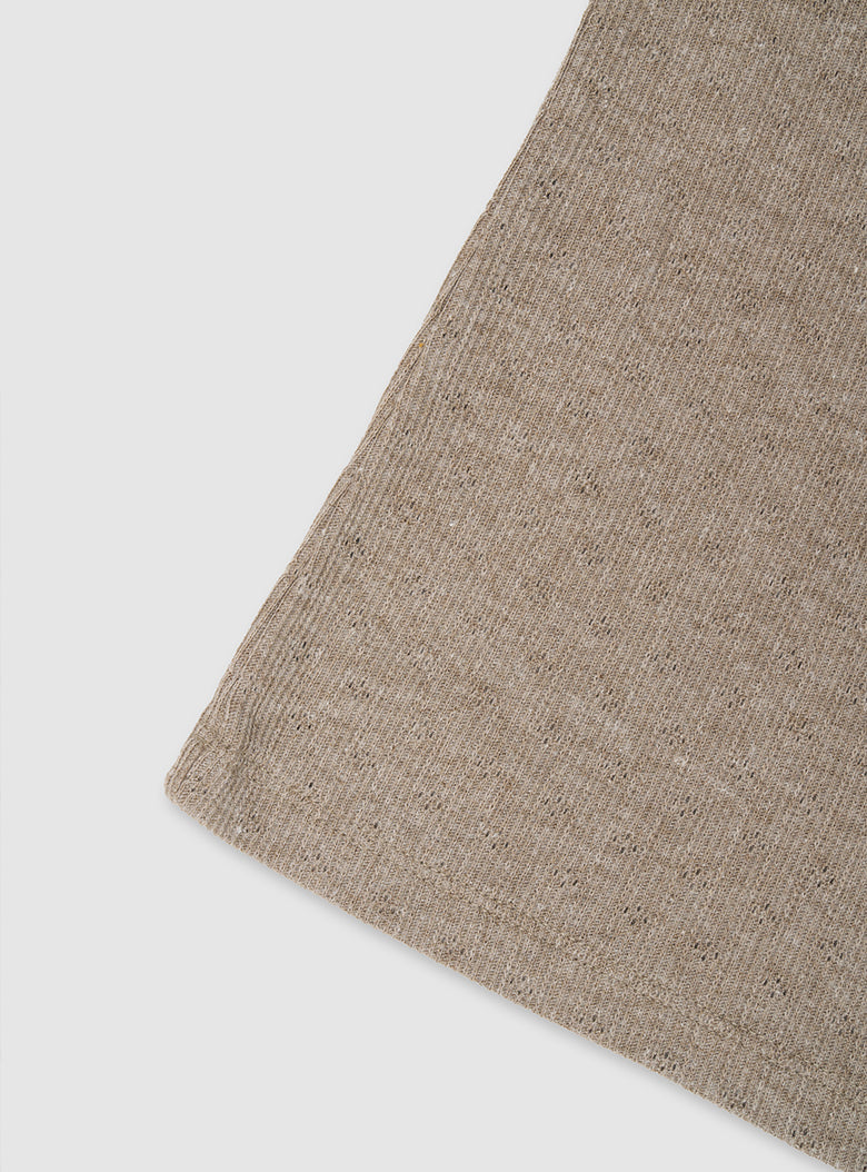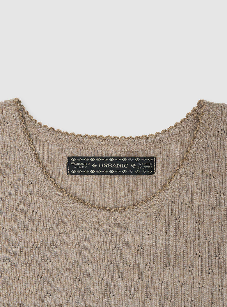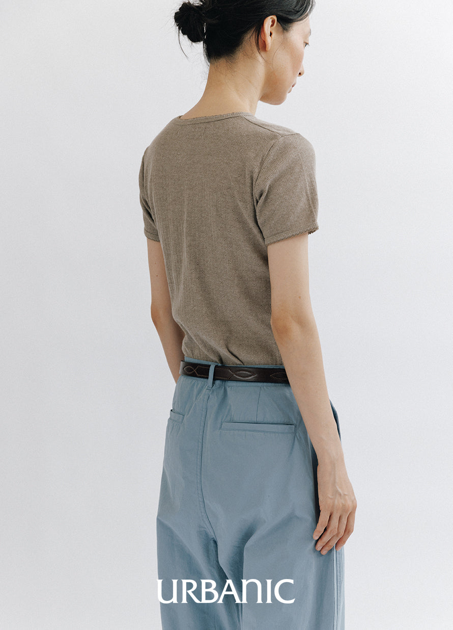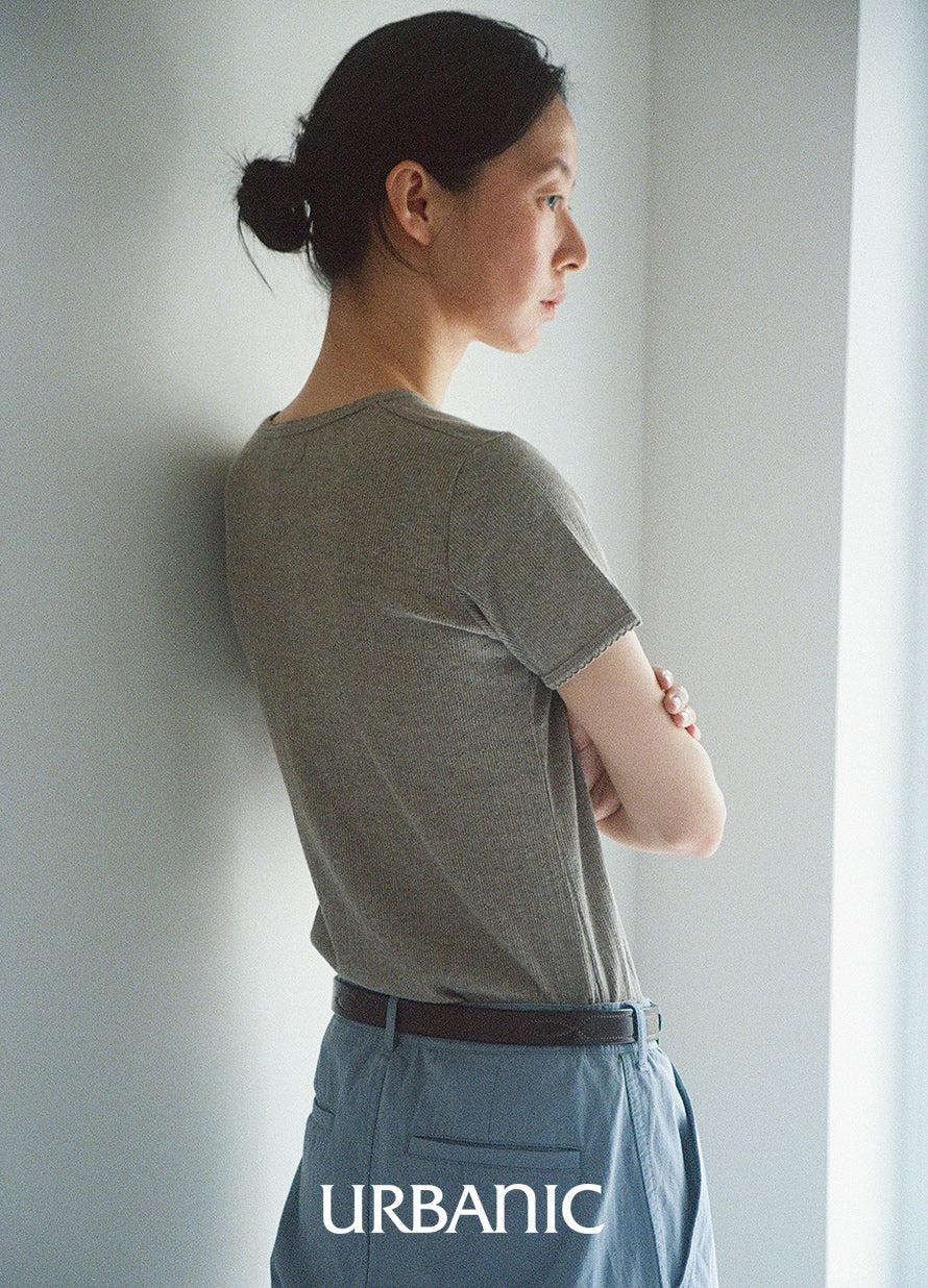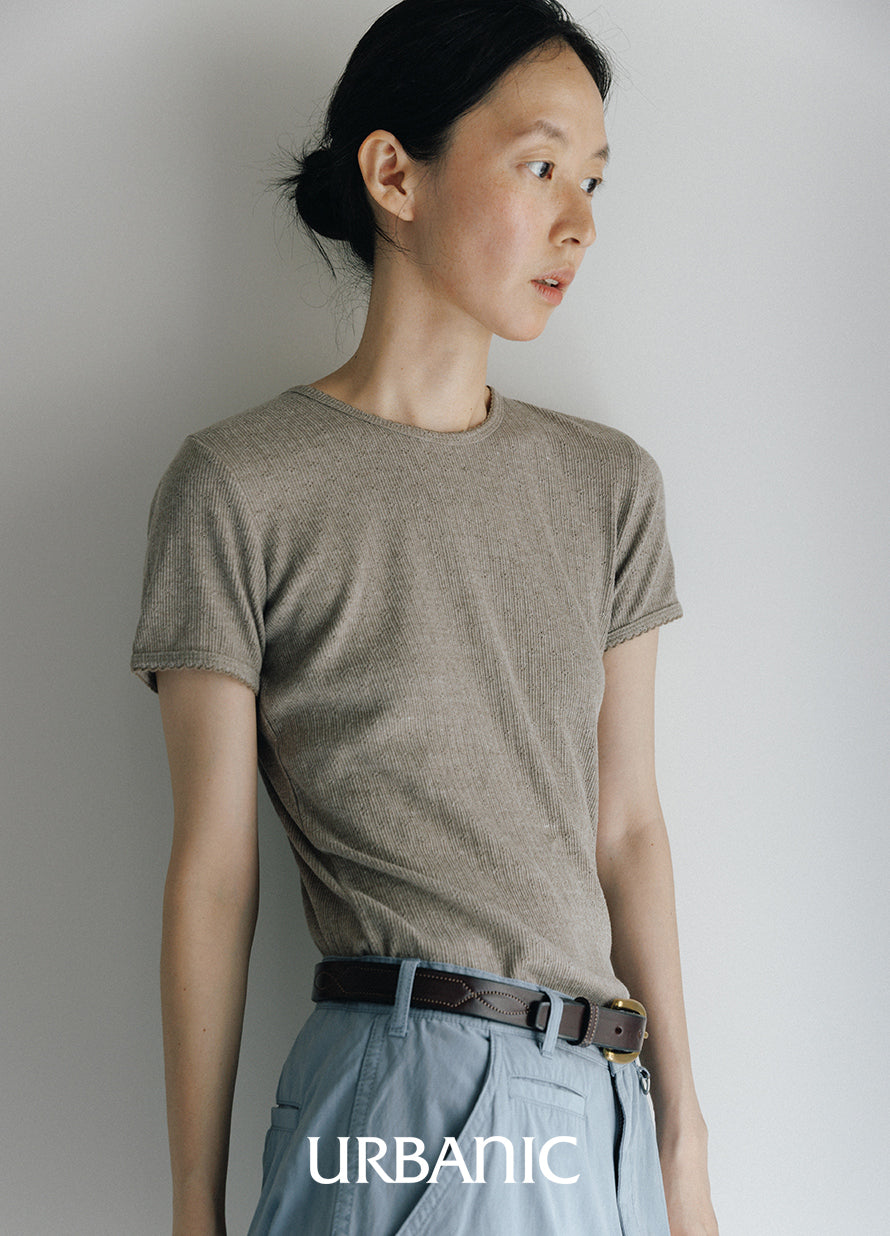 The Marigold Tee charms with its delicate petal-shaped perforations and sweet, rounded loop accents. Crafted from a soft, stretchy jersey fabric made of cotton and recycled polyester, it features a subtle vertical rib texture interwoven with pointelle-like punch details. The result is a light, breathable piece full of gentle character and charm.