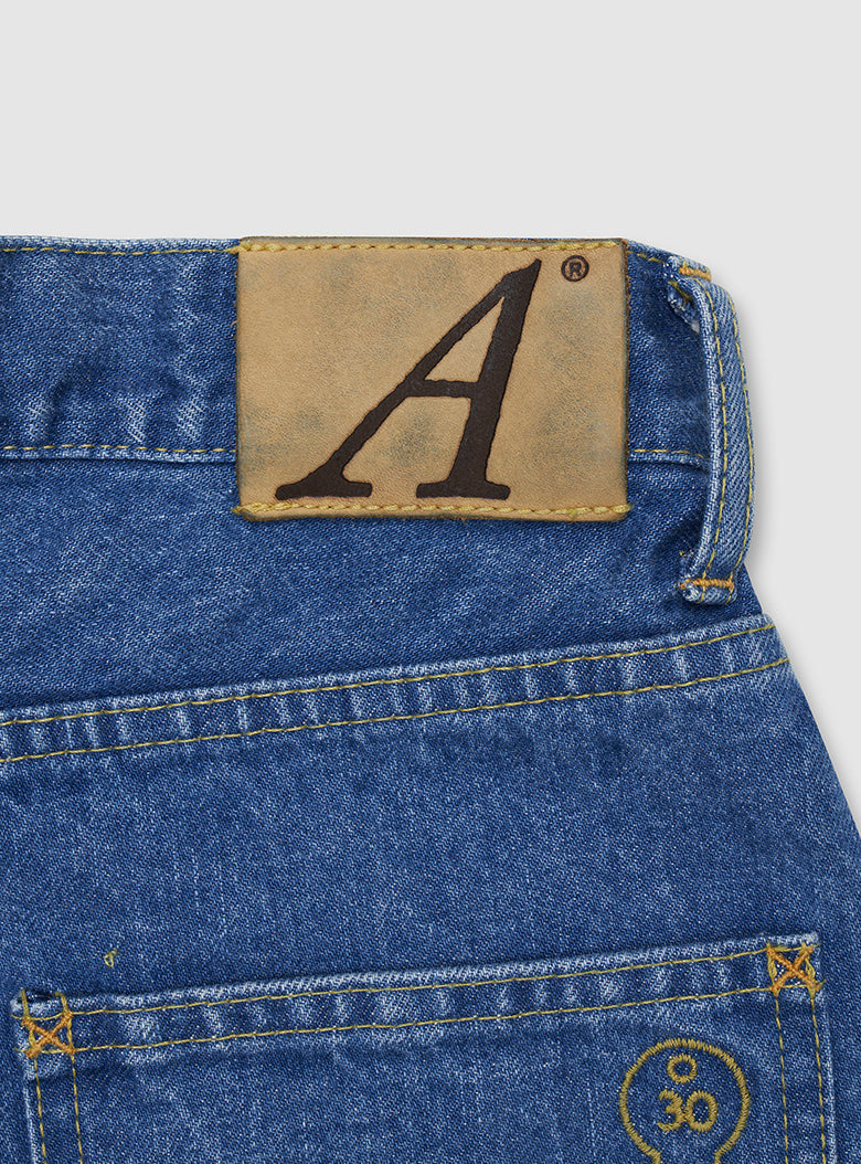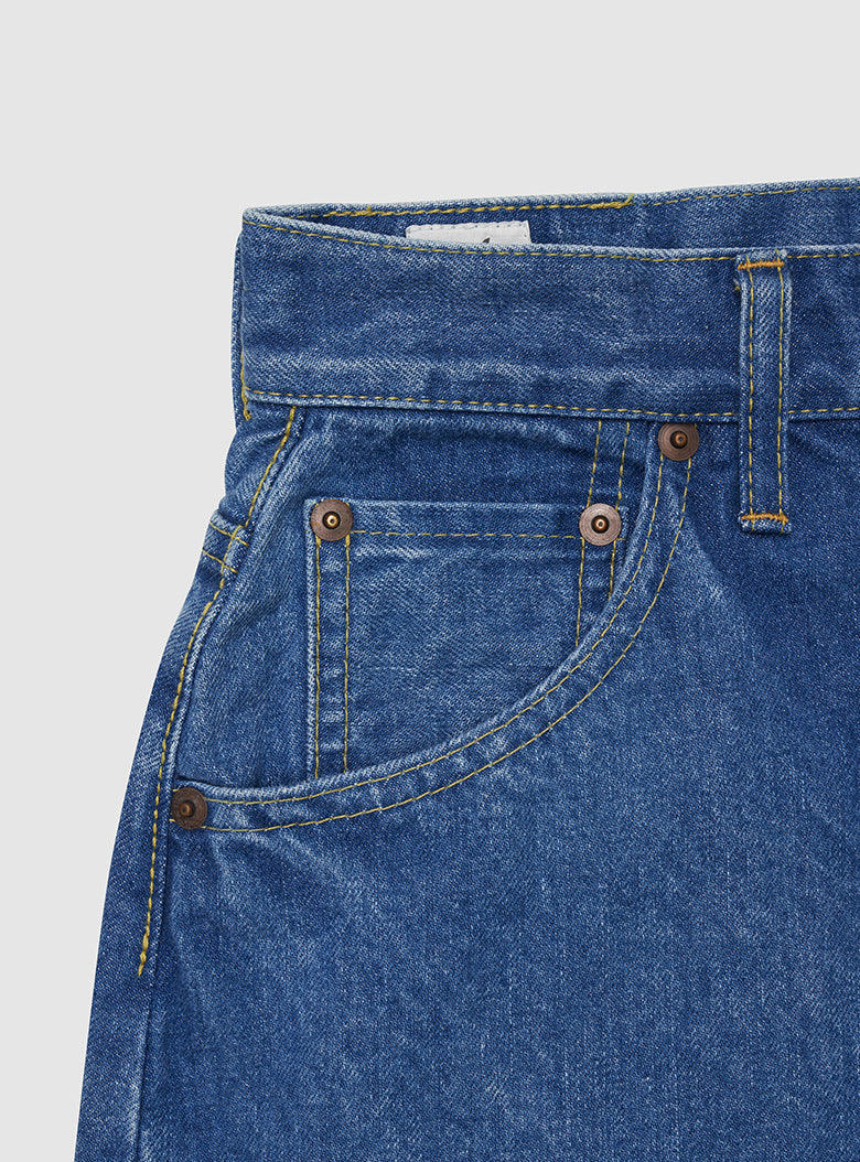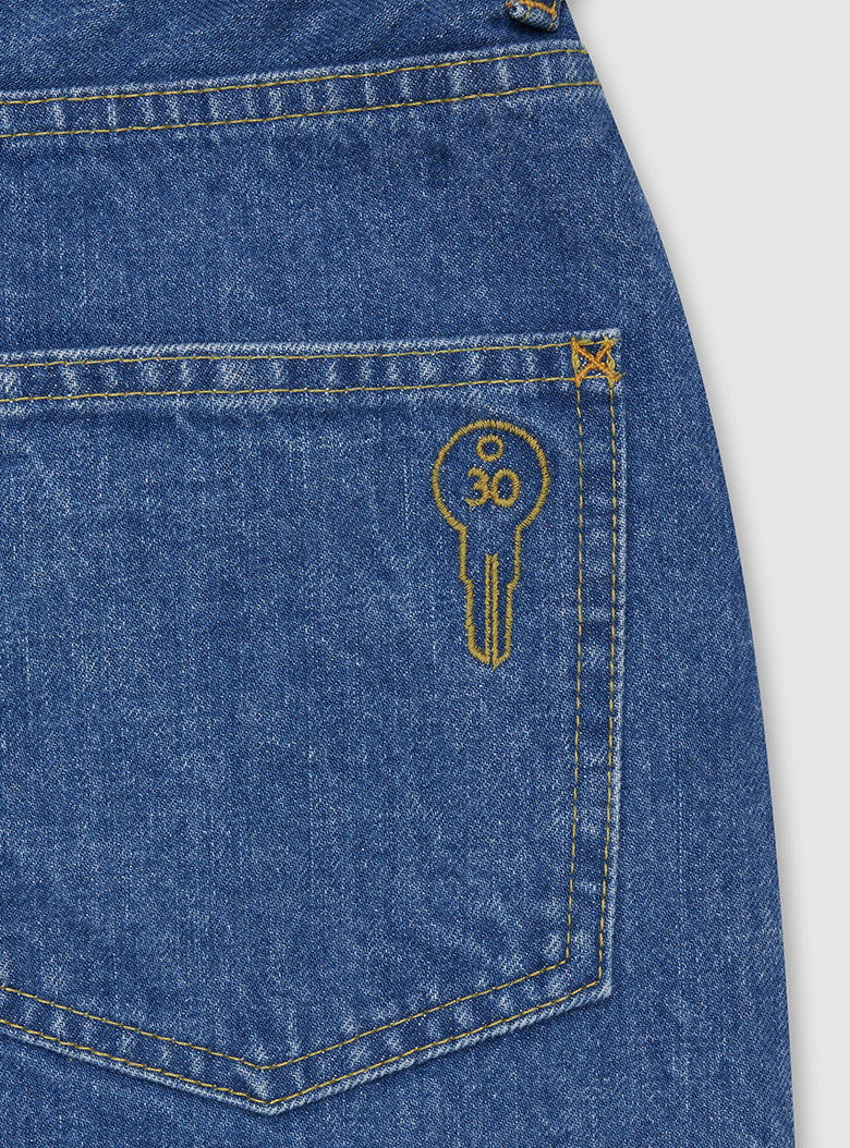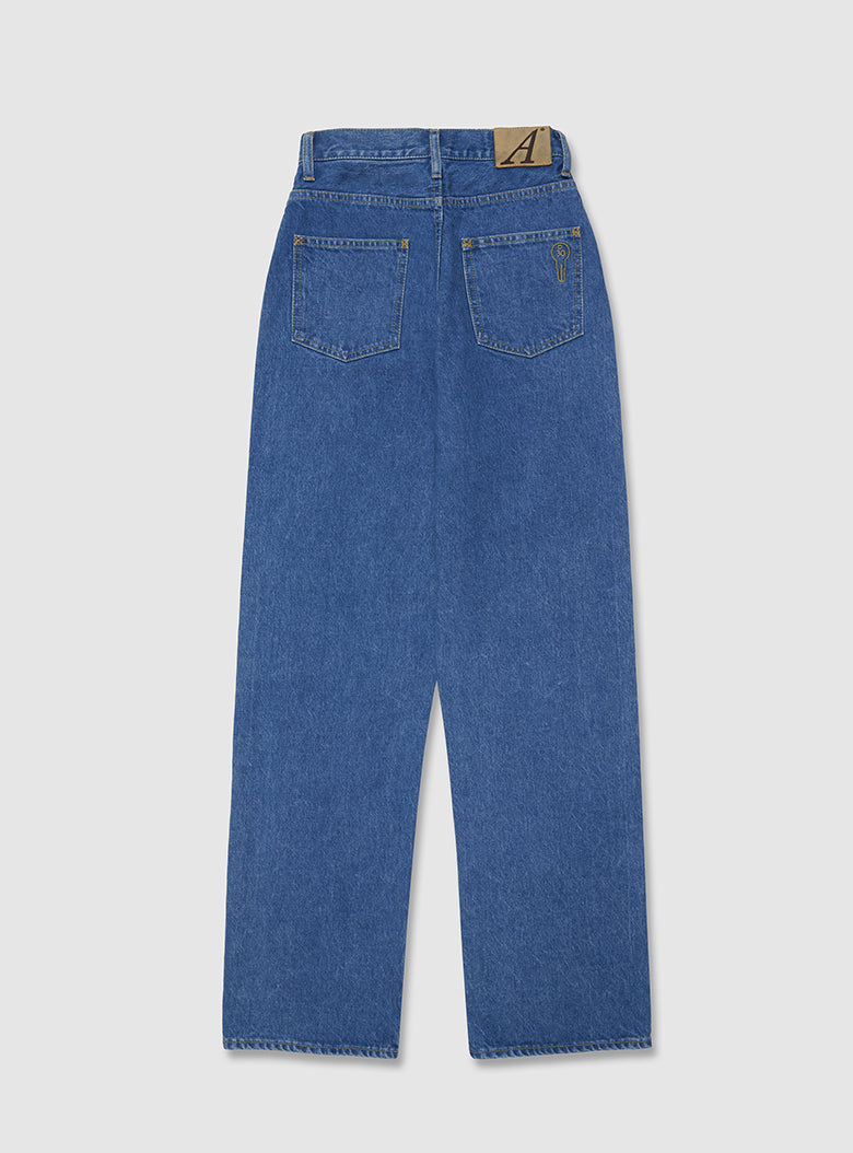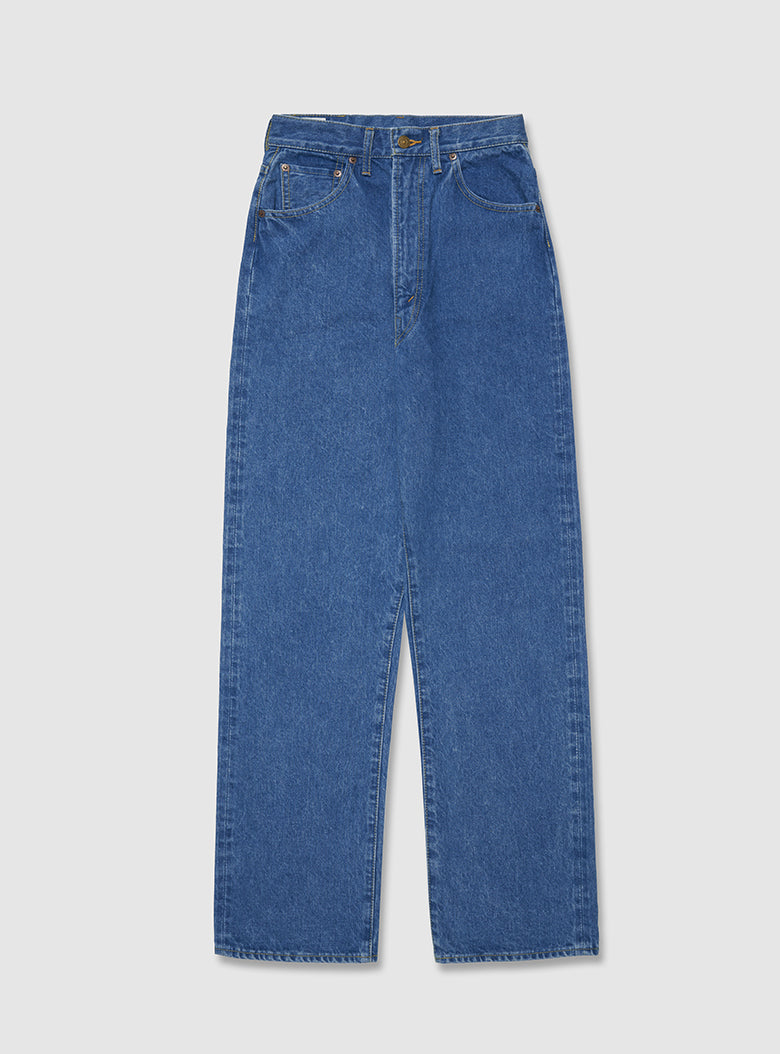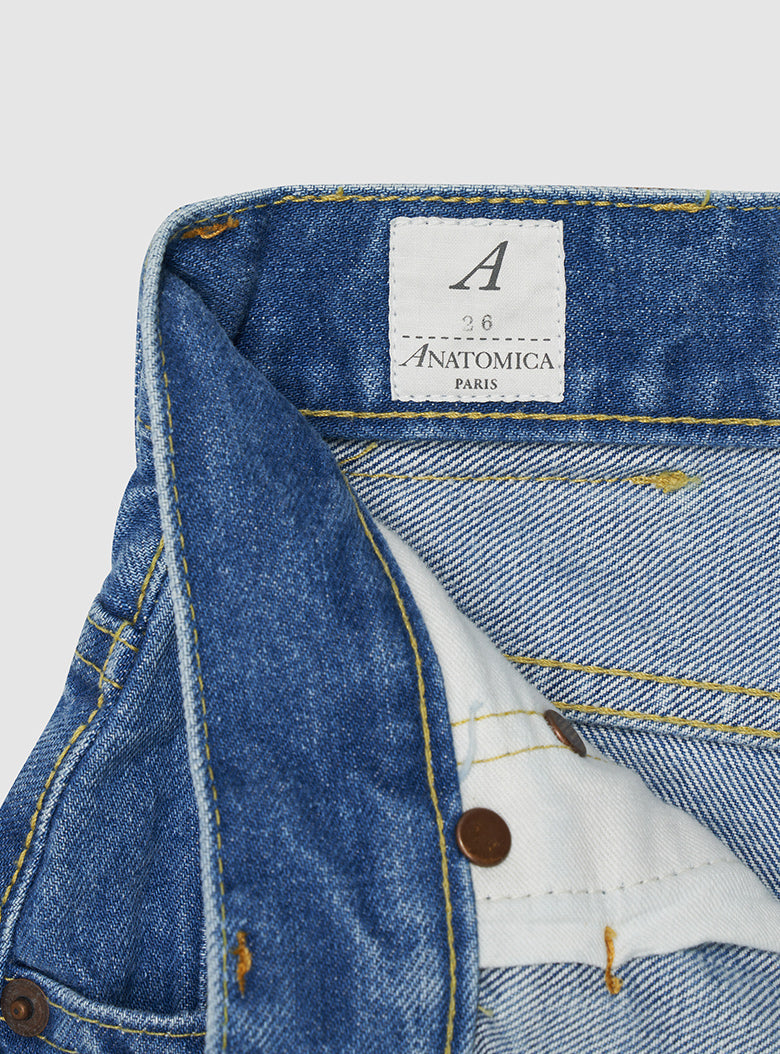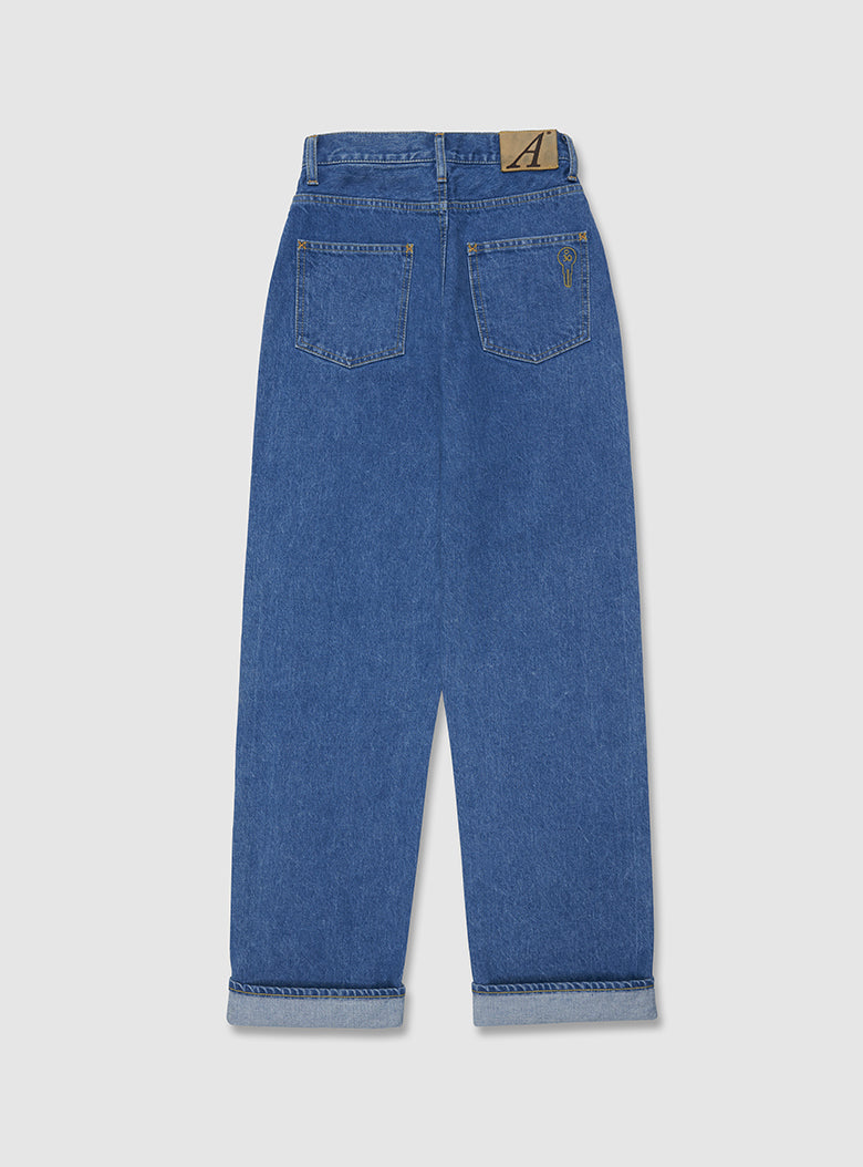 These are Marilyn pants in blue, created in collaboration with Anatomica. They feature a long length ideal for rolling up and a relaxed fit.