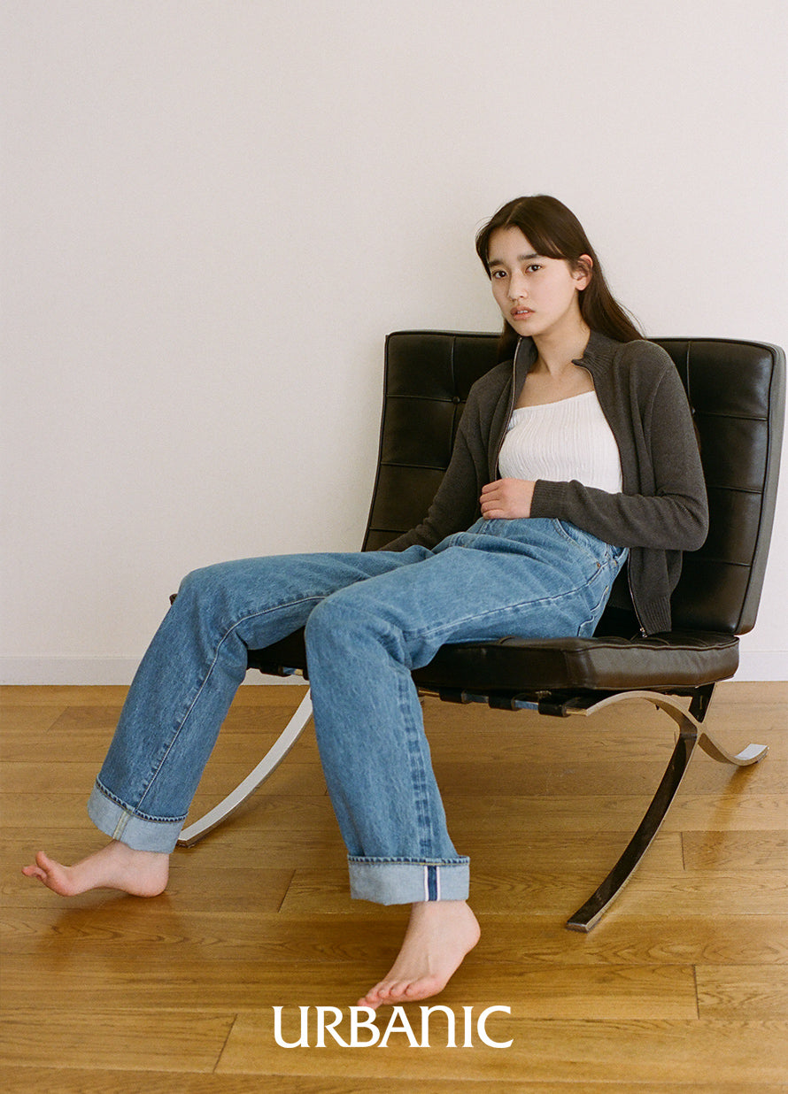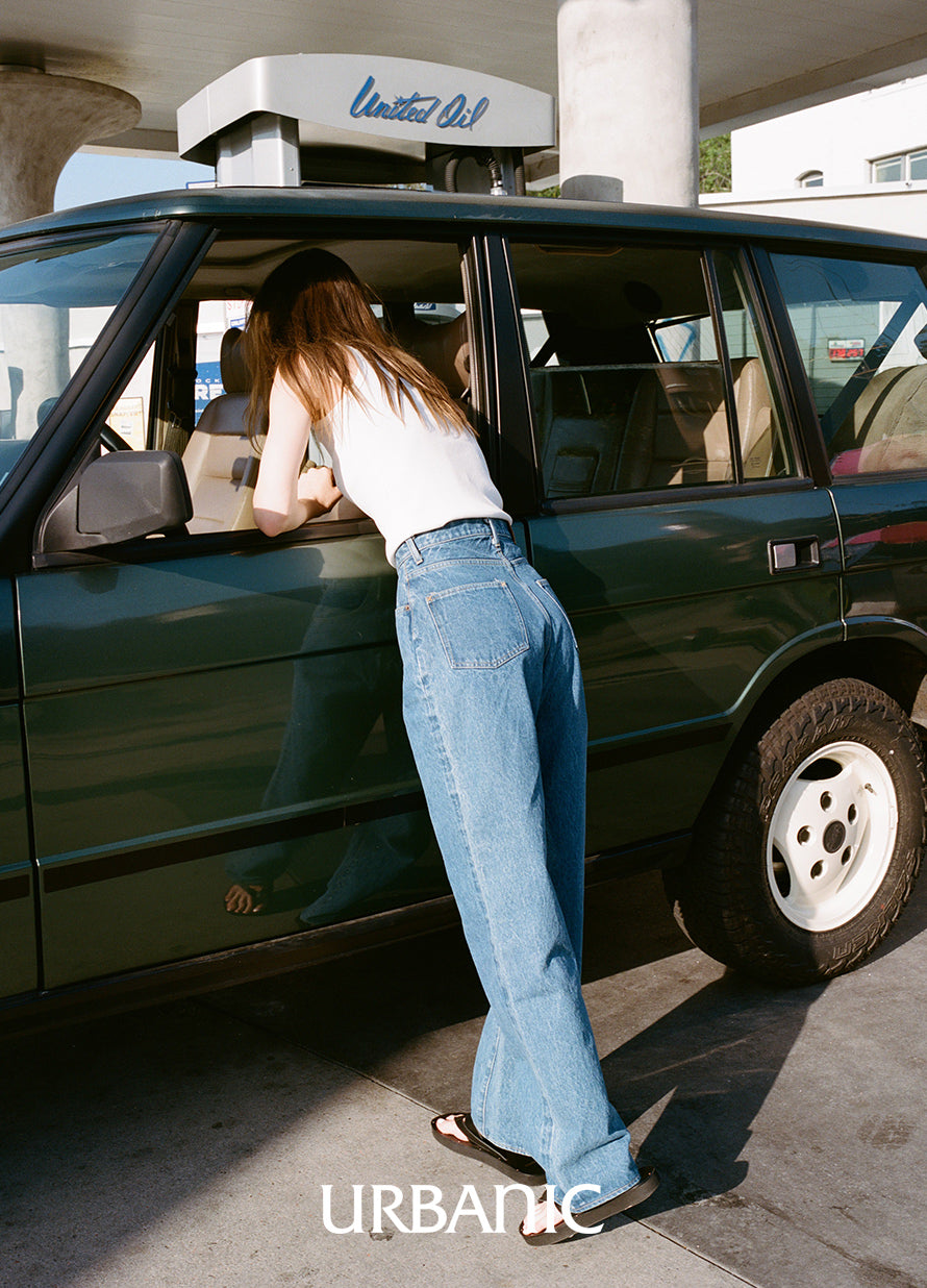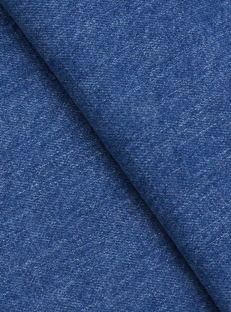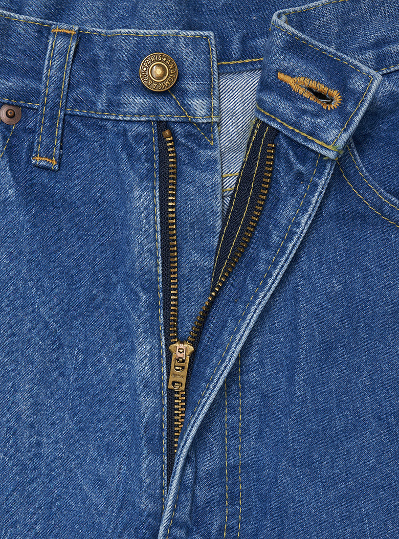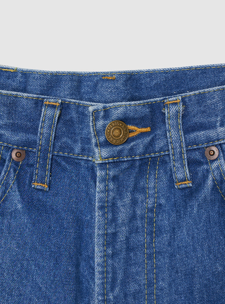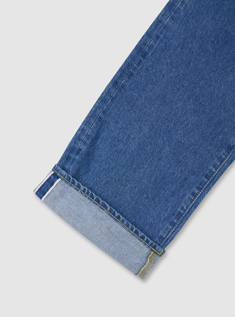 These are Marilyn pants in blue, created in collaboration with Anatomica. They feature a long length ideal for rolling up and a relaxed fit.