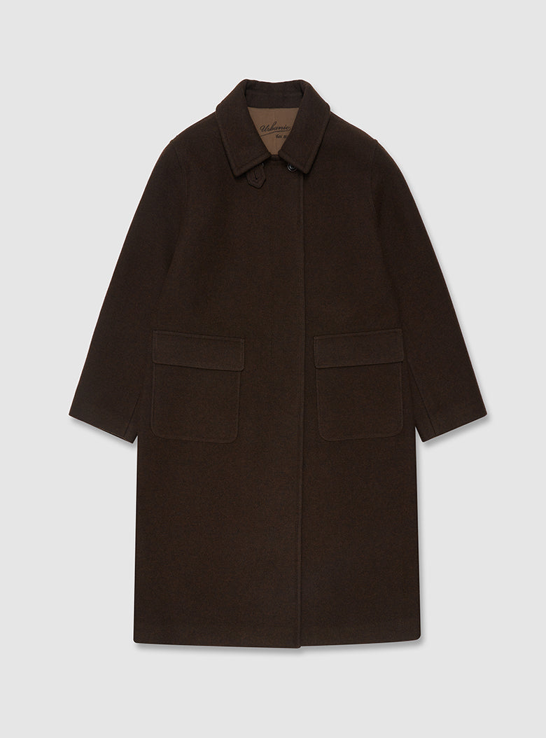 A wool-blend coat with a double-breasted silhouette. To enhance comfort, only the top button is exposed, while the other buttons are hidden to reduce bulk from the overlapping fabric. A tab closure on the collar allows for added warmth and wind protection.