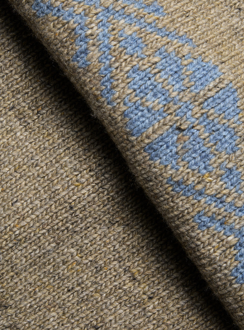 Set against a melange gray base of khaki and beige tones, the pattern unfolds in muted sky-blue Nordic lines, completed with silver concho buttons that add a subtle gleam.