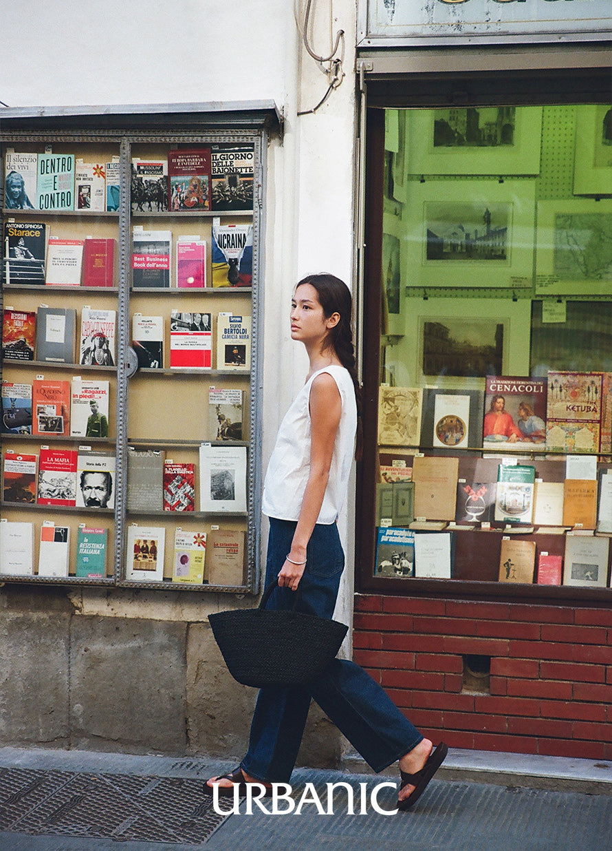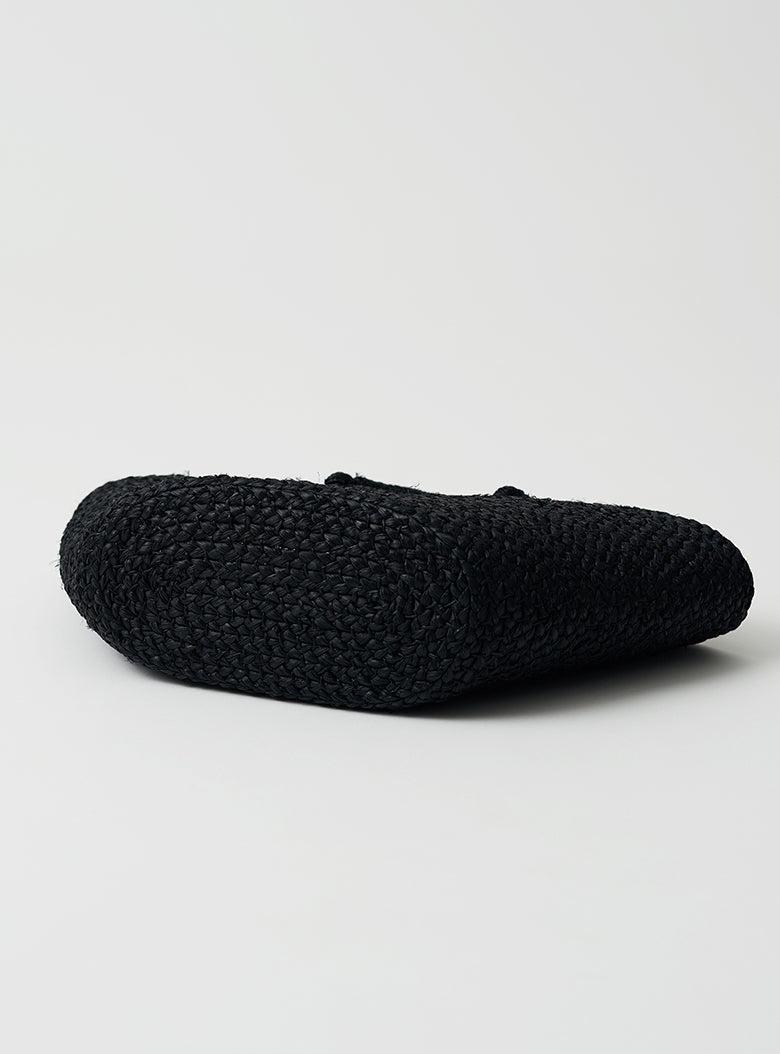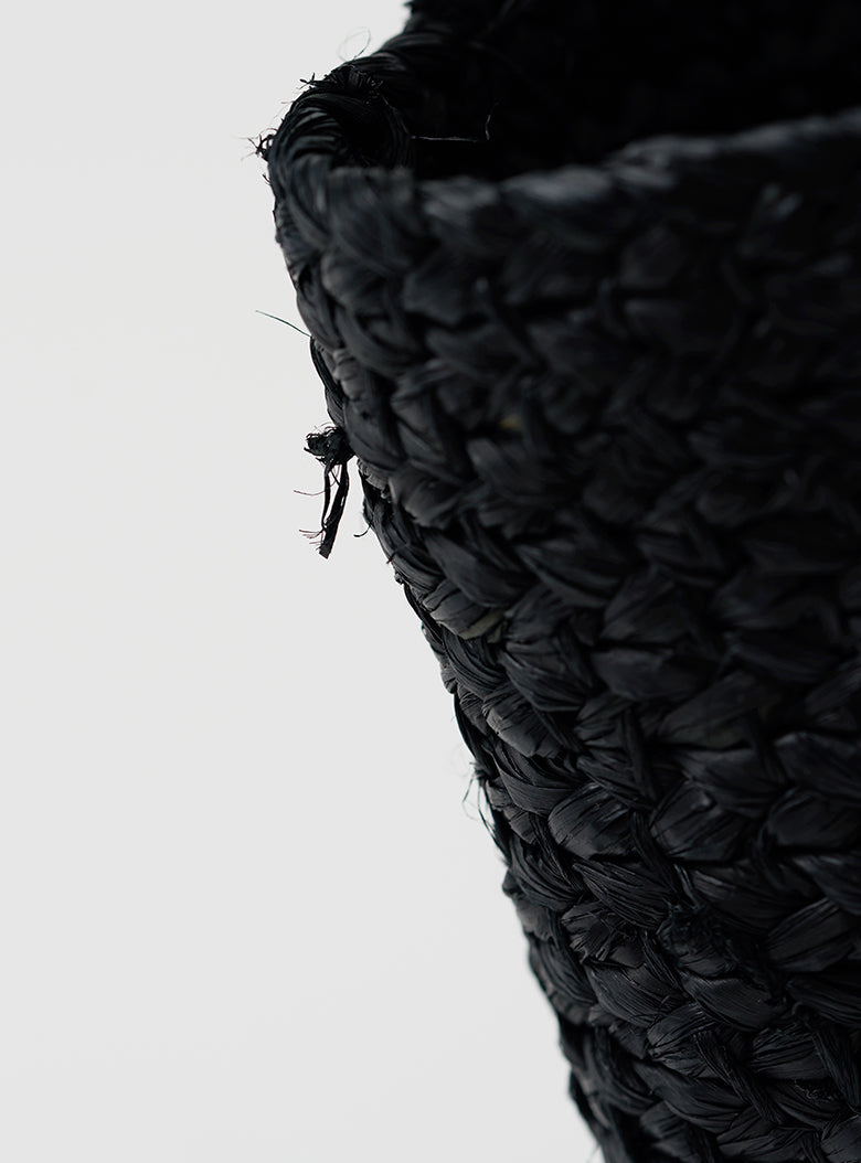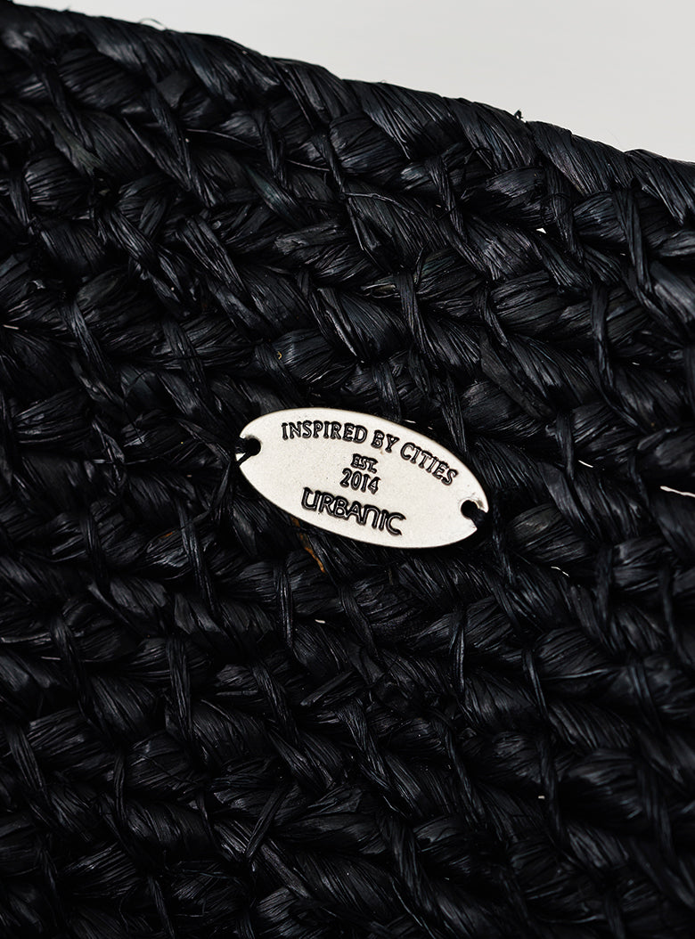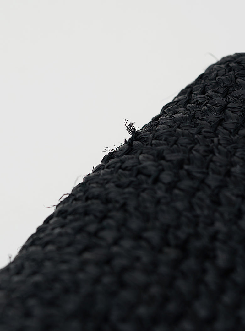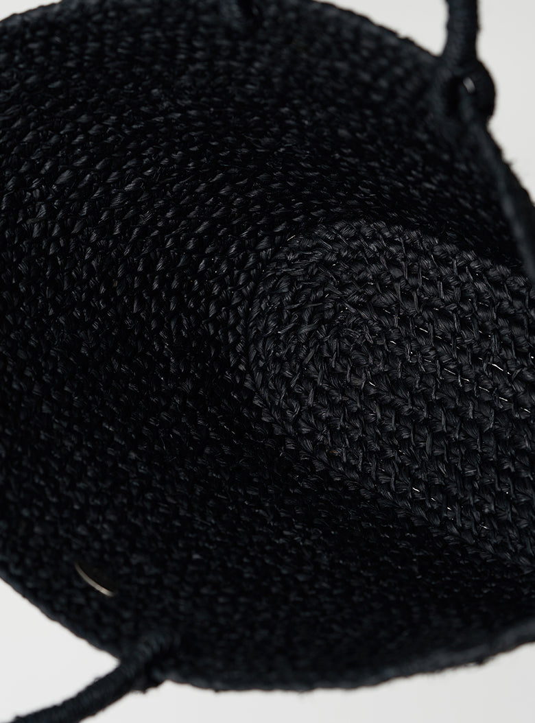 This raffia tote bag is handmade by skilled artisans in Rwanda, known for supplying accessories to high-fashion brands. The bag features a gently rounded shape reminiscent of a folded dumpling, carefully detailed with small openings and a securely fitted handle designed for comfortable carrying. Crafted from raffia dyed in refined black, this tote offers a calm and elegant look perfect for everyday use.