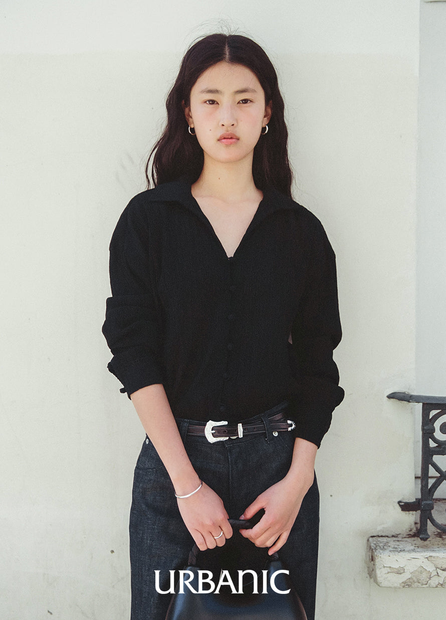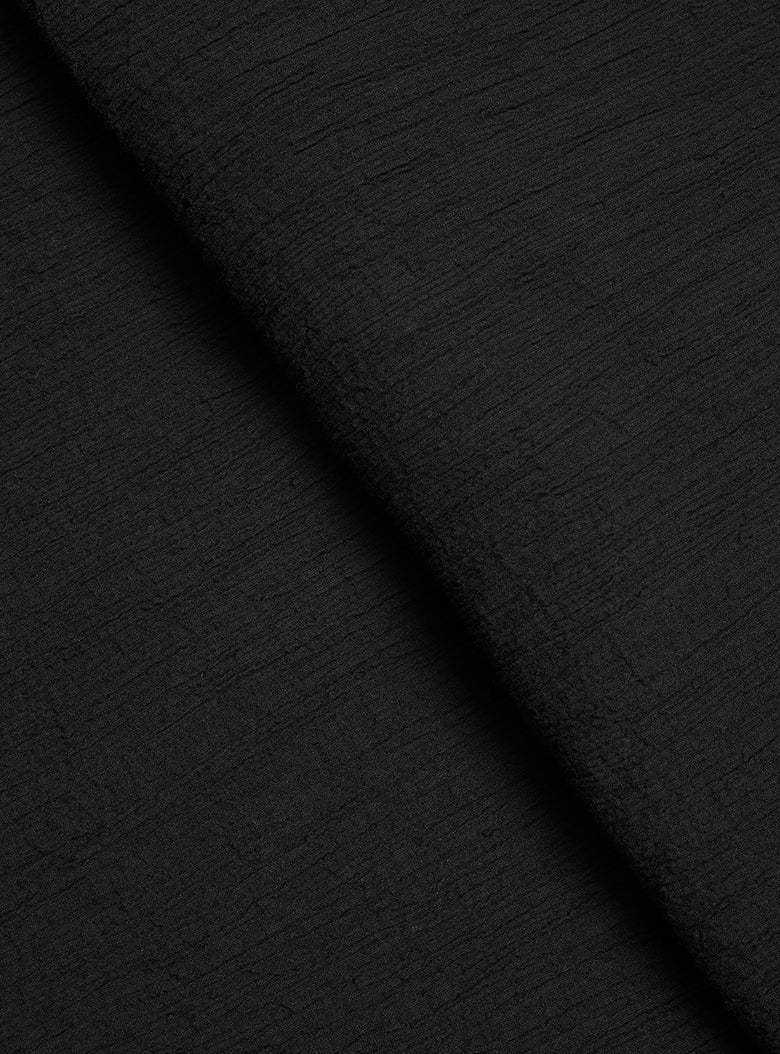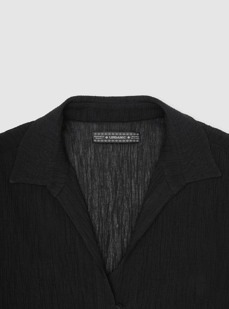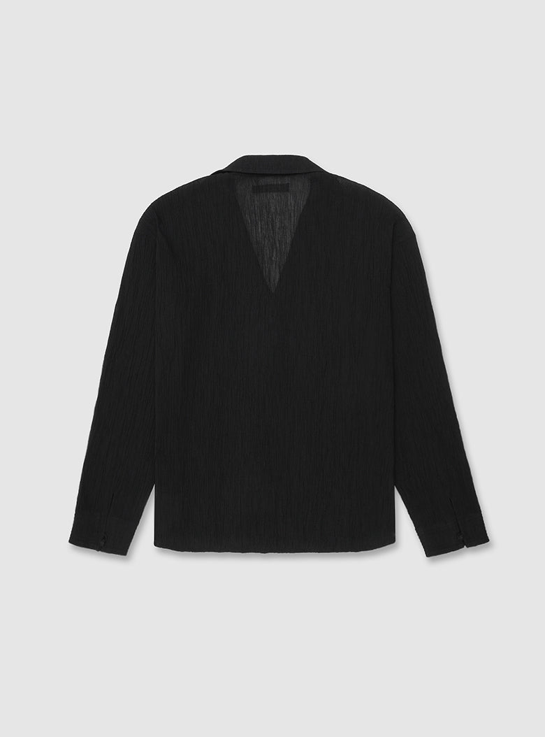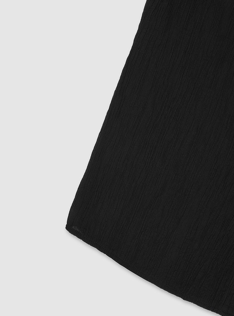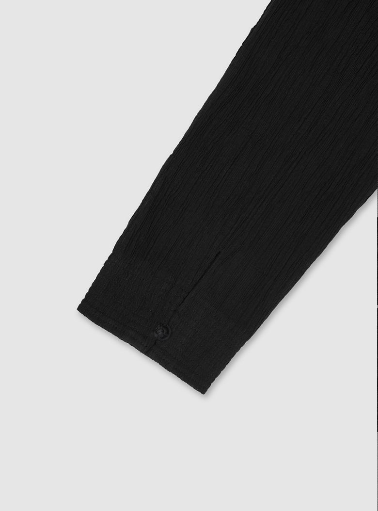 Crafted from a lightweight, semi-sheer cotton with fine vertical ripples, the Ripple Blouse flows with soft structure and quiet elegance. The pleated texture lends a subtle dressiness, while the all-black finish keeps the mood effortlessly chic.