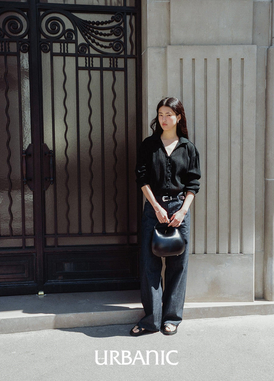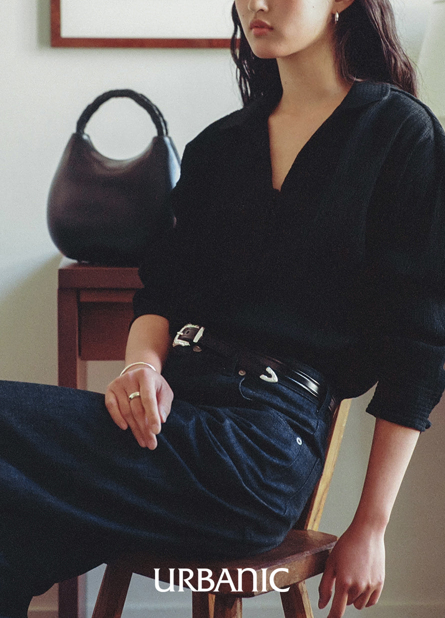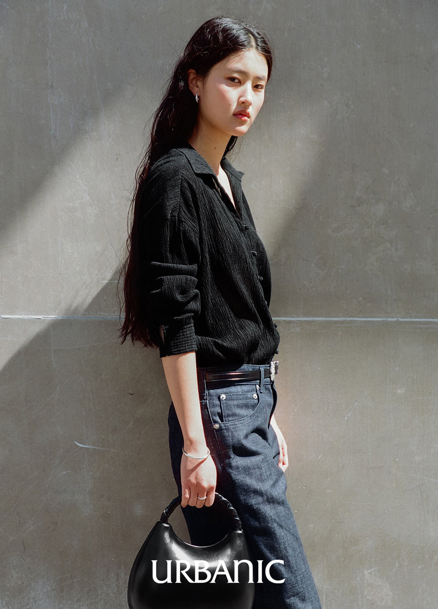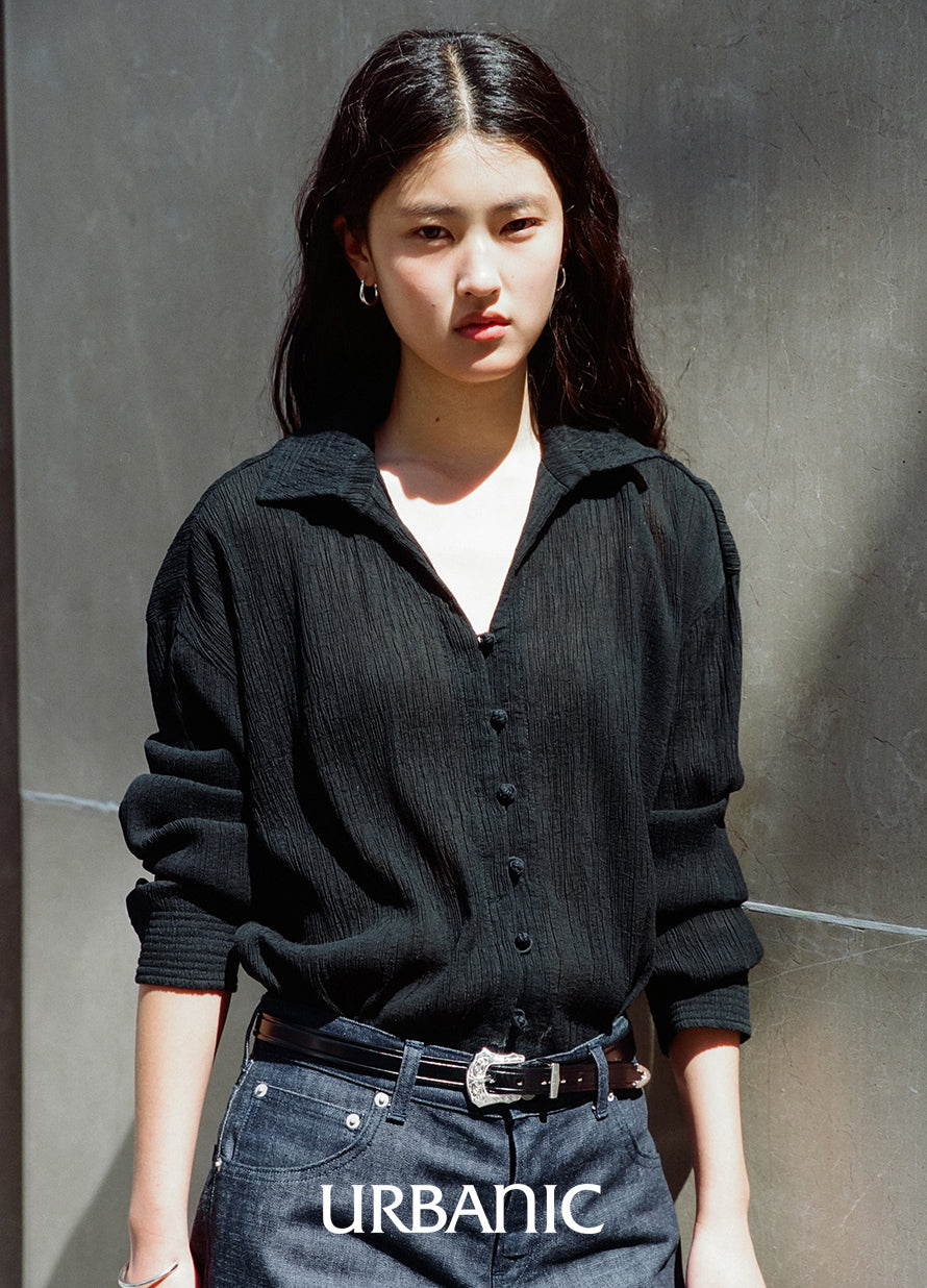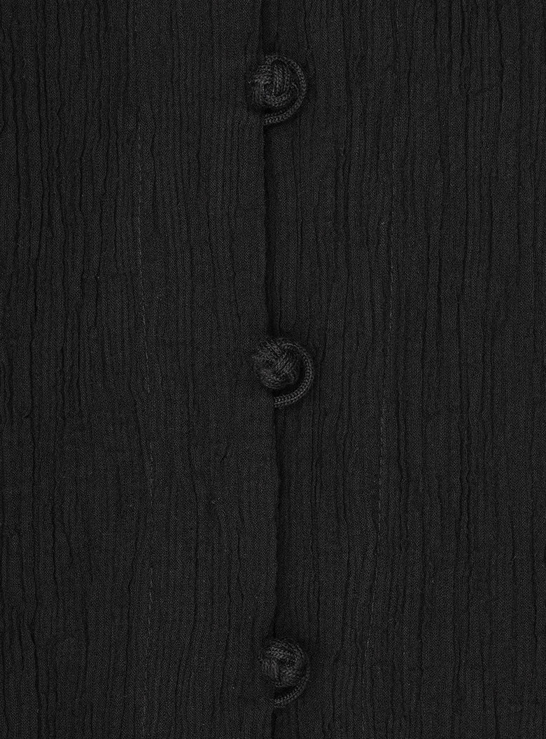Crafted from a lightweight, semi-sheer cotton with fine vertical ripples, the Ripple Blouse flows with soft structure and quiet elegance. The pleated texture lends a subtle dressiness, while the all-black finish keeps the mood effortlessly chic.