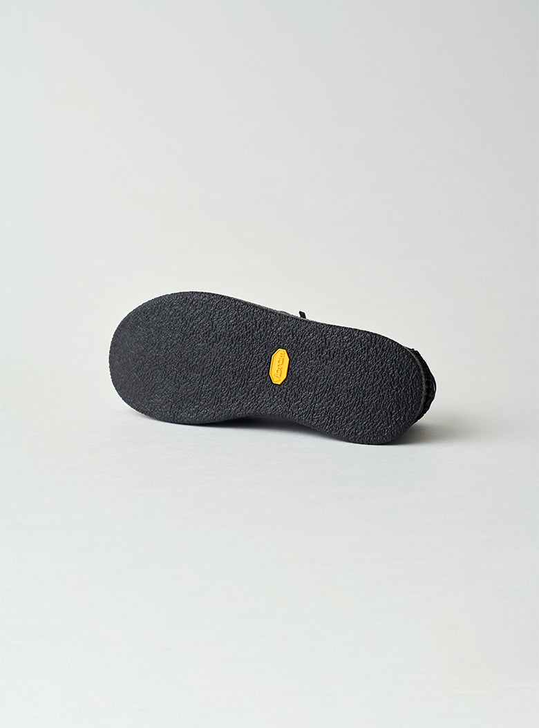 The Rustic Moccasin draws inspiration from the traditional footwear of North American Natives. Staying true to the classic moccasin silhouette, it is enhanced with a functional Vibram crepe outsole for everyday practicality and crafted from black oil-pullup cowhide leather.