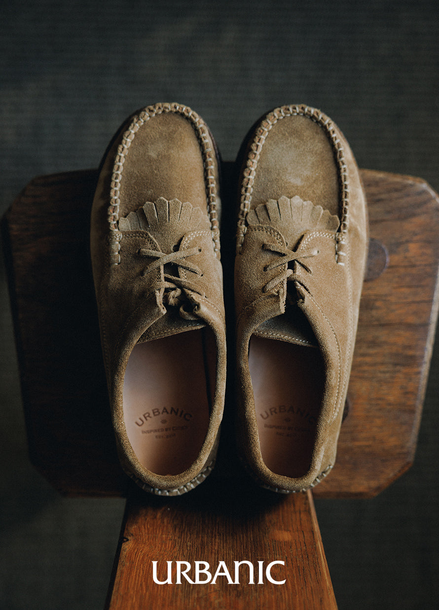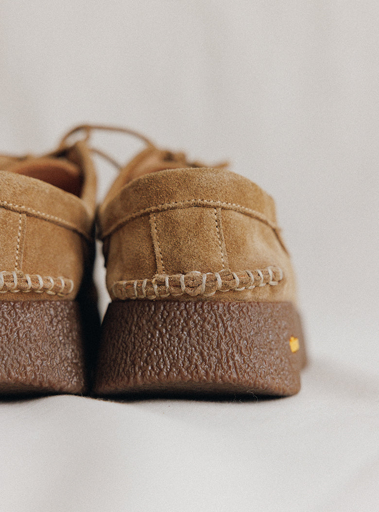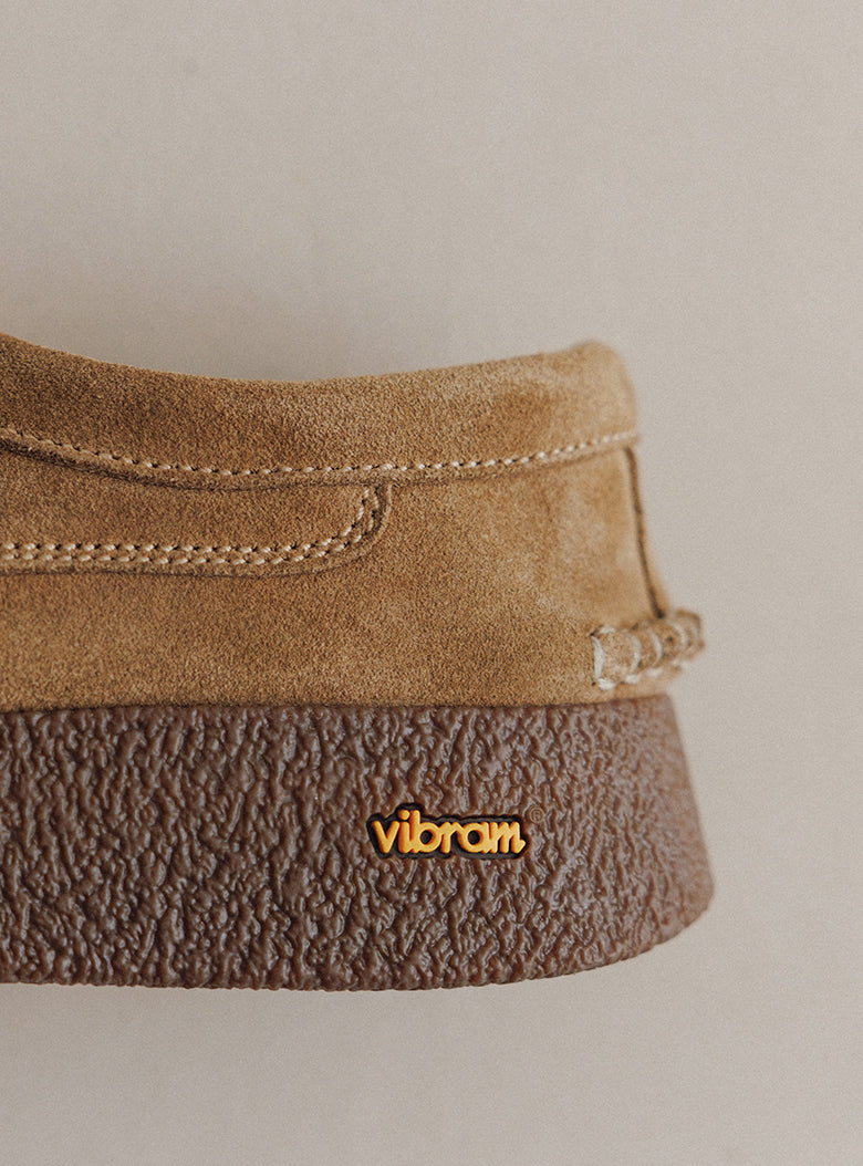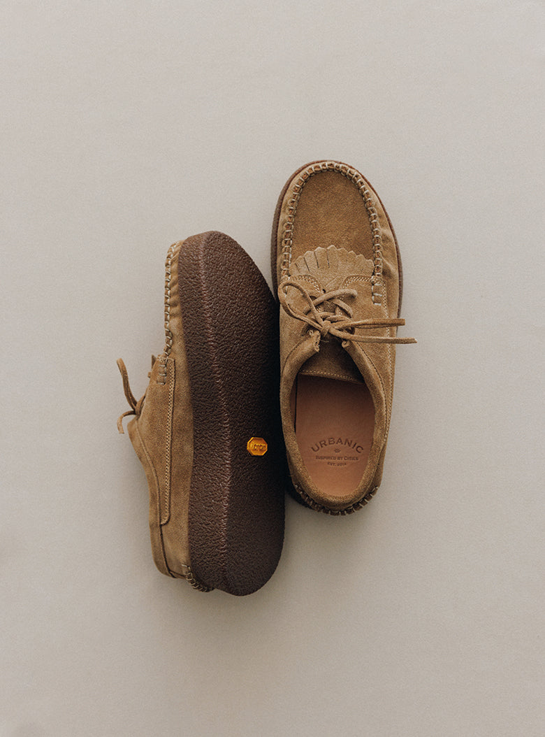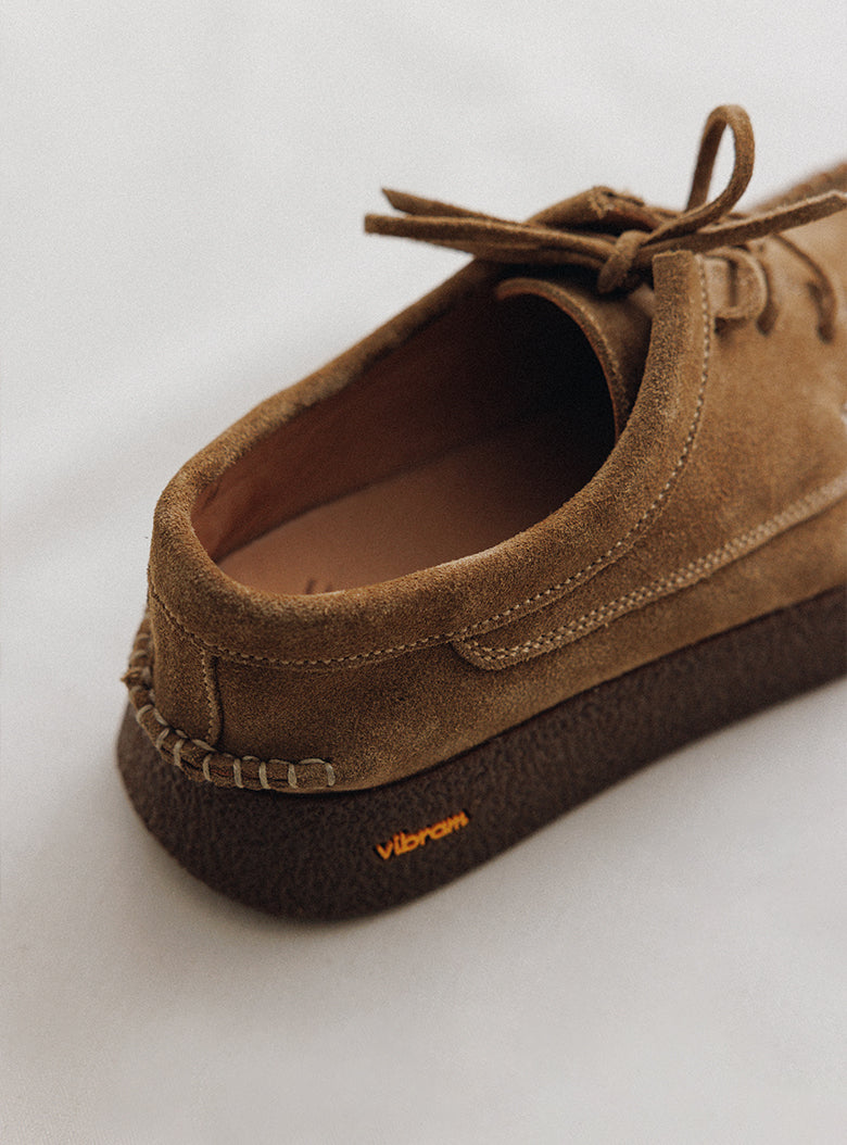 Inspired by the traditional leather footwear of Native North Americans, the Rustic Moccasin blends heritage form with modern function. Built on a classic moccasin silhouette, it features a Vibram crepe outsole for lightweight durability and everyday comfort. Crafted from camel-colored split cowhide, its warm tone and raw texture add a rustic, grounded character—versatile enough for both city streets and quiet escapes.